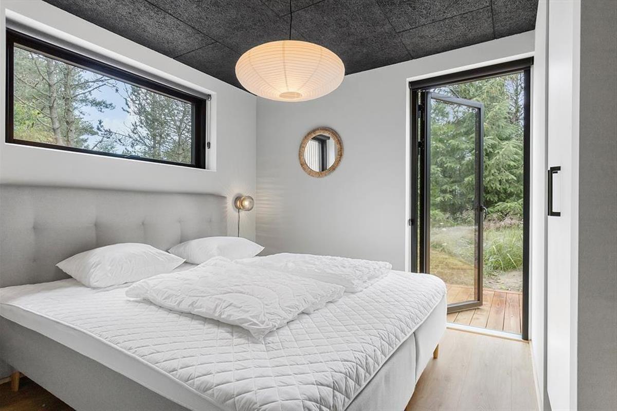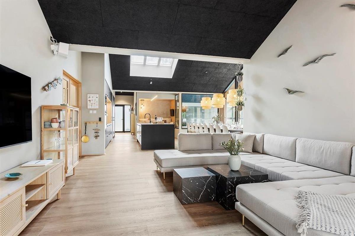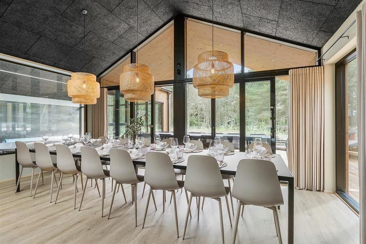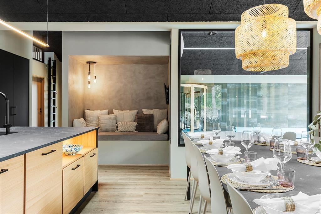 Das Ferienhaus liegt auf einem großen, von Bäumen umgebenen Naturgrundstück am Ende einer Sackgasse. Ringsum geht es überaus friedvoll und ruhig zu. Die großen Fenster lassen das Hausinnere förmlich mit der Natur ringsum verschmelzen. Die Räume bestechen mit hohen Decken und einer hellen Einrichtung in eleganten Farbtönen, woraus eine gemütliche, entspannte Wohnatmosphäre resultiert. Zahlreiche tolle Details und ausgewählte Annehmlichkeiten maximieren das schöne Urlaubserlebnis für Groß und Klein. Du darfst dich mit deinen Lieben auf angenehme Nächte in fünf Schlafräumen und auf zwei Schlafböden freuen, auf vergnügte Tischtennis- und Billardrunden im Aktivitätsraum sowie auf gesellige Essen mit musikalischer Unterhaltung durch die SONOS-Anlage im großen Aufenthaltsraum. In der Schlafnische des Wohnraums ist ein Fernseher platziert, der zu gemütlichen Stunden mit spannenden Filmen einlädt. Pure Entspannung und Erholung garantiert der große Wellnessbereich, der mit einem Salzwasserpool, einer Sauna und einem Whirlpool zu begeistern weiß.
