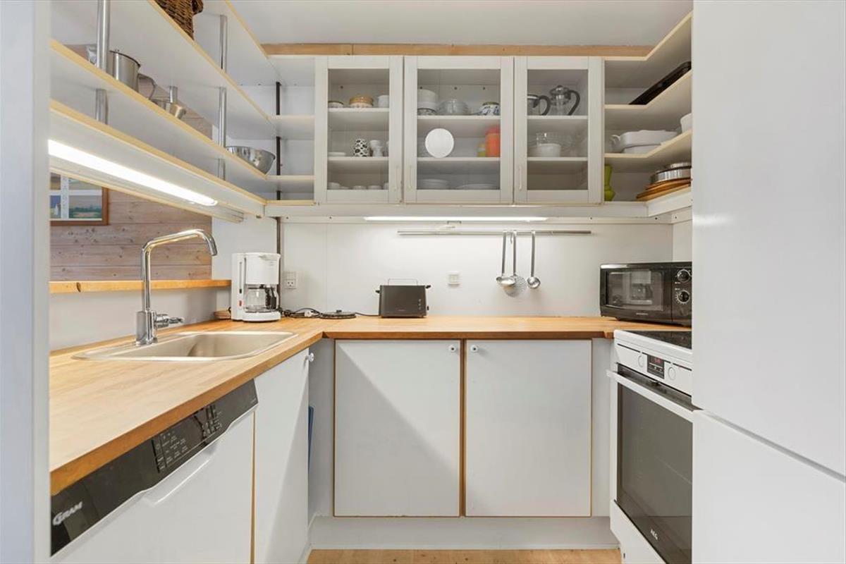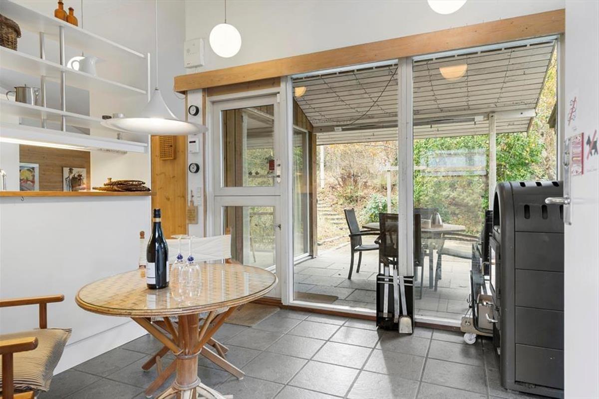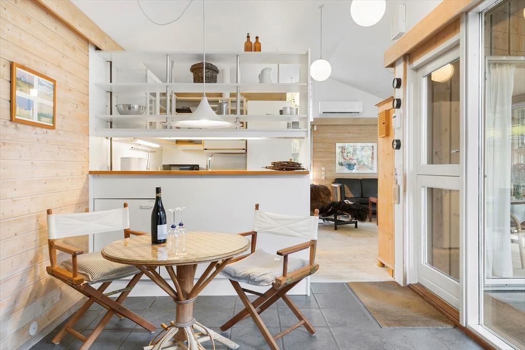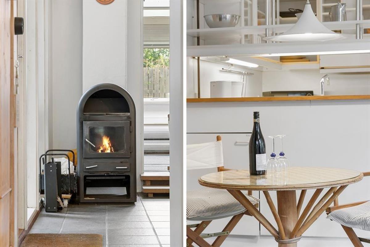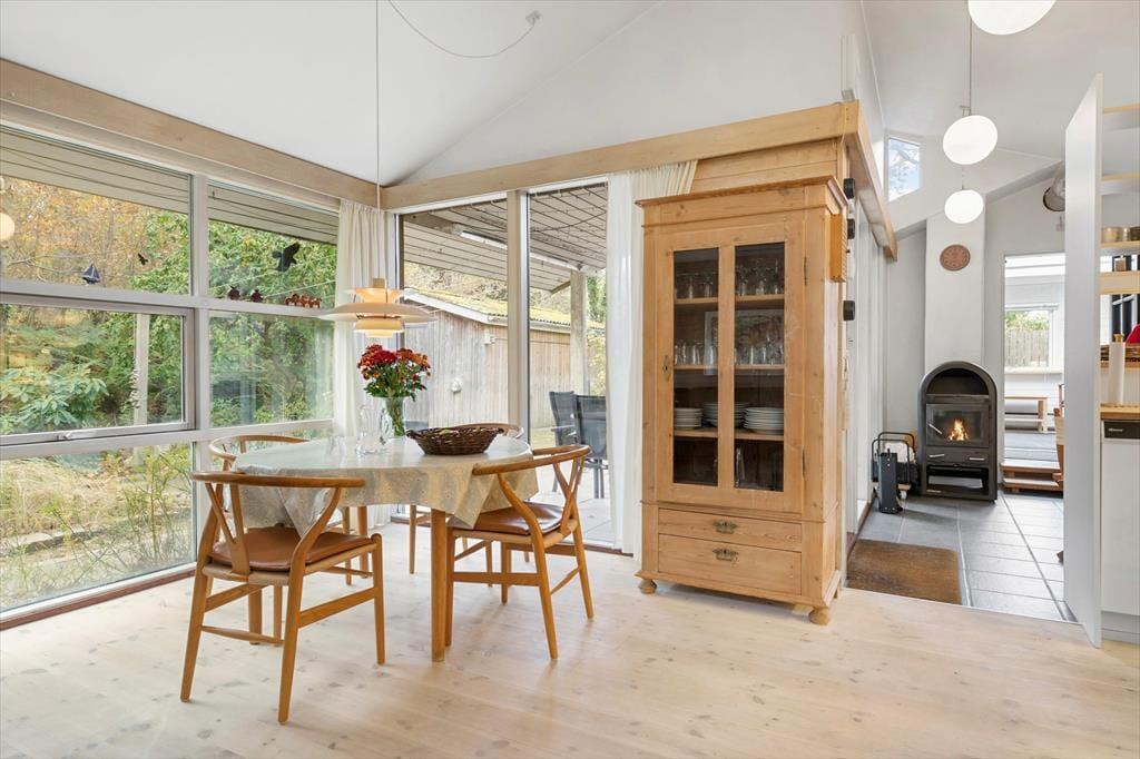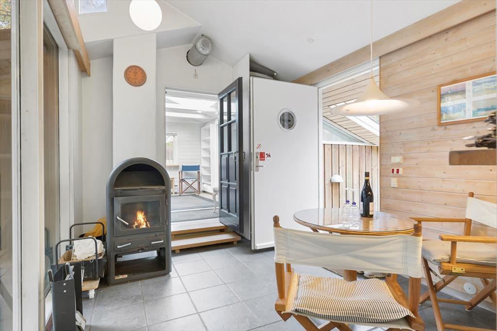 Das Ferienhaus empfängt dich mit einer warmen und einladenden Atmosphäre. Der gemütliche Küchenbereich mit Kaminofen wird schnell zum natürlichen Treffpunkt, wo du die Urlaubsmahlzeiten und gute Gespräche genießen kannst, während die Wärme des Ofens eine entspannte Stimmung schafft. Das Wohnzimmer ist mit bequemen Möbeln und großen Fenstern ausgestattet, die einen schönen Blick auf das grüne Umfeld bieten und die Natur auch drinnen erlebbar machen. Hier ist viel Platz zum Entspannen, und das Ferienhaus strahlt einen entspannten Charme aus, der dazu einlädt, einfach da zu bleiben.
