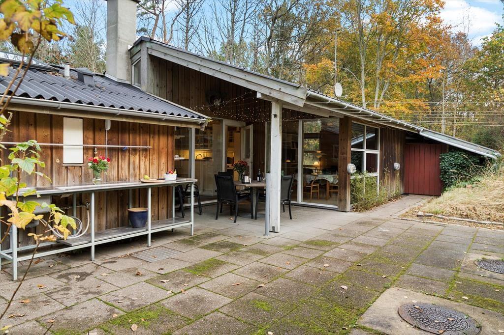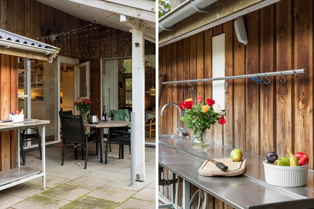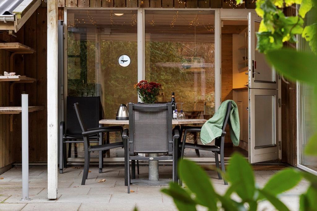 Die Terrasse vor dem Ferienhaus lädt zu langen Sommertagen in der Sonne und zu Abenden mit Grill und Gemütlichkeit ein. Die gemütliche Terrasse ist mit komfortablen Sitzplätzen ausgestattet und von grünen Bäumen umgeben, die eine abgeschirmte und ruhige Außenatmosphäre schaffen. Hier kannst du den Tag mit einem Kaffee beginnen, während die Vögel in den Baumkronen singen, oder eine stille Abendstunde genießen, wenn die Sonne über dem Wald untergeht.