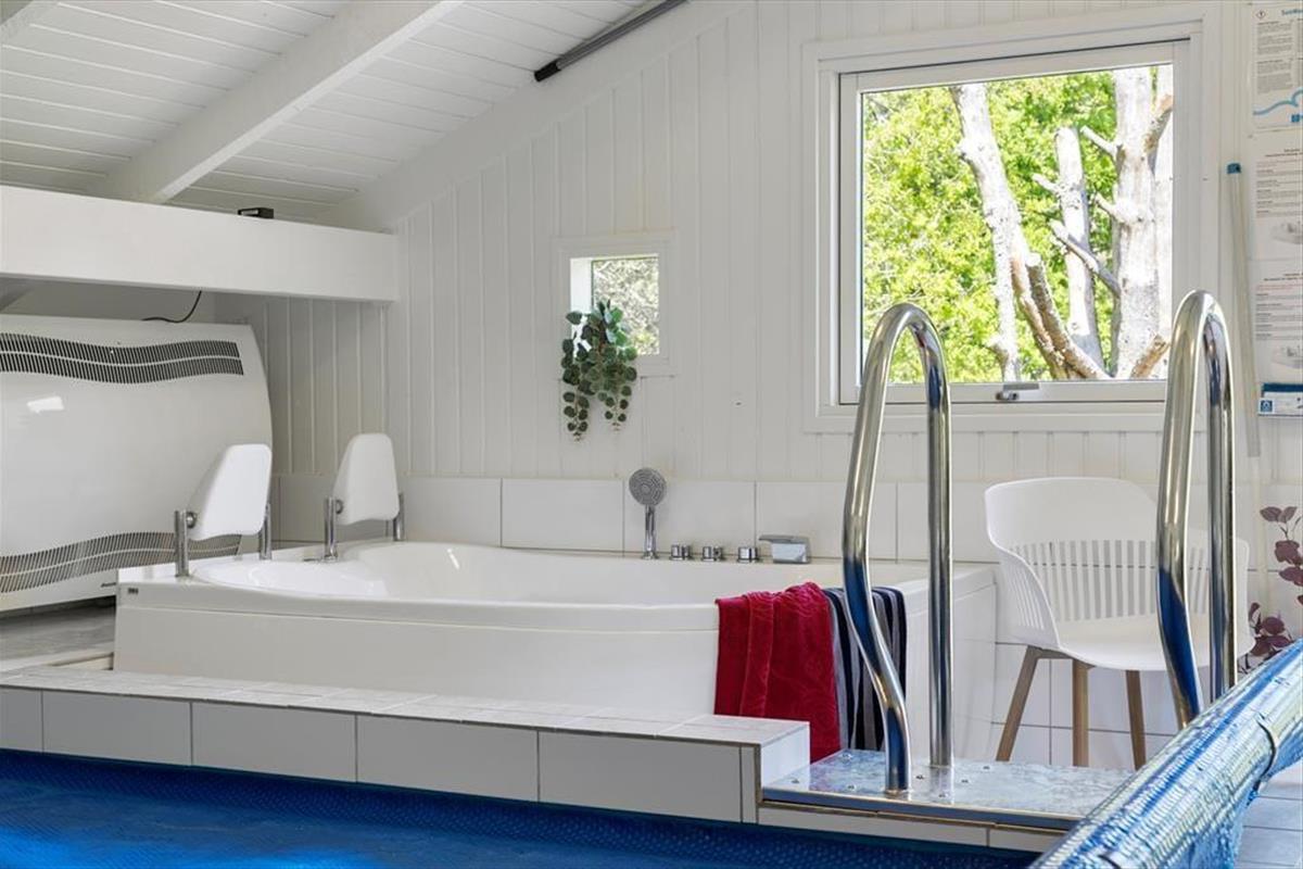 Das Ferienhaus ist hell, einladend und im charmanten nordischen Stil eingerichtet, der eine gemütliche Atmosphäre schafft. Das Herzstück des Hauses ist das großzügige Wohnzimmer, in dem große Fensterpartien die Natur ganz nah heranholen. Hier können Sie es sich auf dem Sofa gemütlich machen, mit der Familie Gesellschaftsspiele spielen oder ein gemeinsames Abendessen am Esstisch genießen. Falls das Wetter einmal nicht mitspielt, können Sie sich vor dem Kamin aufwärmen oder in den hauseigenen Innenpool springen, der ganzjähriges Badevergnügen garantiert. Nach einem langen Tag in der Natur können Sie sich in der Whirlwanne entspannen oder sich in der Sauna aufwärmen – der perfekte Abschluss für einen erholsamen Urlaub.