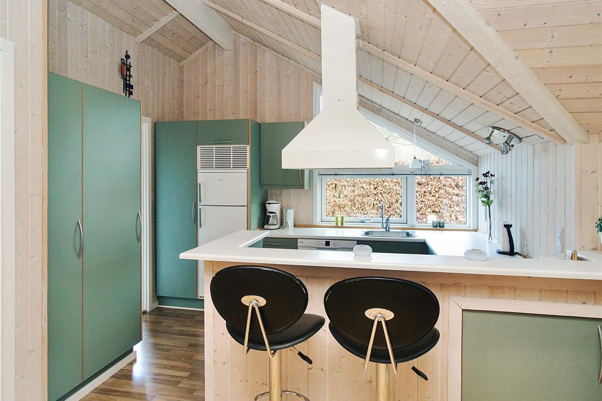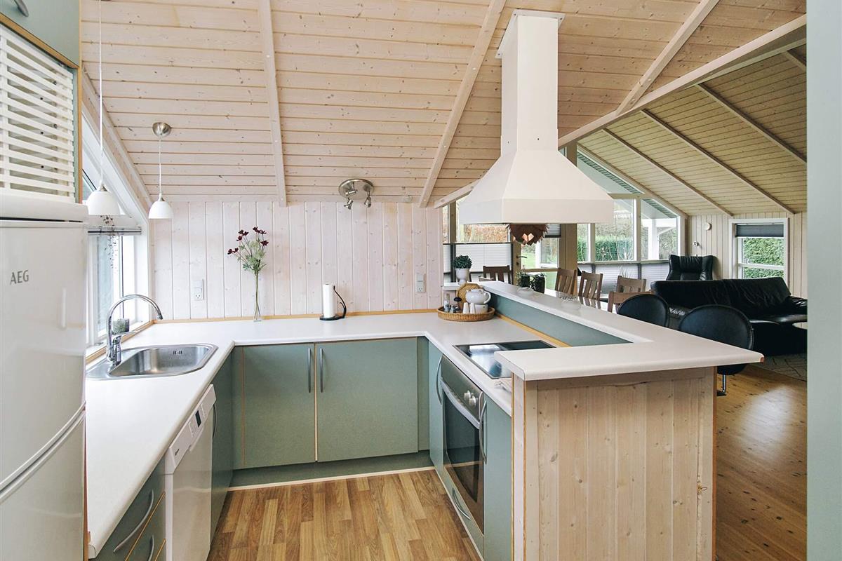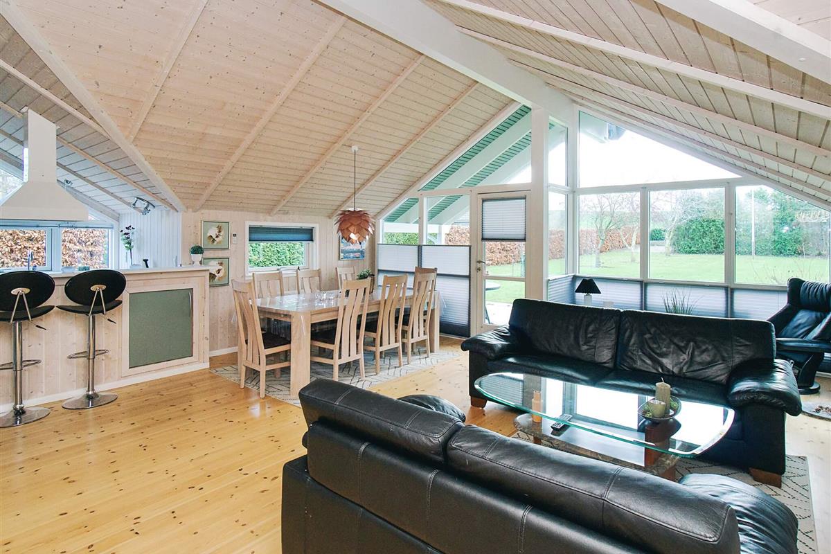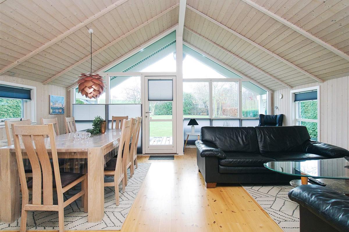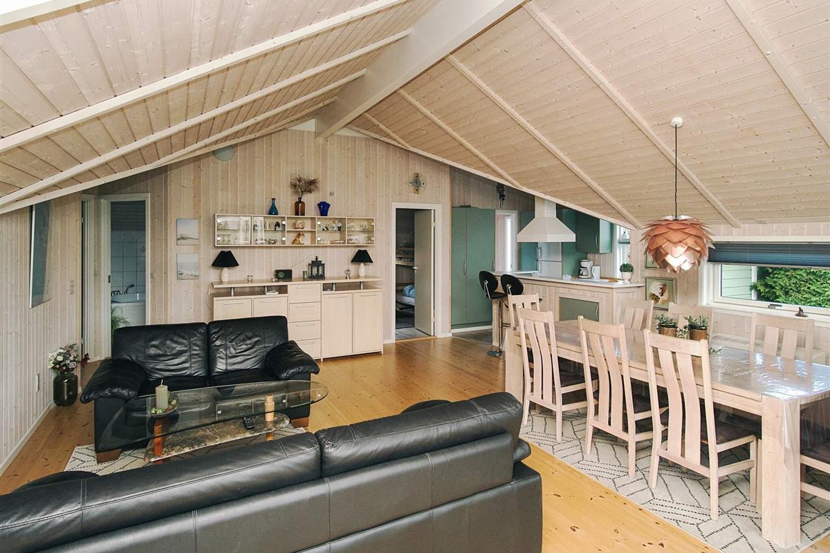 Ferienhaus mit Whirlpool, gelegen auf einem Naturgrundstück nur ca. 200 m vom Meer bei Dalby Strand entfernt. Zum Haus gehören offene und überdachte Terrassenflächen mit Gartenmöbeln. Die Wände und Decken sind mit hellem Holz verkleidet. Große Fenster im Wohnraum lassen viel Tageslicht herein. Es gibt Holzfußböden, teils mit losen Teppichen. Bad mit Fußbodenheizung, Whirlpool und Dusche. Die Küche ist modern und gut ausgestattet und offen im Wohnraum integriert. Zur Ausstattung zählen u.a. Gefrierschrank, Spülmaschine, Mikrowelle, Warmluftofen, Ceranfeldherd, Klimaanlage, TV, Video, Stereoanlage und CD-Player. In der Waschküche steht eine Waschmaschine bereit.