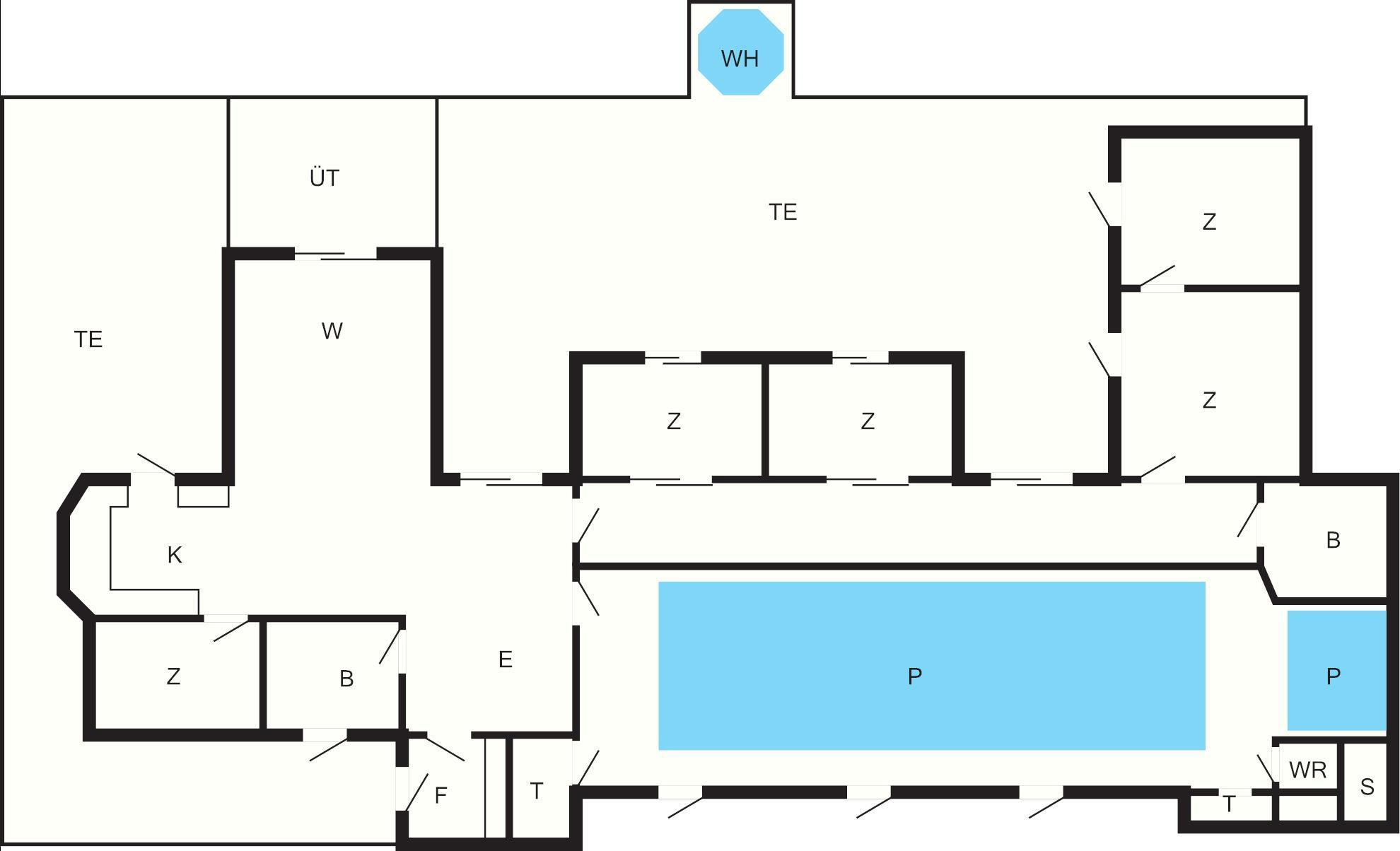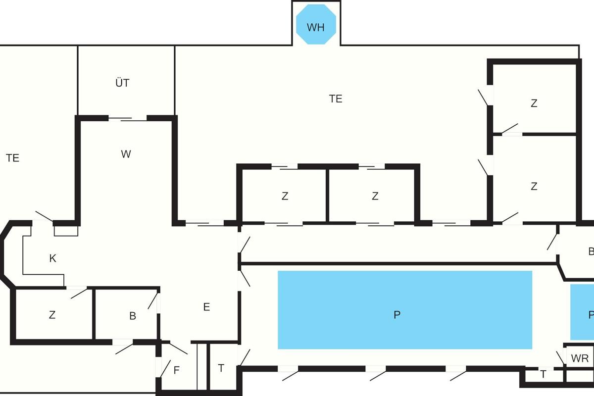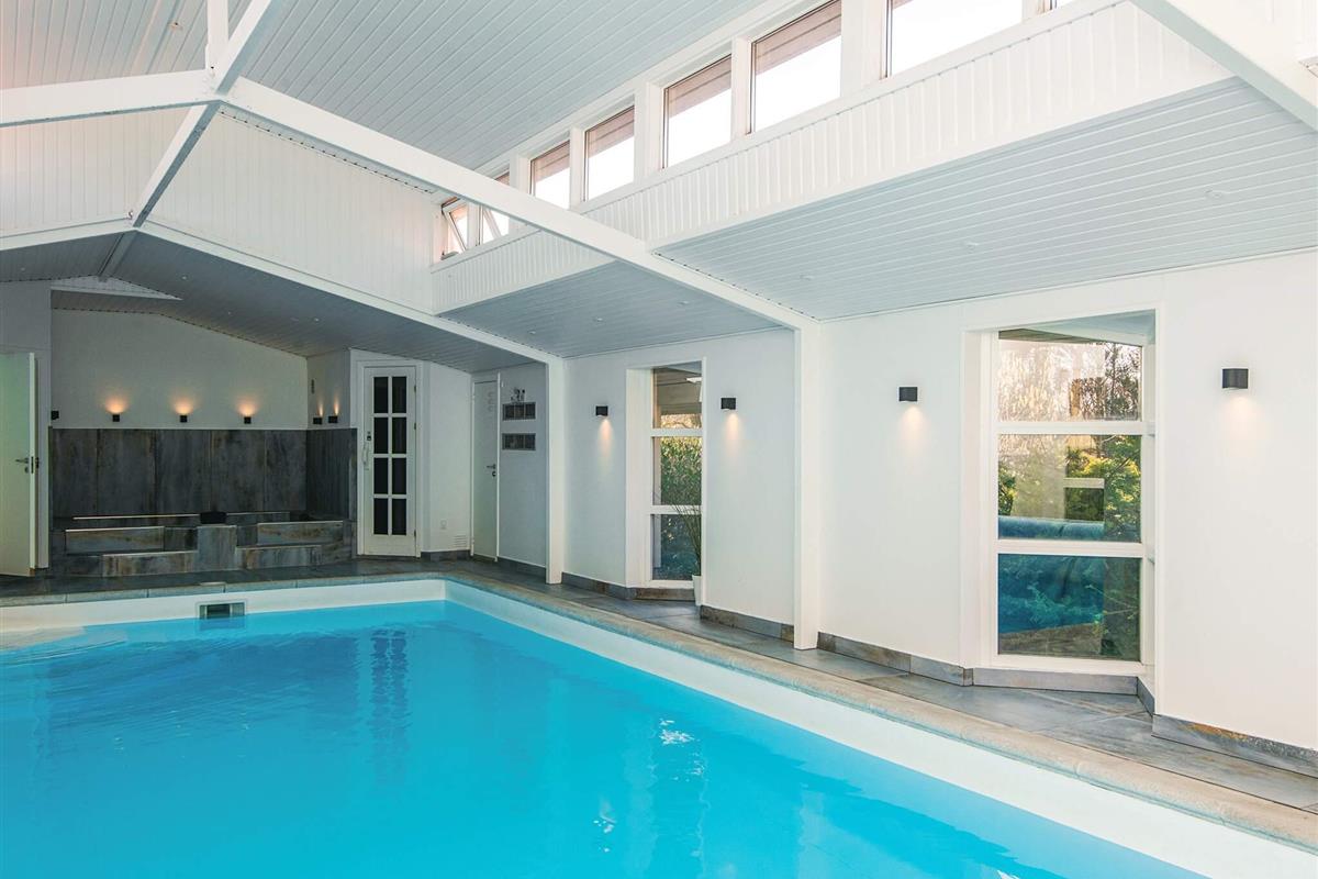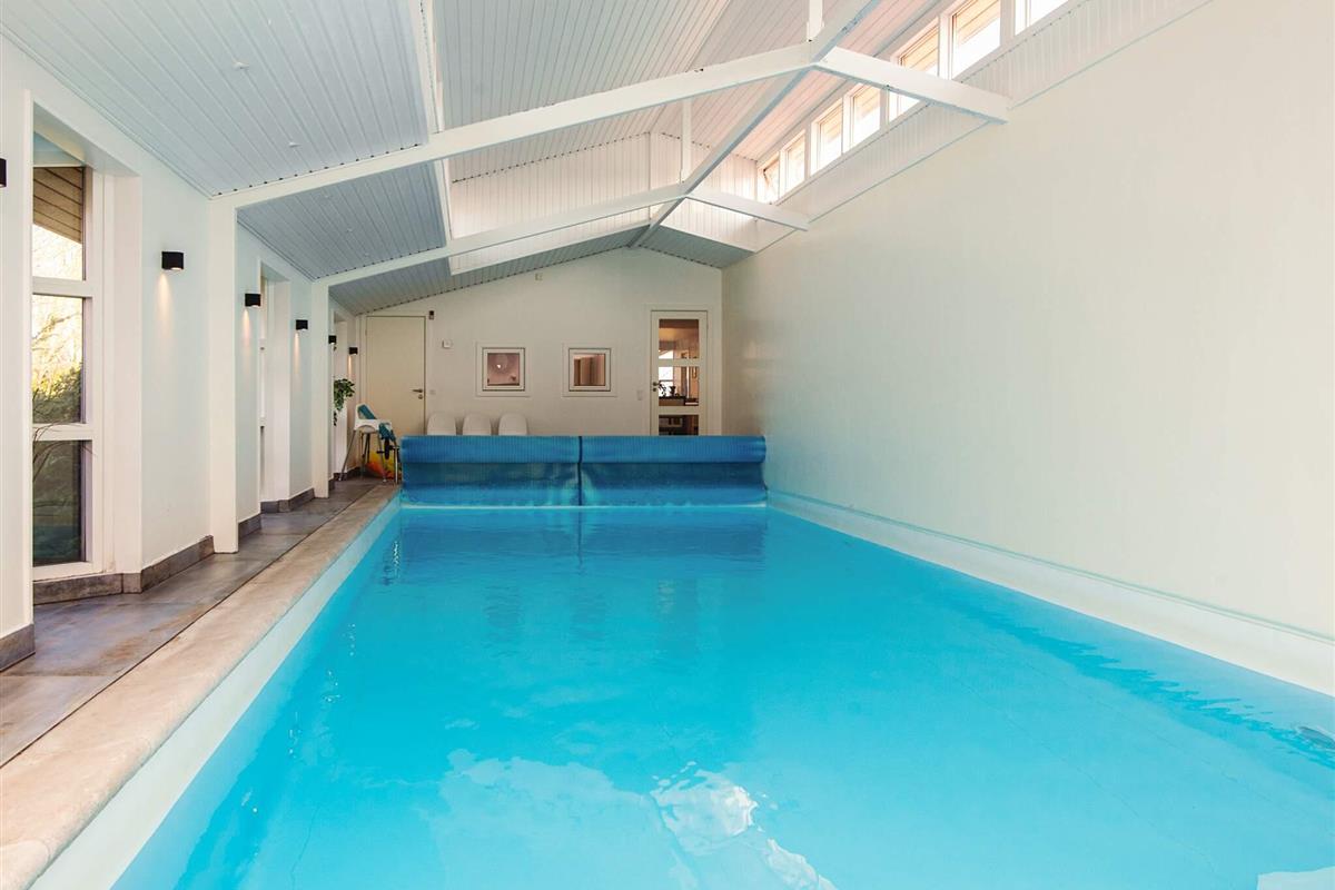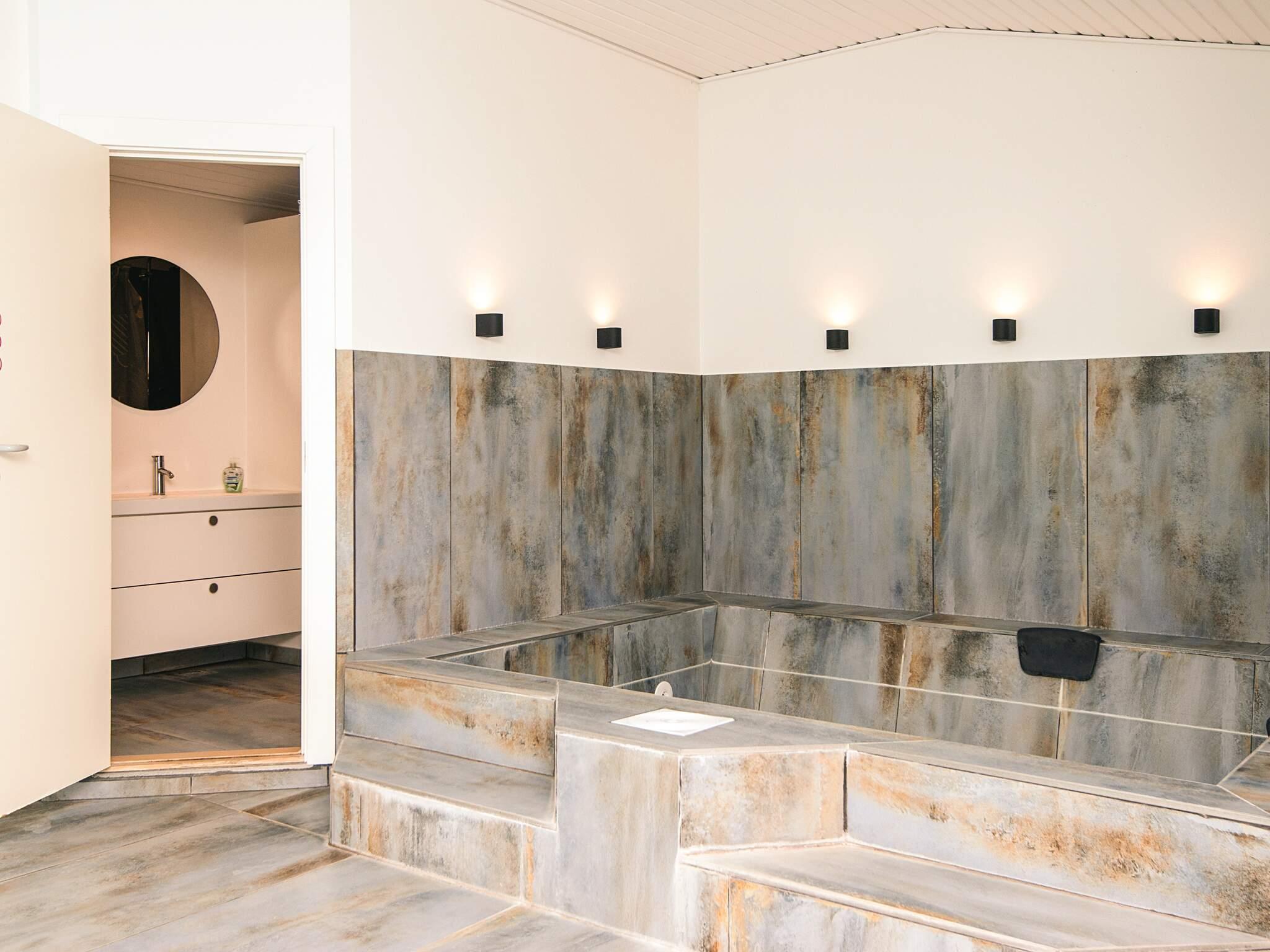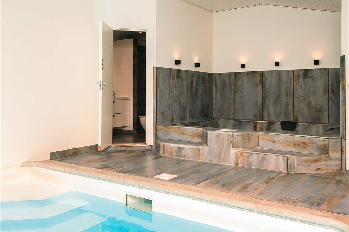 Der Poolbereich des Hauses ist ein Kapitel für sich. Hier können sich alle Generationen vergnügen und stundenlang Spaß haben. Der Pool ist 40 m² groß und 150 cm tief. Zusätzlich gibt es ein Wellness-/Kinderbecken mit einer Tiefe von 35 cm und einer angenehmen Wassertemperatur von 33 Grad Celsius, in dem alle, insbesondere die Kleinen, planschen können. Der Whirlpool im Poolbereich ist ein sogenanntes Warmwasserbecken mit Düsen.