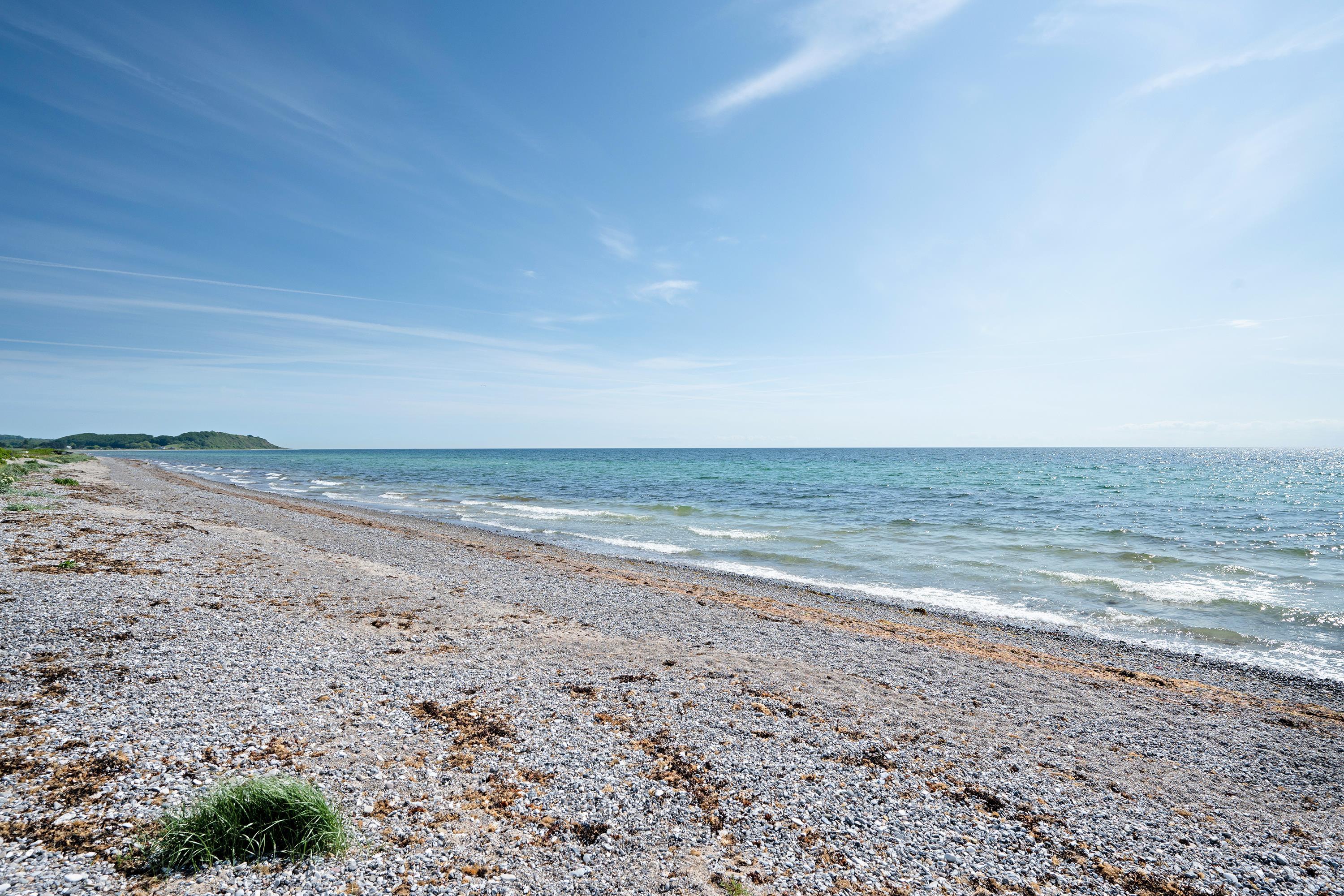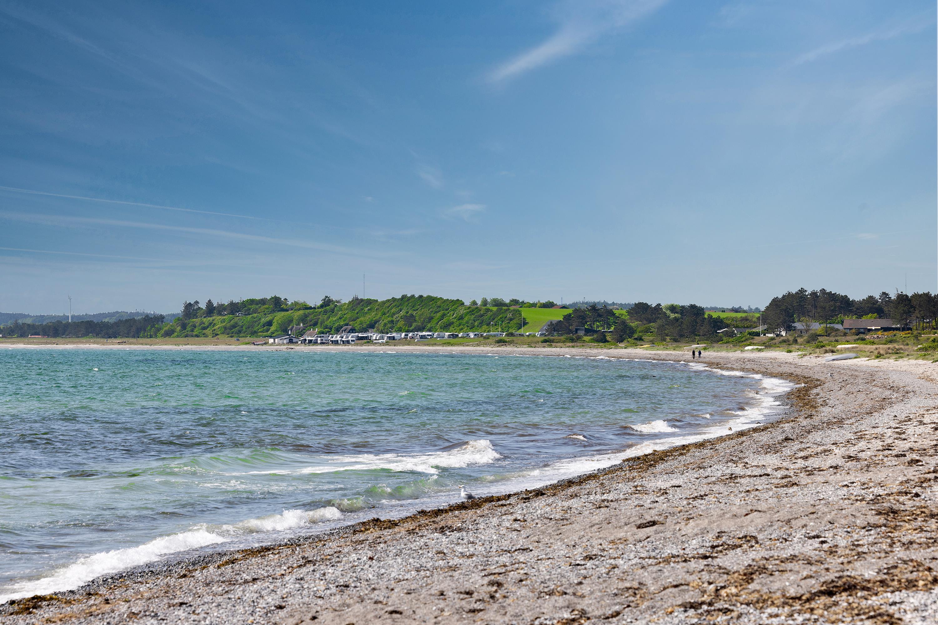 Holme/Dråby Beach is characterized by beautiful nature with views of the island Hjelm and the impressive cliff Jernhatten. It is a popular area for anglers, and it is easy to launch your own boat. Jernhatten rises 49 steep meters above sea level, and a walk along the Kattegat coast is a beautiful nature experience. The 266 ha cliff is protected, and there is a marked hiking trail