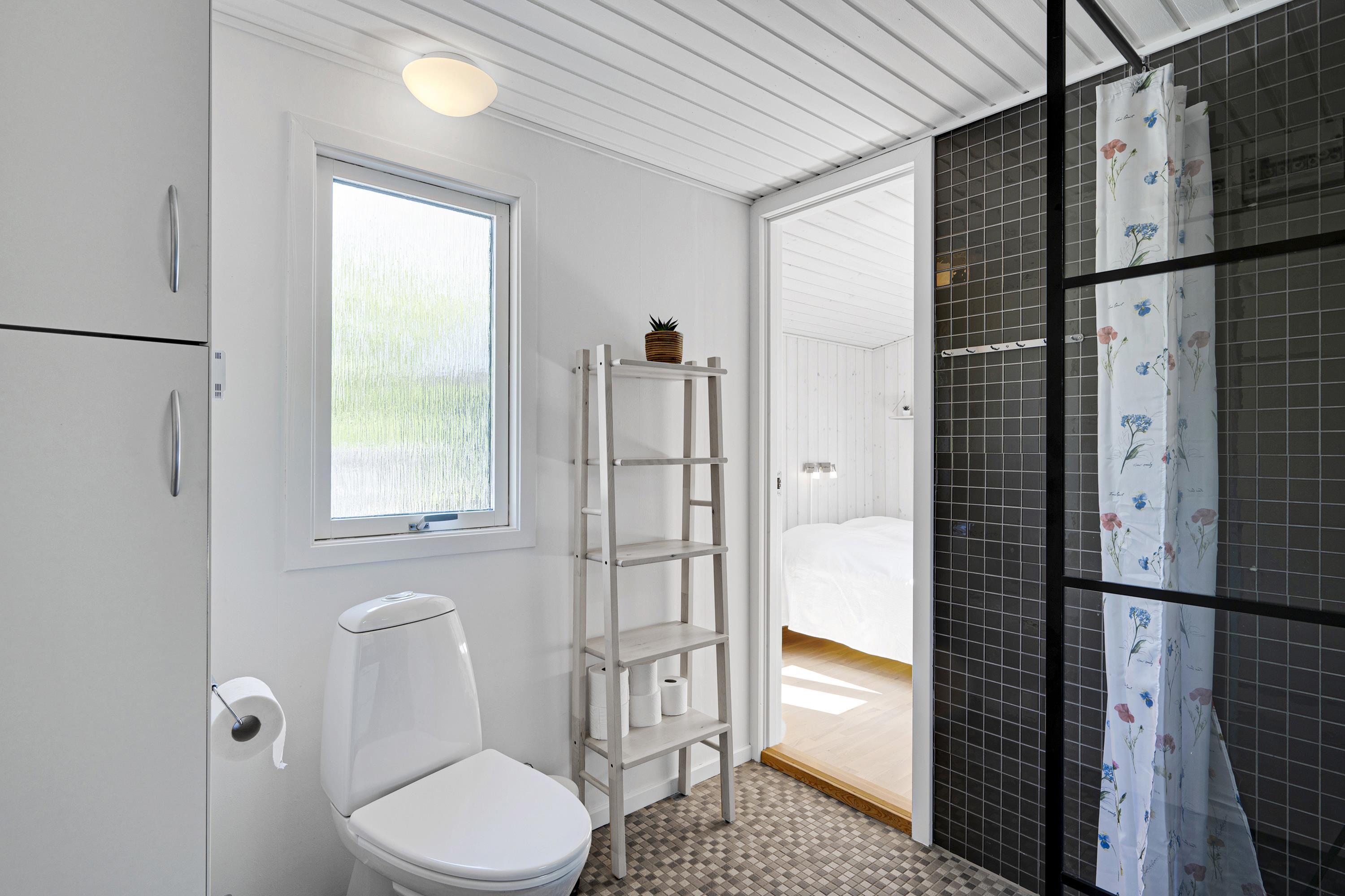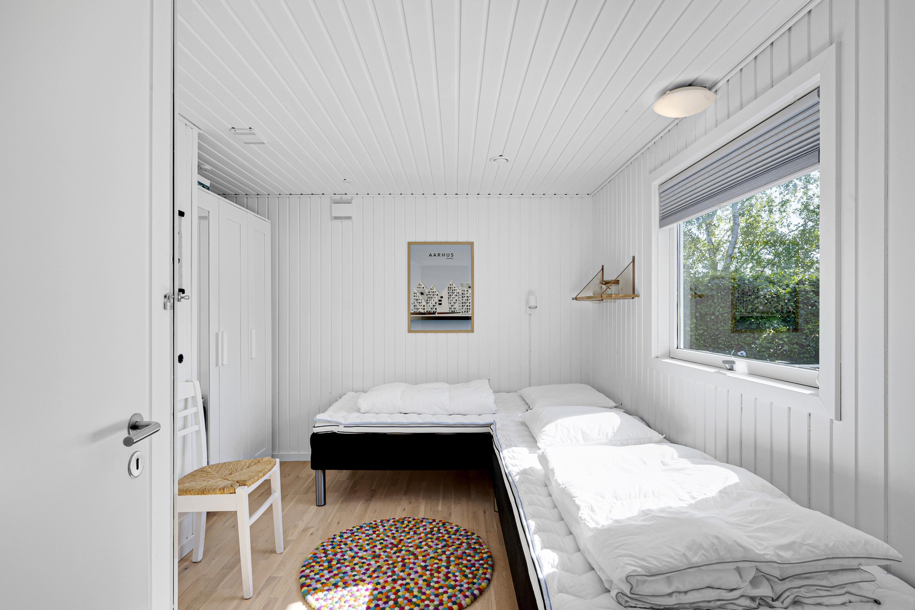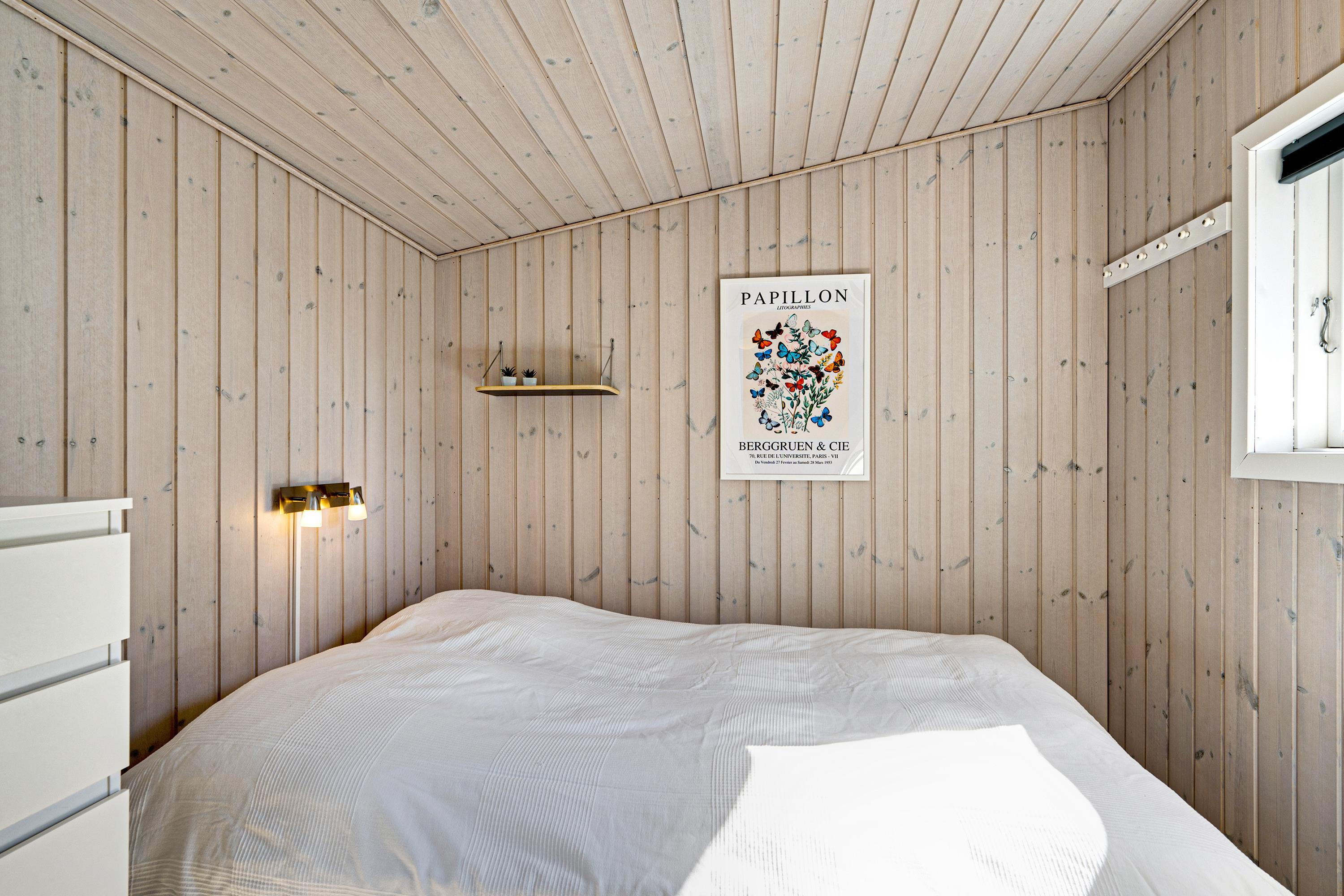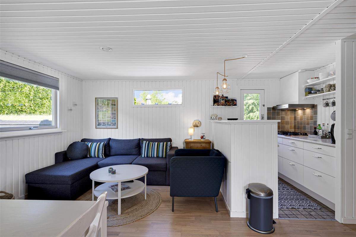 The combined living room/kitchen/dining area has access to the covered terrace and is bright and nicely furnished with dining space for 4 people, comfortable sofa corner, TV with Danish (including TV2) and German channels, and radio. The newer kitchen has a gas stove, fridge/freezer, and combination oven. The house's 4 sleeping places are distributed across 2 bright and spacious bedrooms: 1 with a double bed and access to the terrace, and 1 with 2 single beds. Neat, regular tile bathroom with underfloor heating and shower. Lockable utility room with washing machine. Internet access is available.