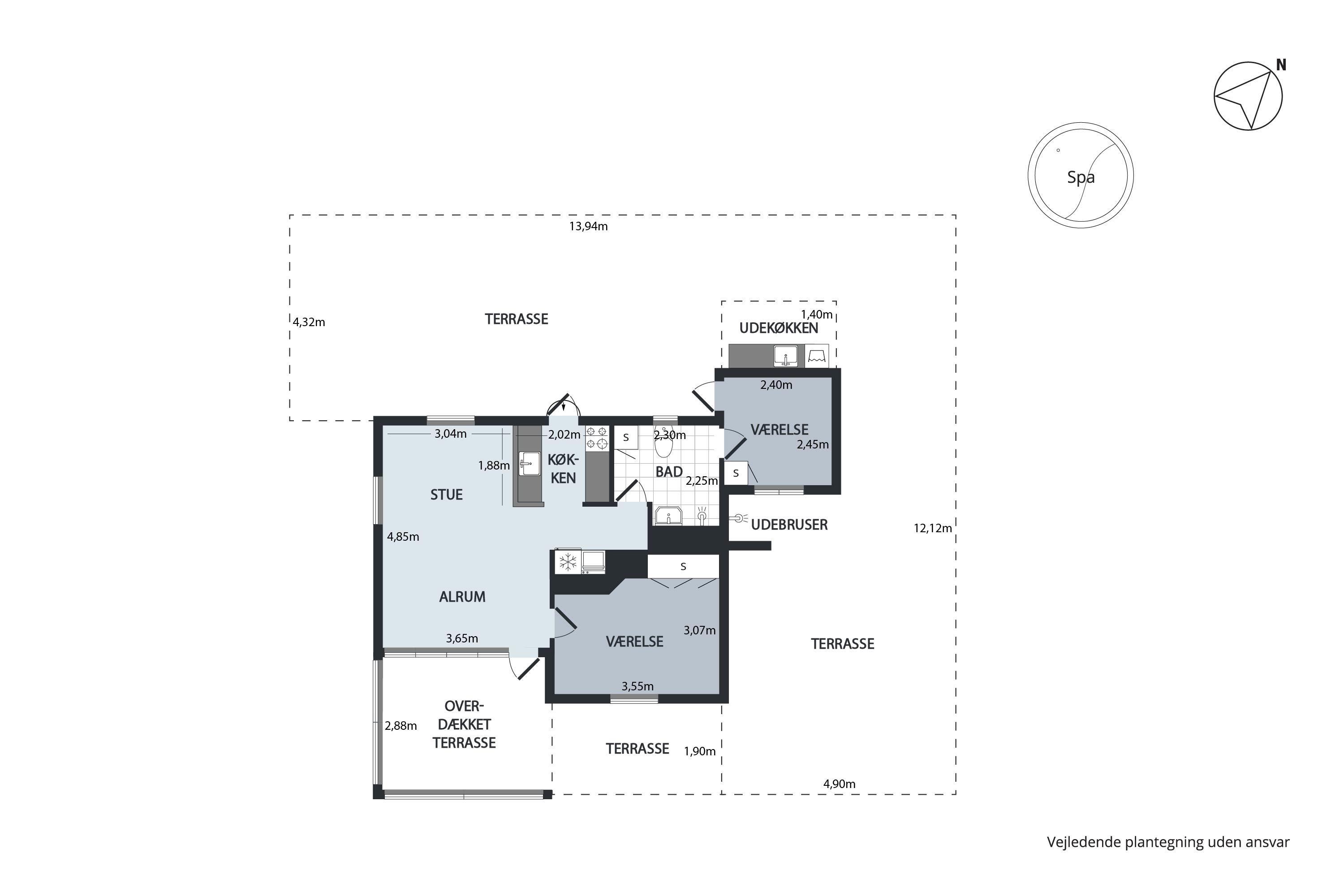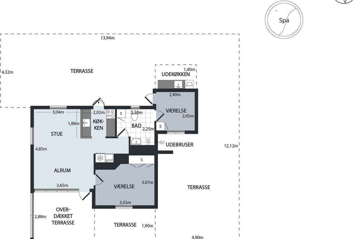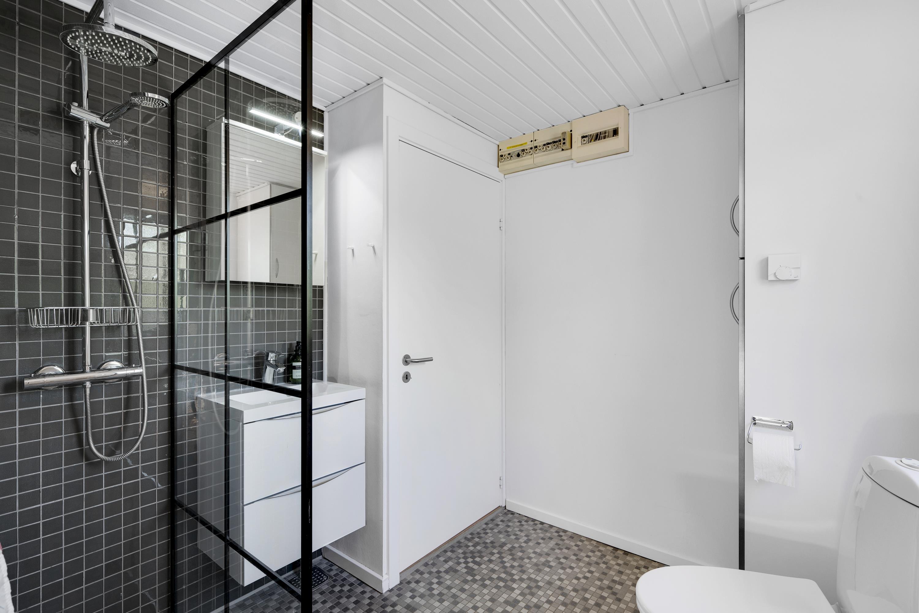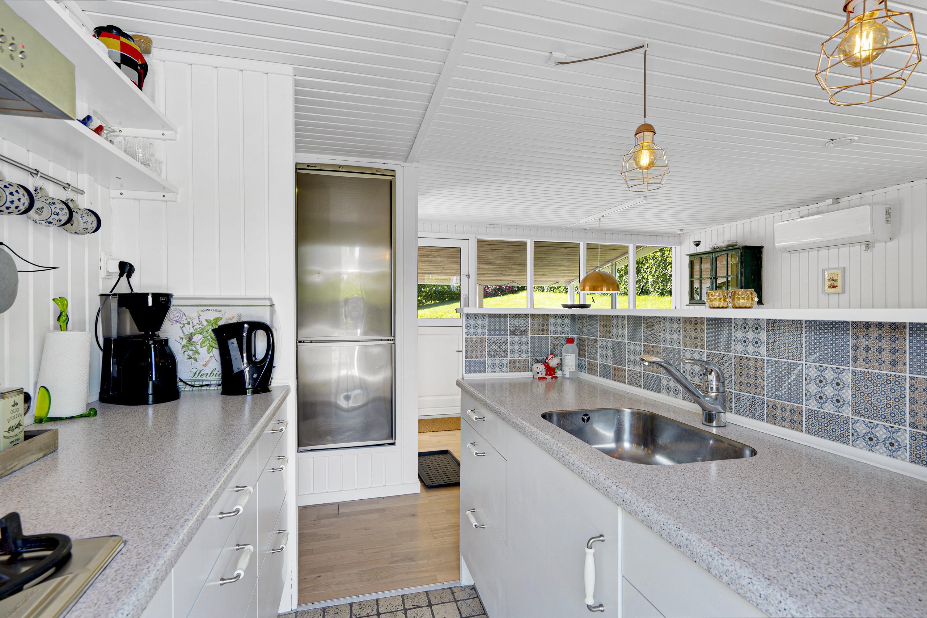 The combined living room/kitchen/dining area has access to the covered terrace and is bright and nicely furnished with dining space for 4 people, comfortable sofa corner, TV with Danish (including TV2) and German channels, and radio. The newer kitchen has a gas stove, fridge/freezer, and combination oven. The house's 4 sleeping places are distributed across 2 bright and spacious bedrooms: 1 with a double bed and access to the terrace, and 1 with 2 single beds. Neat, regular tile bathroom with underfloor heating and shower. Lockable utility room with washing machine. Internet access is available.