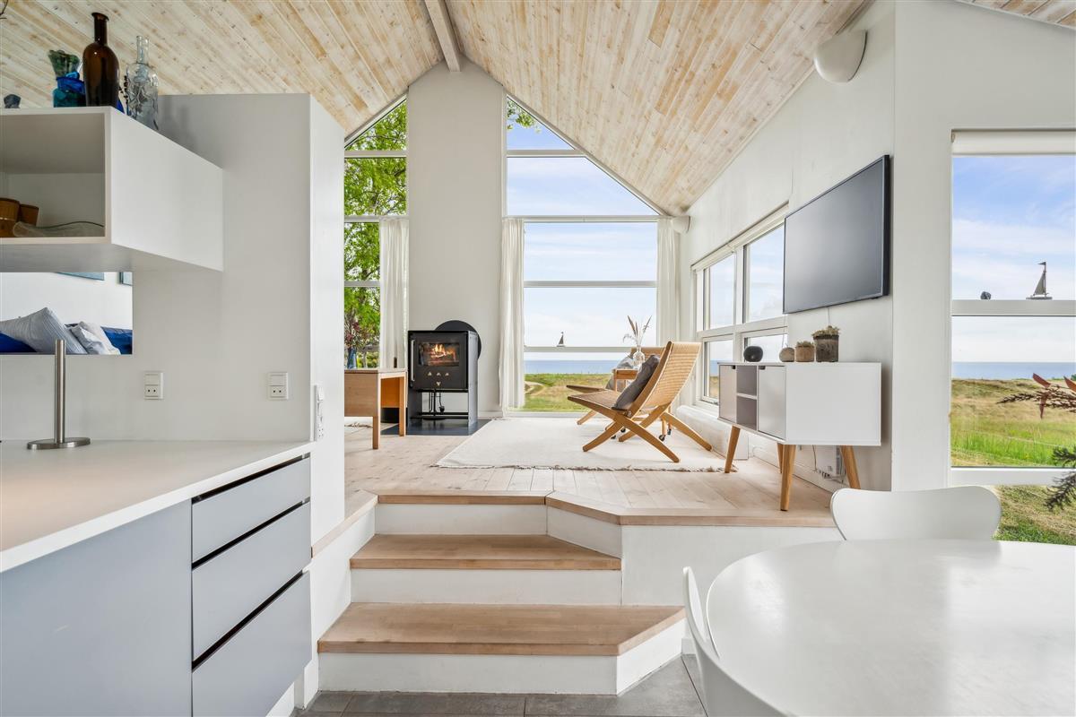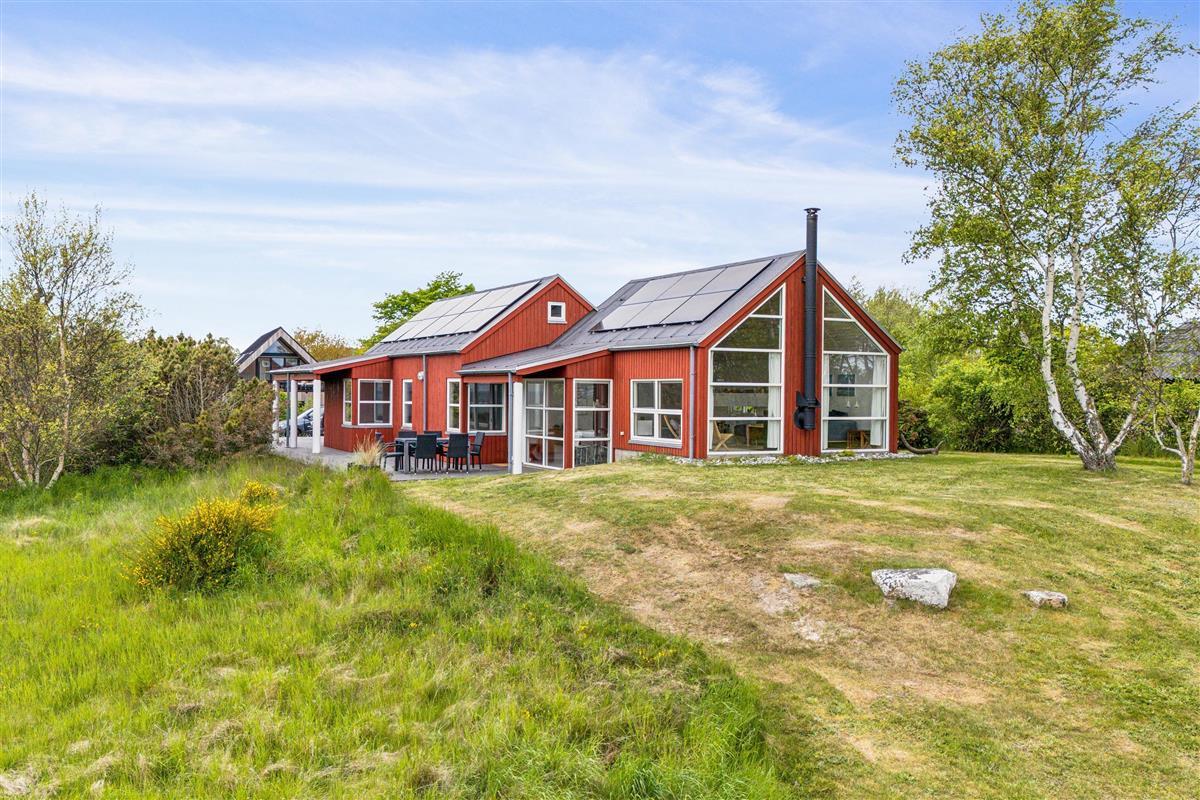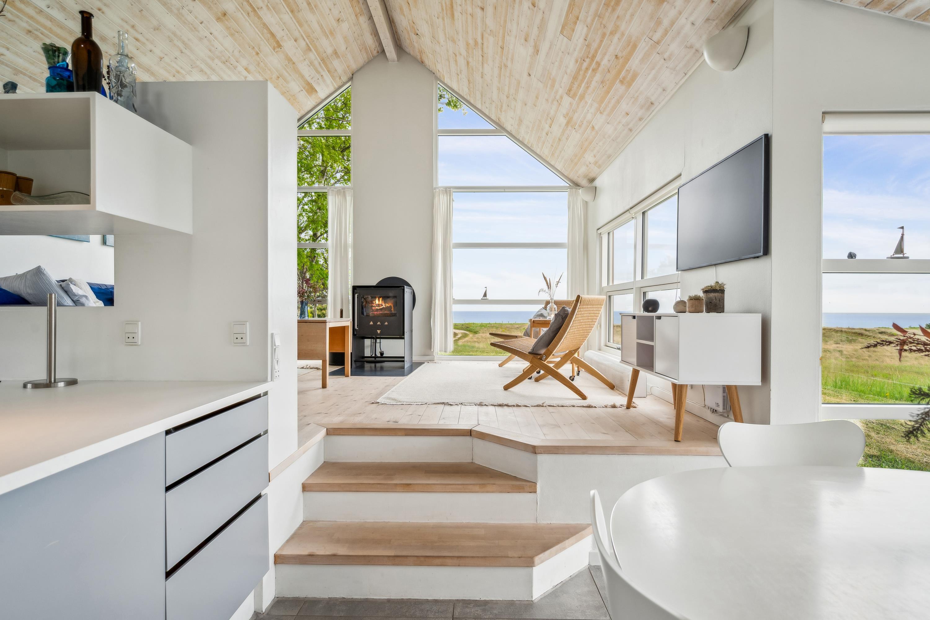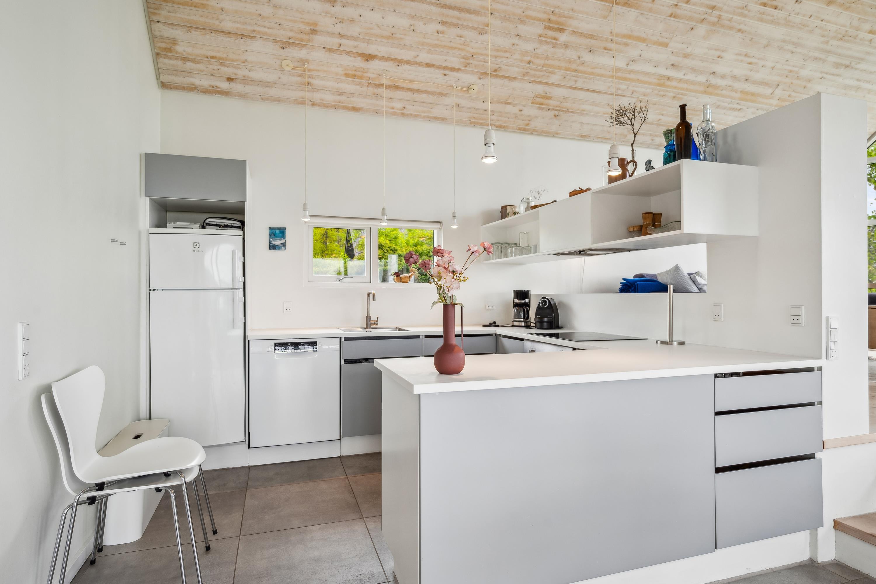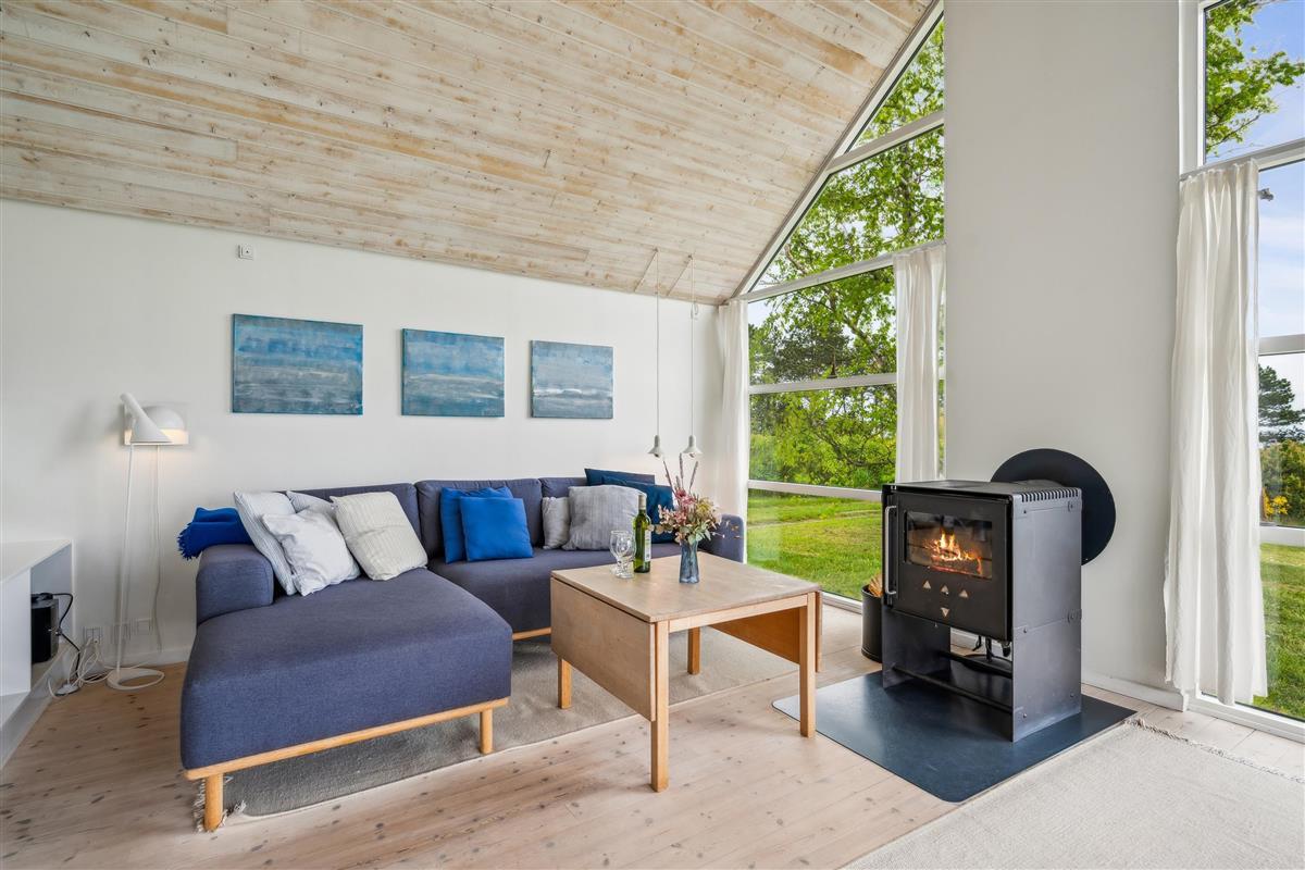 A truly delightful summer house located in the first row from the sea with panoramic views of the Kattegat on a secluded and spacious natural plot in undisturbed surroundings. Partially covered terrace with garden furniture and grill. The house is furnished with a bright, friendly, and tasteful décor on staggered levels with stairs from the kitchen to the living room. From the living room, there is a view of the sea. Cozy living room with wood-burning stove, satellite TV, and stereo system with CD. Lovely, spacious kitchen with ceramic stove, refrigerator with a small freezer, and dishwasher. Beautiful bathroom with shower, underfloor heating, sauna, and washing machine. The house's sleeping accommodations are distributed among 3 bedrooms: 2 with double beds and 1 with bunk beds. For the little holiday guests, a high chair is available. Note: The house has a charging station for electric cars.