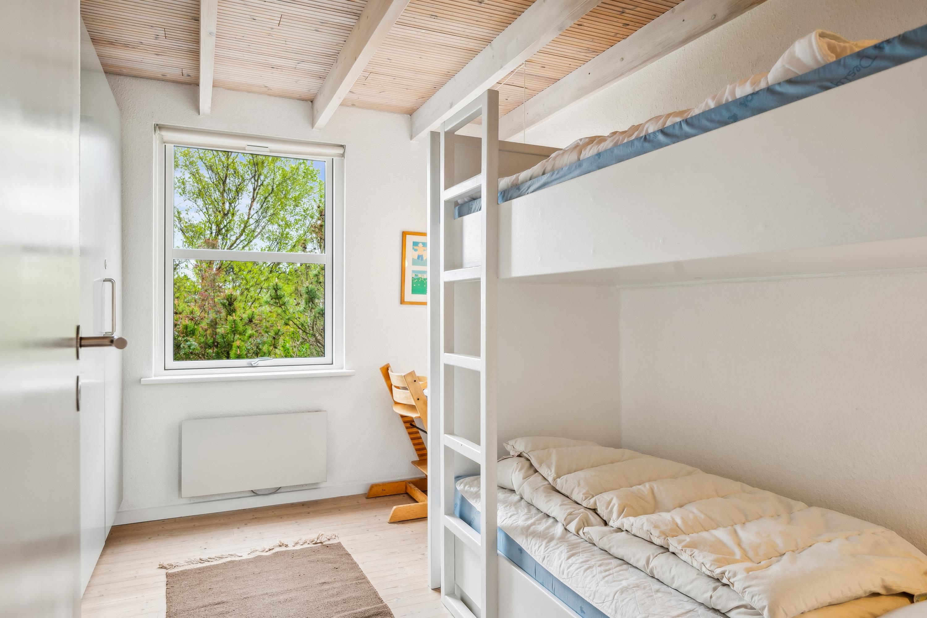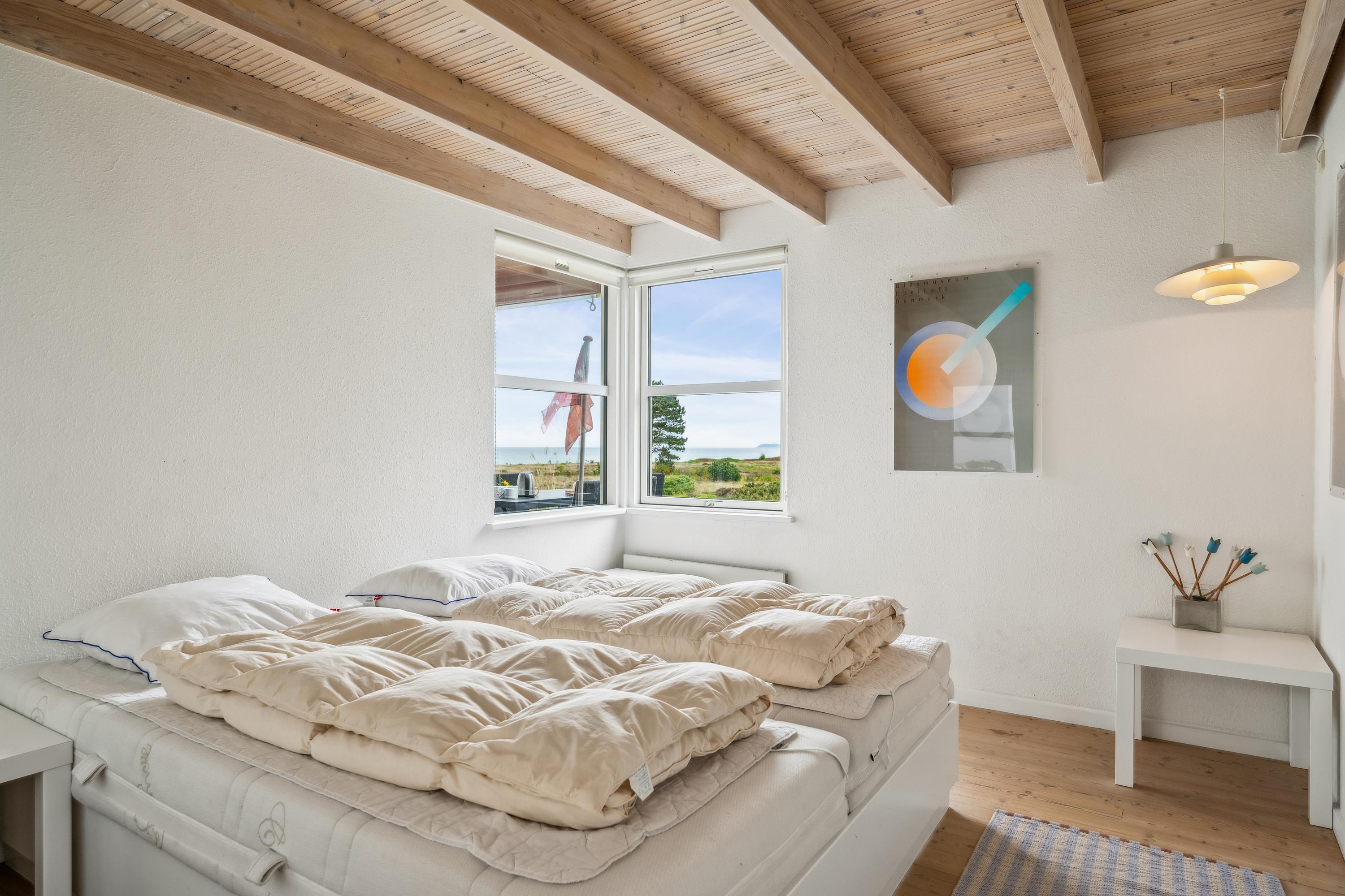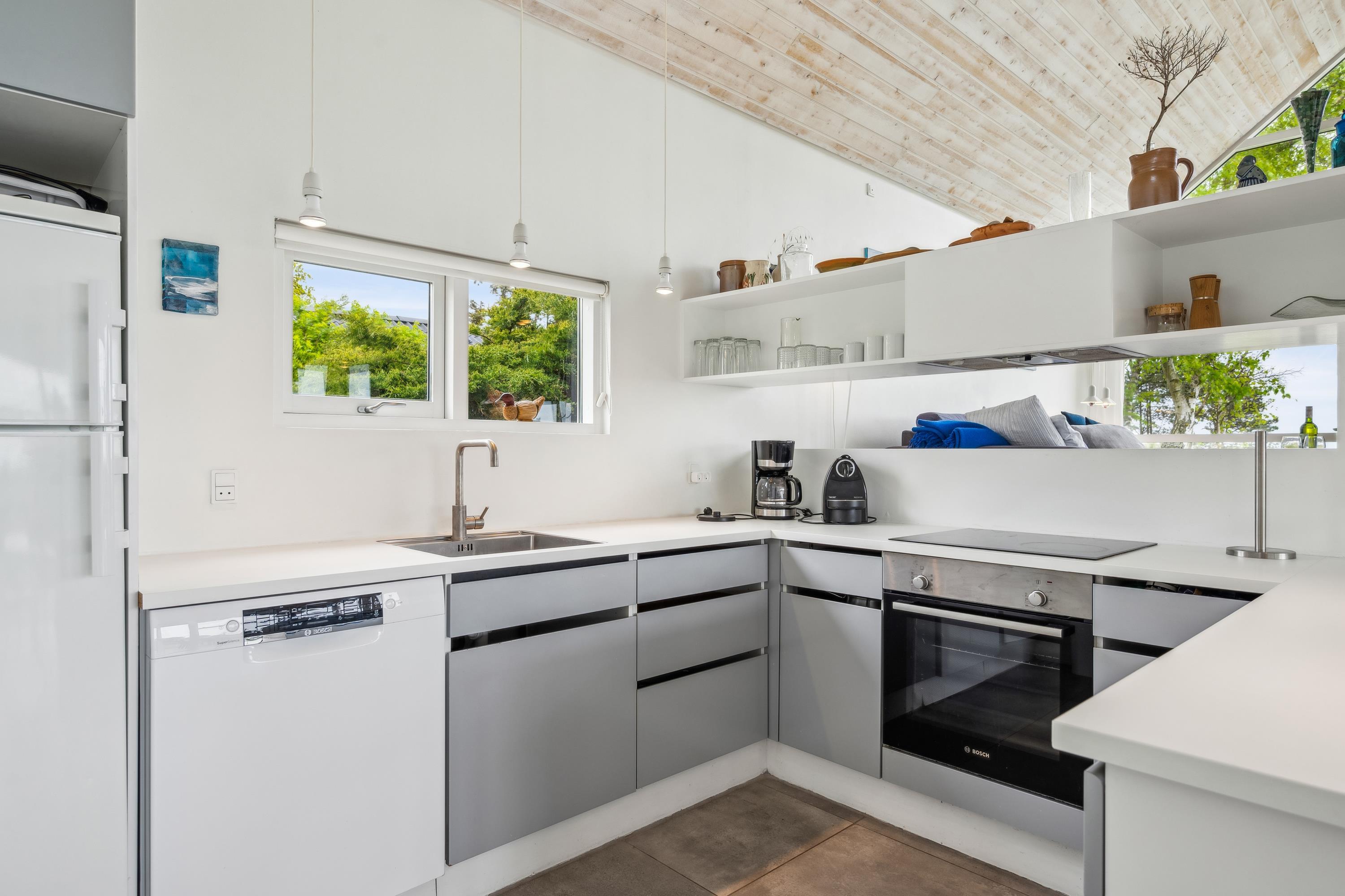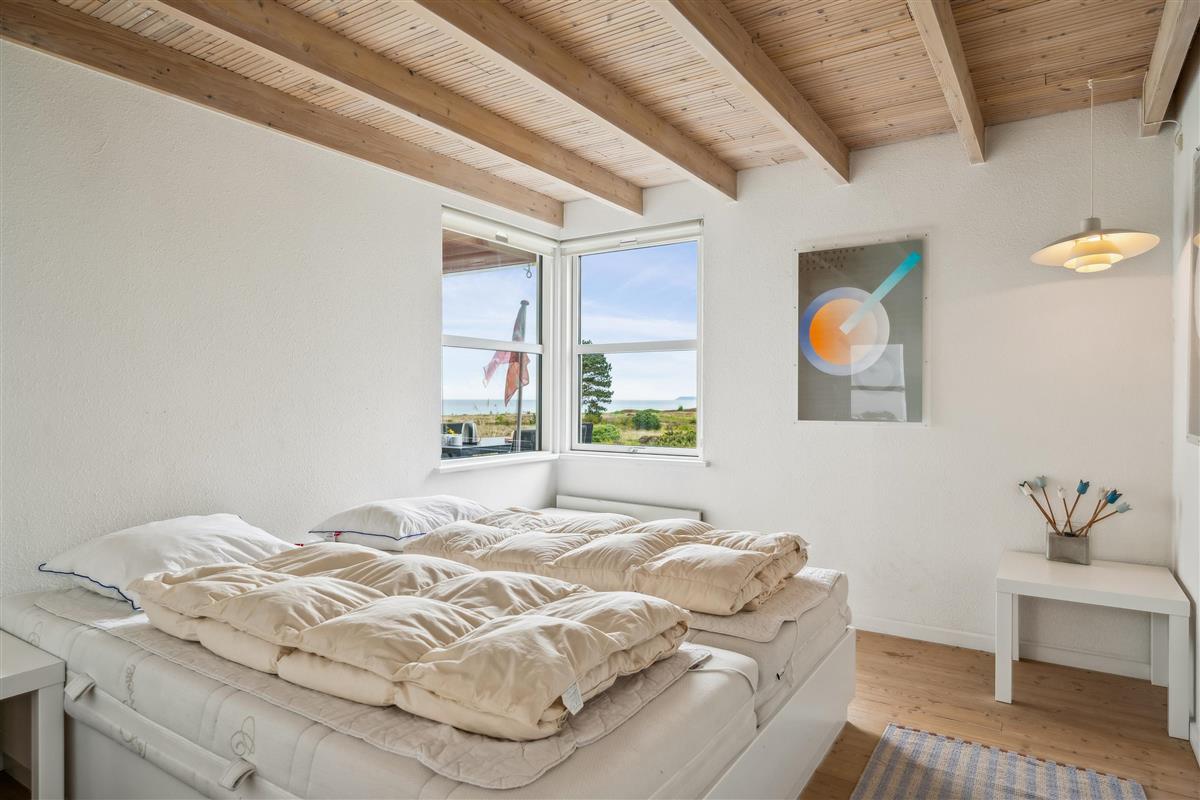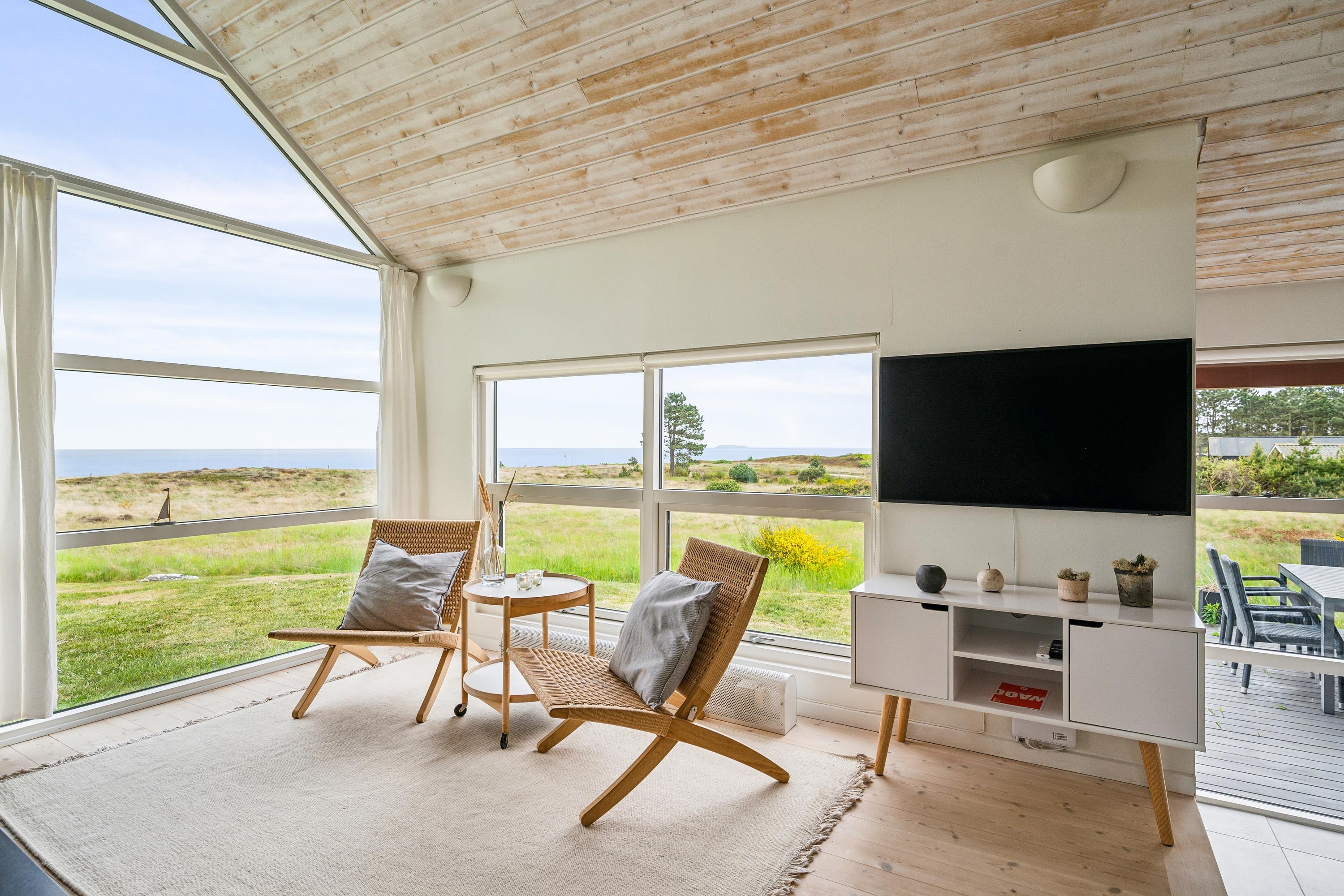 A truly delightful summer house located in the first row from the sea with panoramic views of the Kattegat on a secluded and spacious natural plot in undisturbed surroundings. Partially covered terrace with garden furniture and grill. The house is furnished with a bright, friendly, and tasteful décor on staggered levels with stairs from the kitchen to the living room. From the living room, there is a view of the sea. Cozy living room with wood-burning stove, satellite TV, and stereo system with CD. Lovely, spacious kitchen with ceramic stove, refrigerator with a small freezer, and dishwasher. Beautiful bathroom with shower, underfloor heating, sauna, and washing machine. The house's sleeping accommodations are distributed among 3 bedrooms: 2 with double beds and 1 with bunk beds. For the little holiday guests, a high chair is available. Note: The house has a charging station for electric cars.