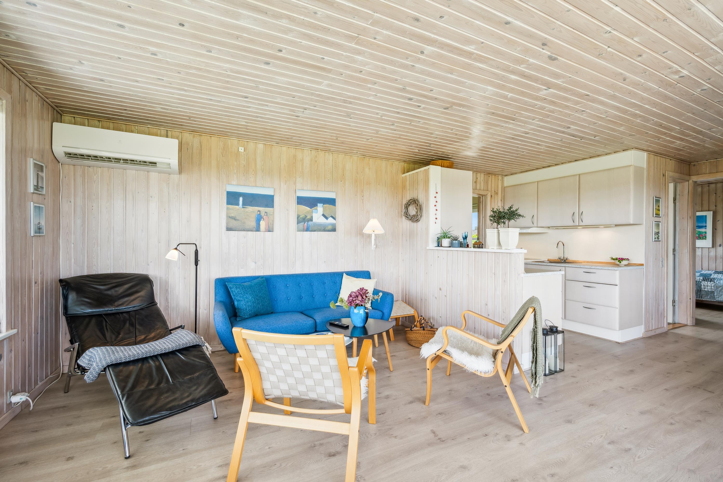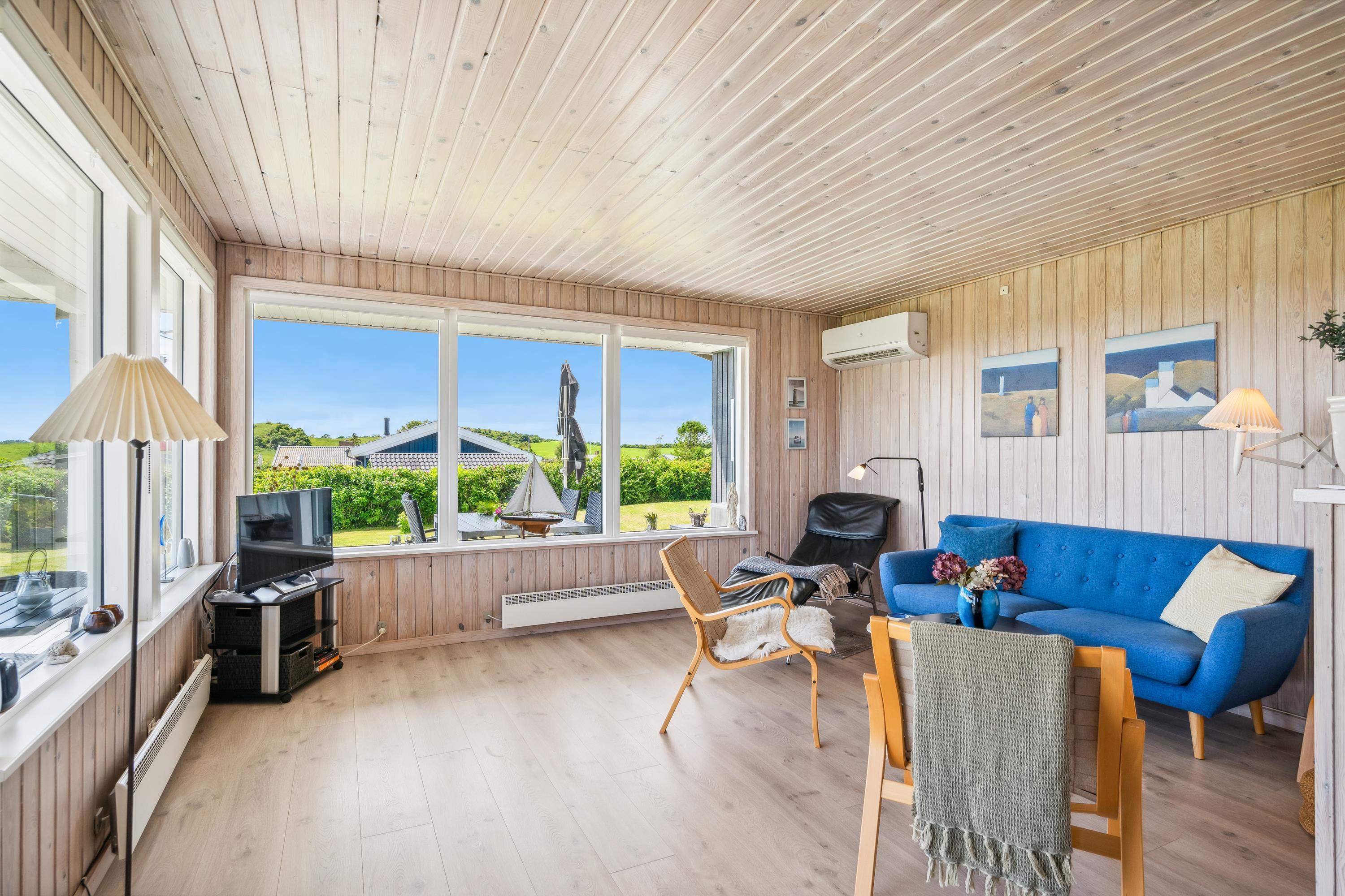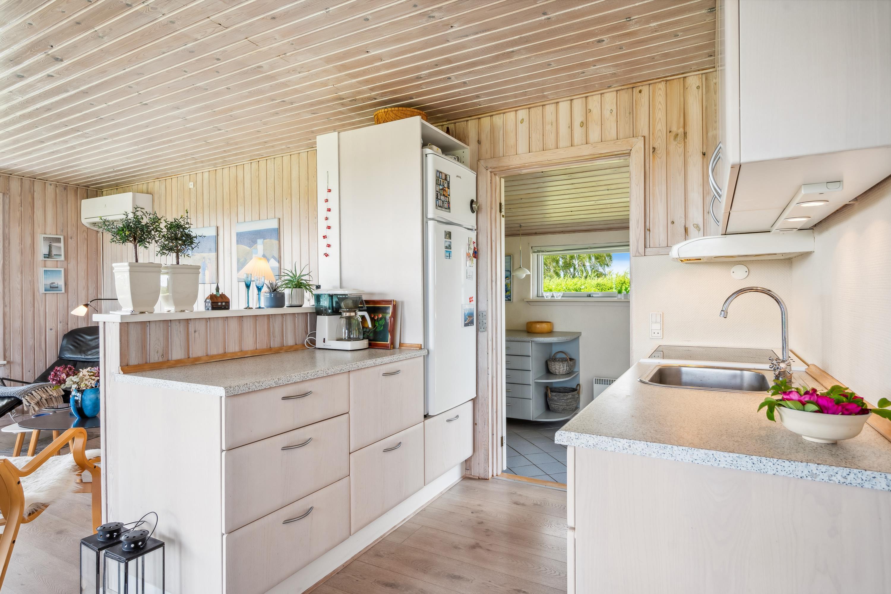 Cozy and well-furnished living room with a good dining area for 4 people, TV with Danish and German channels, stereo system with CD and radio. In open connection with the living room, there is a well-equipped kitchen with ceramic stove with oven, microwave, and a refrigerator with a small separate freezer. Newer bathroom with shower and underfloor heating. Practical, large entrance hall with a washing machine and the possibility to store shoes and outerwear. The sleeping accommodations in the house are distributed among 3 good bedrooms: 1 with 2 single beds and 2 with 1 single bed each. Internet access.