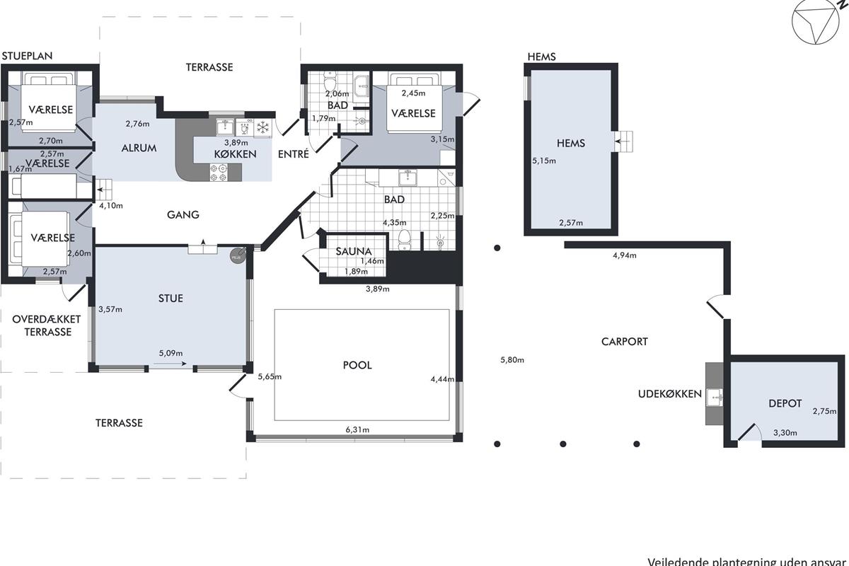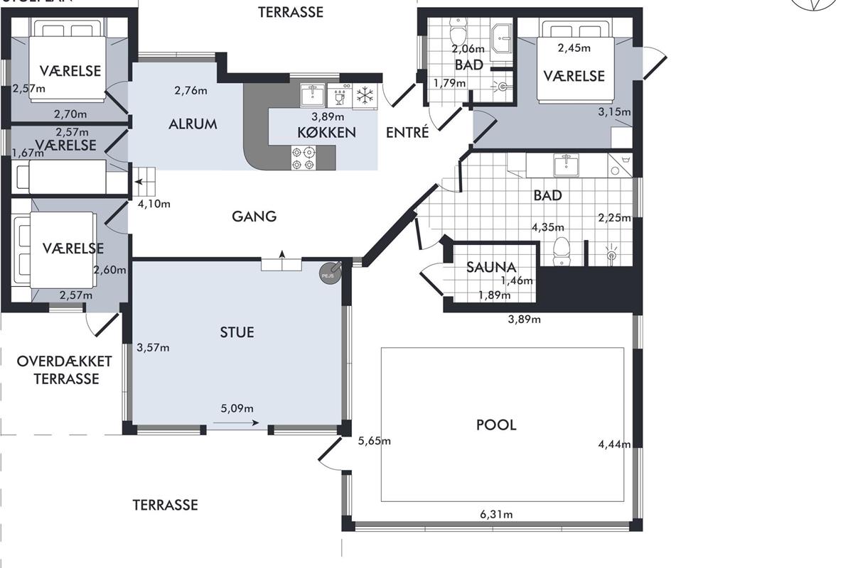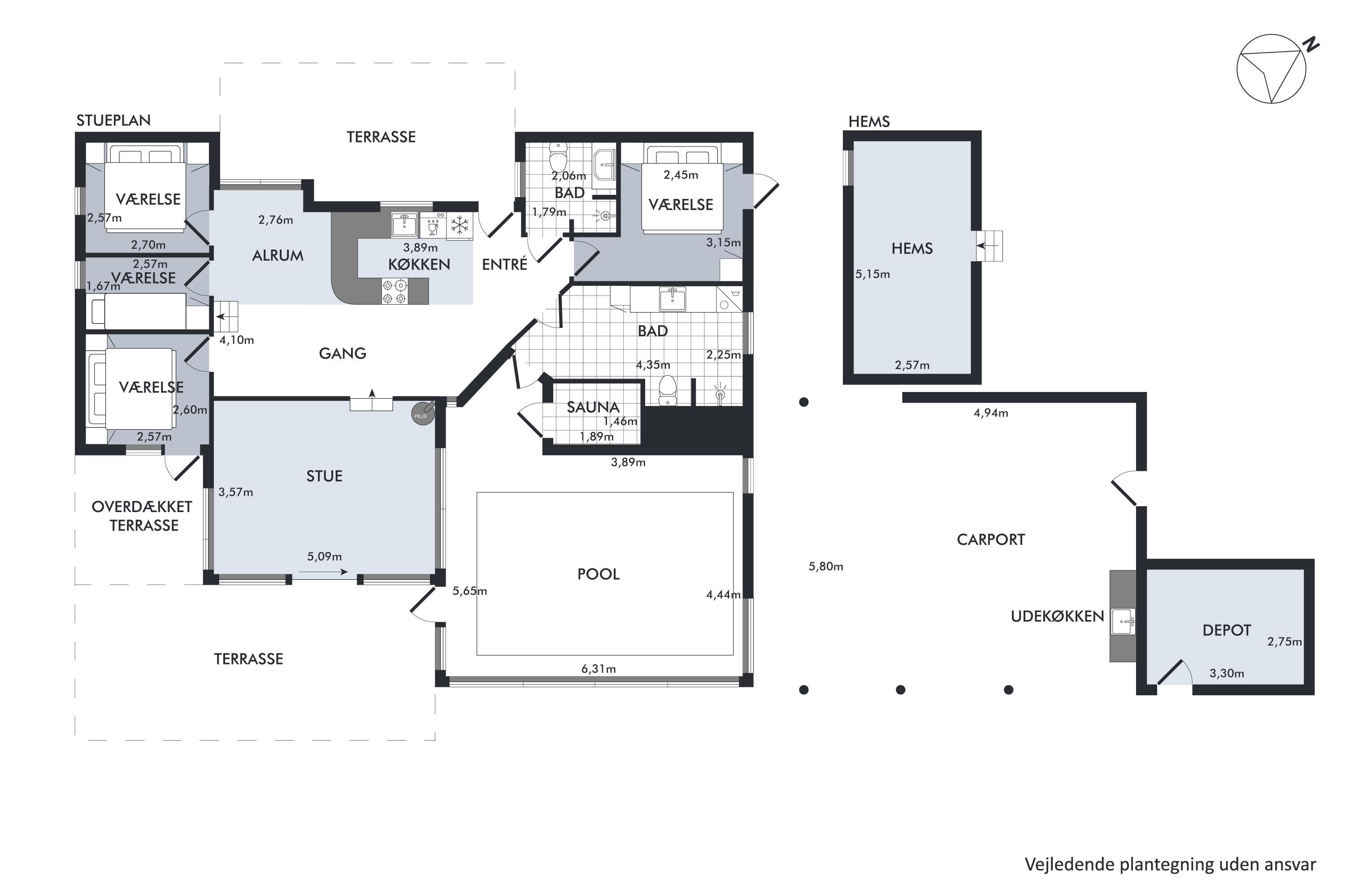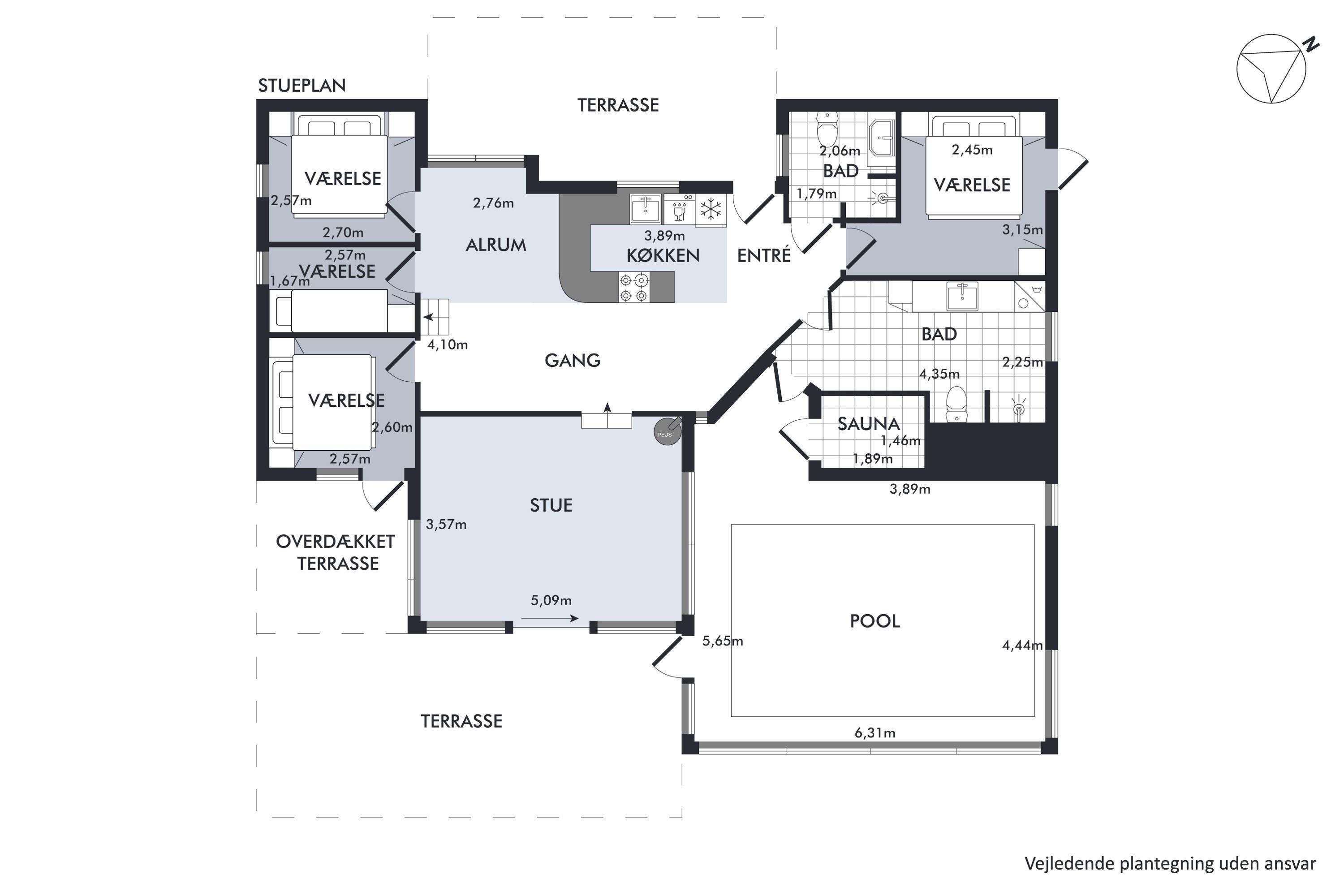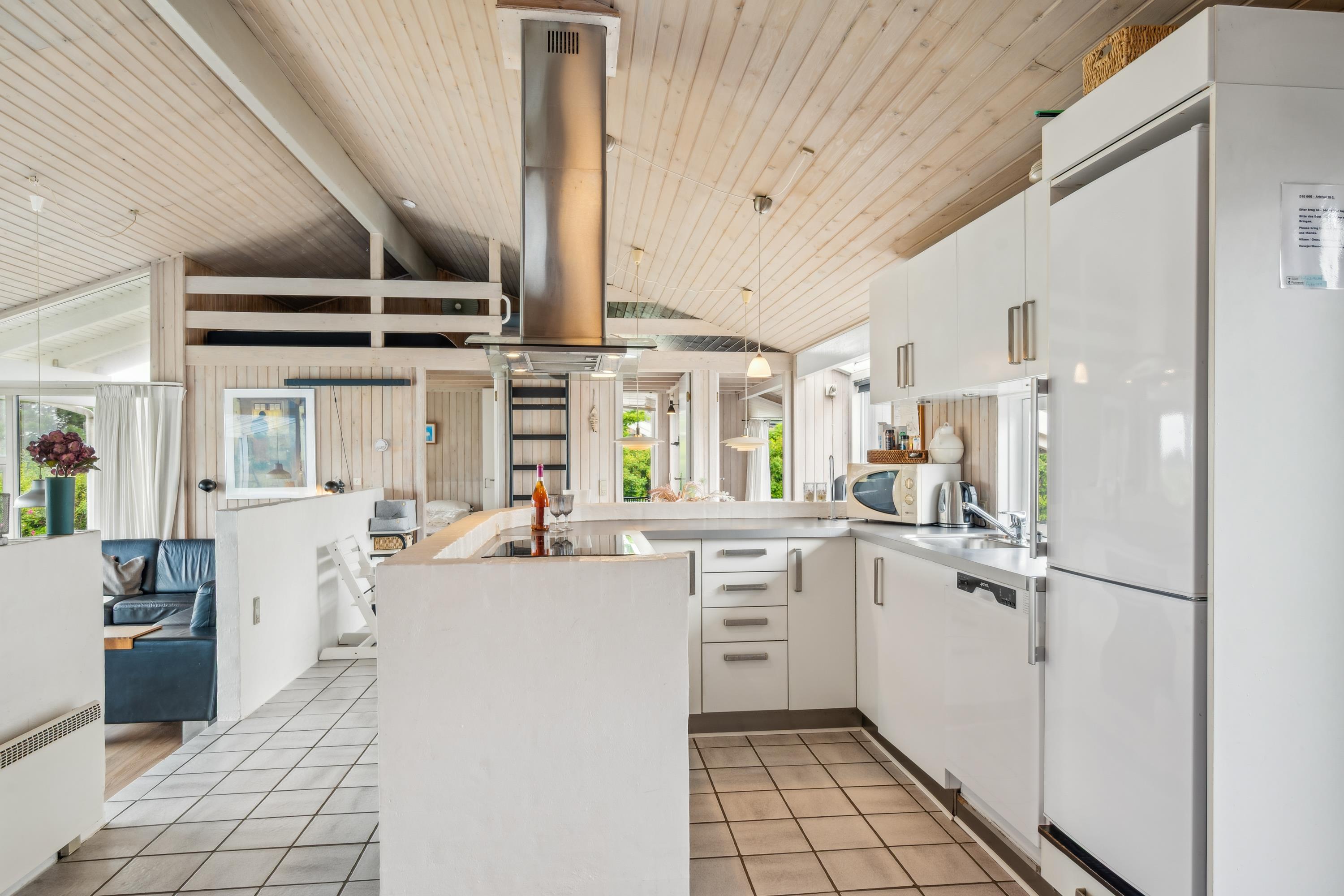 On a large natural plot close to Dråby Beach, you'll find this lovely pool cottage in the first row from the sea with unobstructed views over the Kattegat and Jernhatten. Several open terraces to the east and west with garden furniture, a grill, and a bonfire area. Cozy living room with a wood-burning stove, satellite TV, stereo system with CD and DVD player. Good, functional kitchen with ceramic stove, refrigerator with a small freezer, microwave, and dishwasher. 2 good bathrooms with shower and underfloor heating. Additionally, there's a sauna, washing machine, and dryer. Centrally located in the house is the lovely pool room (4.8 x 3.5 x 1.5 m - 15 sqm) with underfloor heating. The house's sleeping arrangements are distributed across 4 bedrooms: 3 with double beds and 1 with bunk beds, plus a large loft that is open to the living room with 2 sleeping places. Rowboat without motor, which can be used in calm weather at your own risk and insurance. Fish cleaning area and additional freezer in the shed. For the little holiday guests, there's a crib, high chair, sandbox, and swing. Additionally, there's a petanque court. Internet is available.