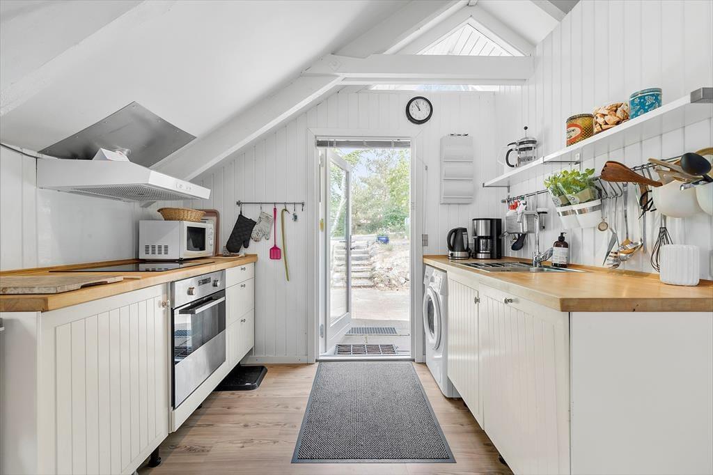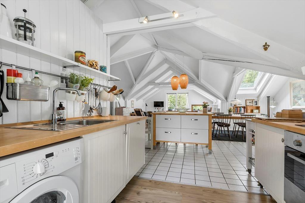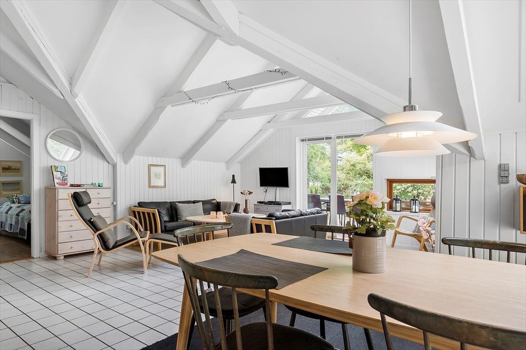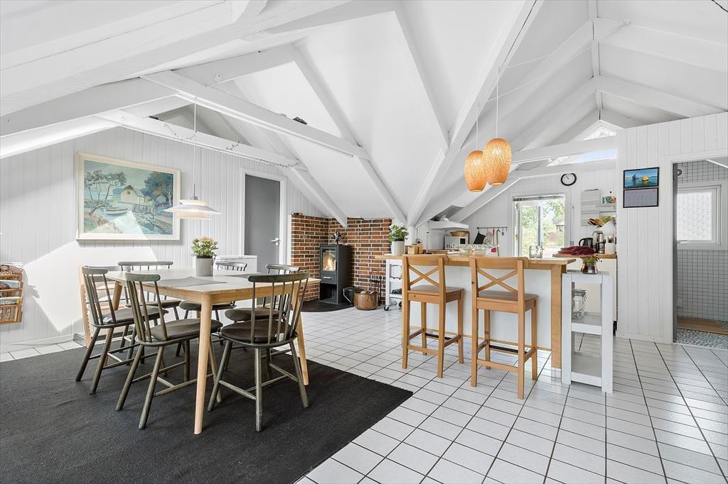 Direkt vor den Toren von Ebeltoft erwartet dich ein gemütliches und gepflegtes Ferienhaus, in dem sich das Urlaubsgefühl schnell einstellt. Im Haus begrüßt dich ein heller und freundlicher Wohnraum, in dem der Kaminofen an kühleren Abenden leise knistert. Die Wärmepumpe sorgt zusätzlich für ein angenehmes Raumklima. Das Wohnzimmer ist offen mit der kleinen, aber sehr funktionalen Küche verbunden, in der dir sowohl eine Geschirrspülmaschine als auch eine Waschmaschine zur Verfügung stehen. Praktisch, wenn der Alltag selbst im Urlaub leicht von der Hand geht. Hier findest du außerdem einen Essbereich mit Fliesenboden – ideal für entspannte Morgenstunden und gemeinsame Mahlzeiten. Das Badezimmer ist gepflegt, funktional und mit einer Duschnische ausgestattet. Die drei Schlafzimmer bieten ausreichend Platz für alle: zwei mit Einzelbetten und eines mit Doppelbett. Auch die jüngsten Gäste sind gut versorgt, denn ein Kinderbett und ein Hochstuhl stehen bereit. Wenn der Abend nach Ruhe verlangt, kannst du deine eigenen TV- und Streamingdienste ganz einfach über das Chromecast/Apple TV des Hauses von deinem Handy oder Tablet starten.