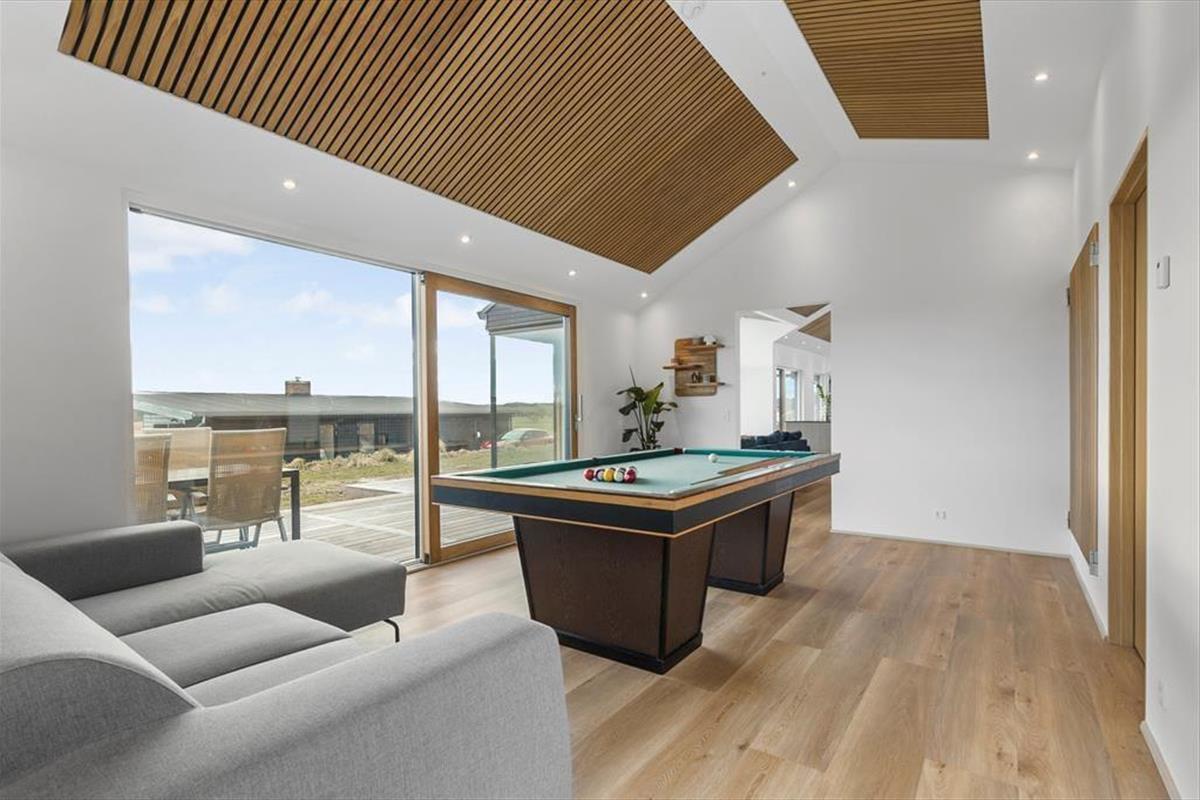 Unmittelbar nach dem ersten Betreten dieser hellen, gemütlichen Urlaubsoase, wird sich bei dir und deinen Mitreisenden beste Urlaubsstimmung einstellen. Herzstück des Hauses ist der große, offene Aufenthaltsraum mit einem schönen Essplatz und einem bequemen Sofa, das nach einem langen Urlaubstag zum Entspannen und Hochlegen der Beine einlädt. Die Küche bietet alles, was das Herz begehrt. Zu den zeitgemäßen Annehmlichkeiten zählen ein Geschirrspüler, ein Backofen, ein Kochfeld und ein großzügig bemessener Kühl- und Gefrierschrank. Garantiert wird die Zubereitung der täglichen Mahlzeiten in dieser schönen Küche zum vergnügten Familienprojekt. Die Schlafplätze verteilen sich auf drei ansprechende Schlafräume, von denen einer mit zwei Einzelbetten eingerichtet ist. Im zweiten Schlafraum erwarten dich ein Doppelbett und eine gemütliche Leseecke am Fenster. Das Elternschlafzimmer begeistert mit einem Doppelbett und einem direkten Zugang zu einem eigenen tollen Badezimmer mit Badewanne - perfekt für eine Wellnessstunde nach einem langen, erlebnisreichen Tag an der frischen Luft. Das zweite Badezimmer des Hauses präsentiert sich nicht minder schön und beinhaltet eine Dusche, eine Waschmaschine und einen Wäschetrockner. Einer der ganz besonderen Vorzüge deines Urlaubsdomizils ist der Aktivitätsraum mit Billardtisch und Sofa, der beste Voraussetzungen für einen gemütlichen Abend mit spannenden Duellen und viel Spaß bietet.