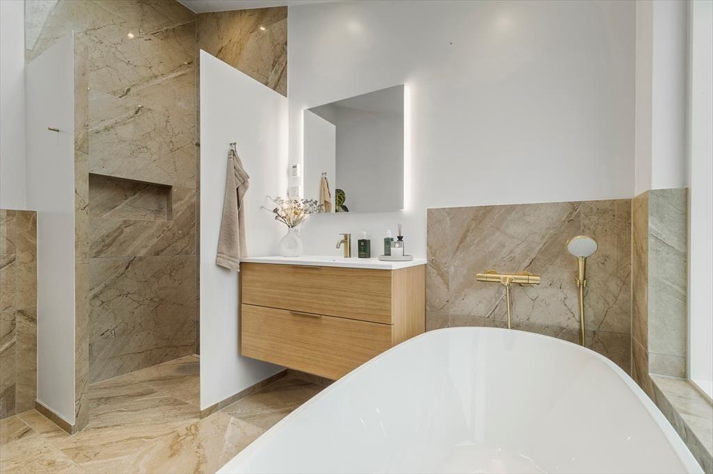 Vom Essbereich gelangst du hinaus auf die große, überdachte Terrasse, auf der du einen ruhigen Morgen mit einem frischen Kaffee genauso genießen kannst, wie einen langen, stimmungsvollen Grillabend im Familienkreis. Der Garten bietet beste Möglichkeiten zum Entspannen und Spielen. Wie wäre es beispielsweise mit einem kleinen familieninternen Fußballmatch? An der Rückseite deines Hauses begrüßt dich ein zusätzliches, ausgesprochen schönes Terrassenareal mit mehreren Ebenen. Hier genießt du sicherlich gern ausgedehnte Sonnenbäder und das ein oder andere erfrischende Bad in der Outdoor-Badewanne. Fülle die Wanne mit kaltem Wasser und gönne dir ein erfrischendes Eisbad - ein Fest für die Sinne und zugleich ein perfekter Start in den Tag!