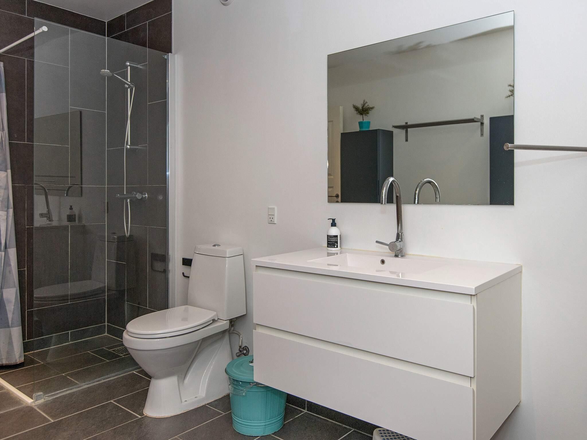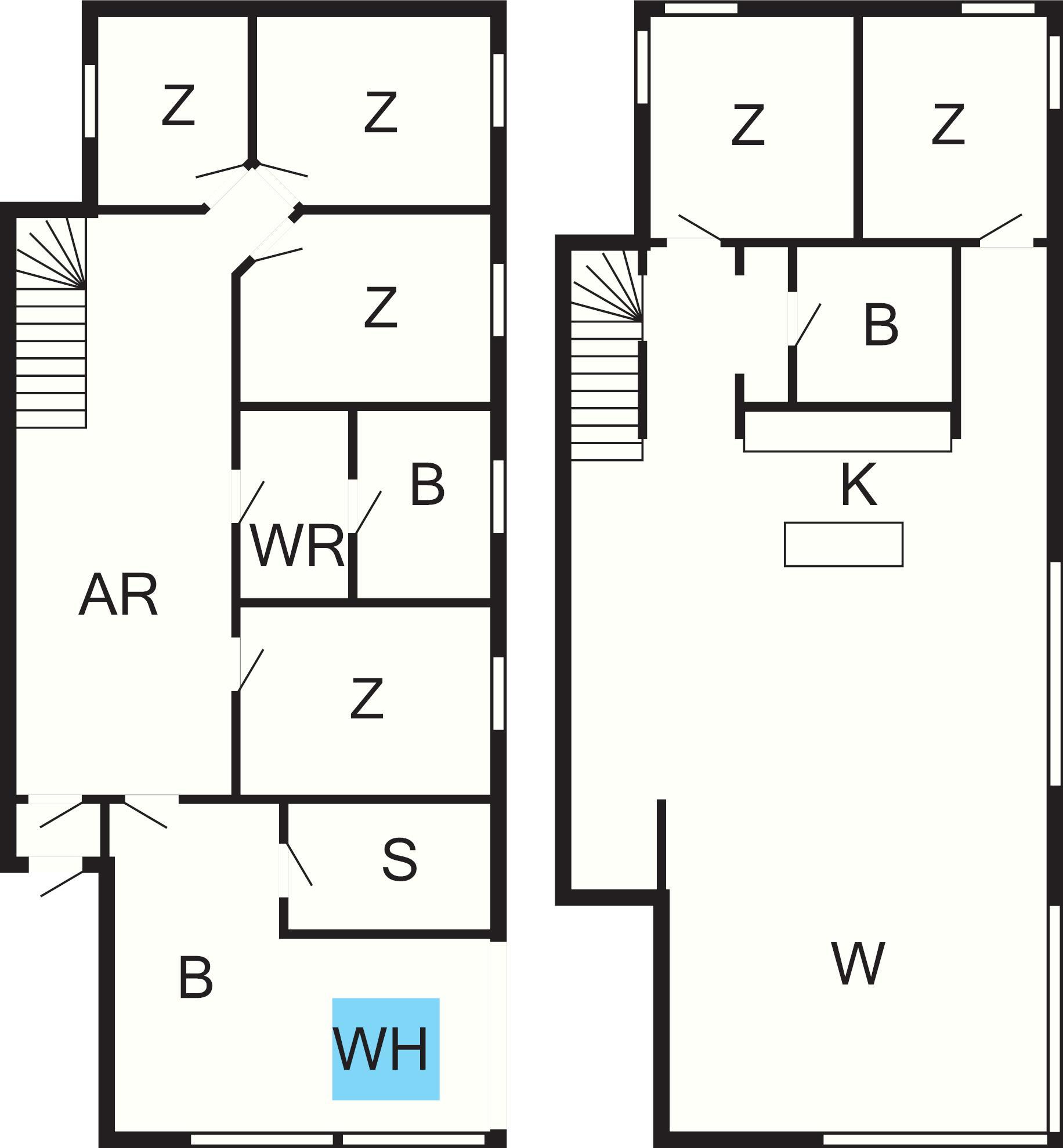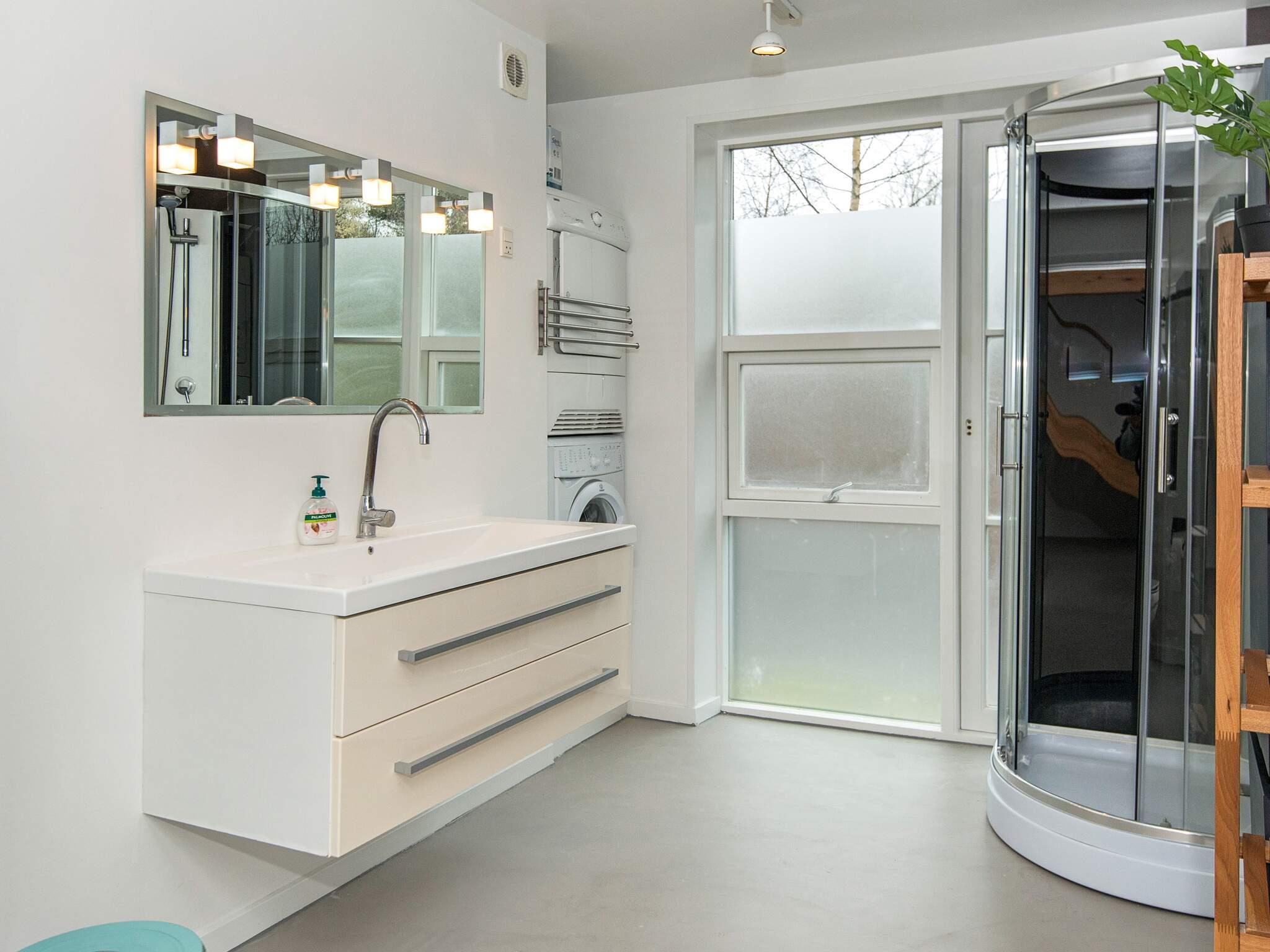 Das Haus hat zwei Etagen und insgesamt 16 Schlafplätze. In der unteren Etage liegen vier Schlafzimmer, ein Bad mit Dusche, Whirlpool und Saunabereich mit Liegestühlen. Im Obergeschoss befindet sich ein offener Küchen-/Aufenthaltsbereich mit Wohnzimmer und Aktivitätsmöglichkeiten. Im Aktivitätsraum steht auch die doppelte Schlafcouch bereit.
