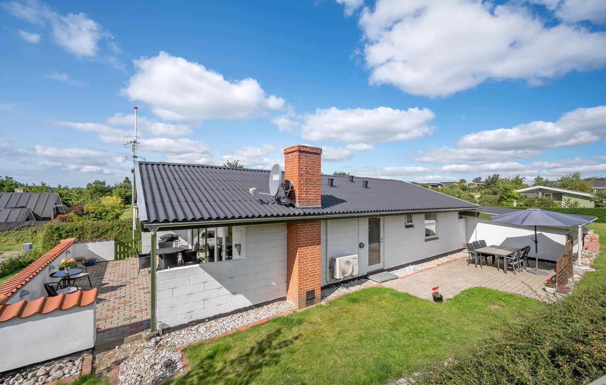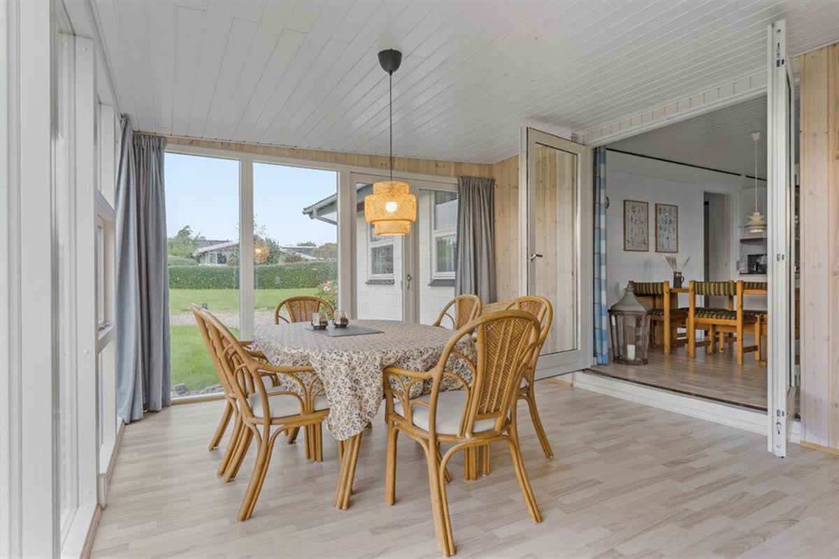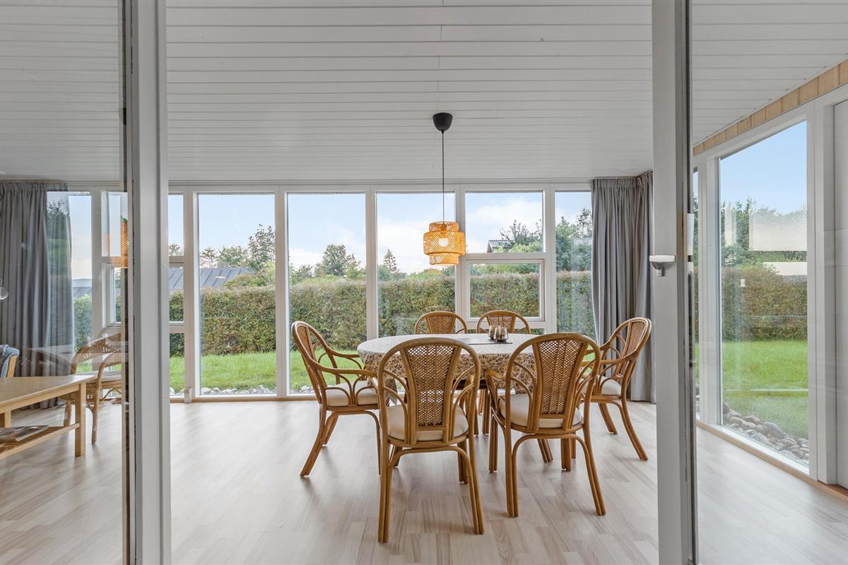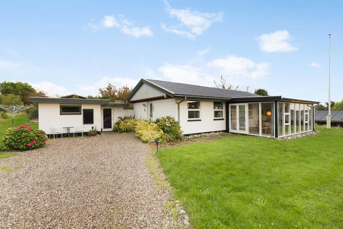 Moderne en lichte vakantiewoning nabij Dråby Strand, perfect voor ontspanning met verwarmde serre en uitzicht op het platteland.