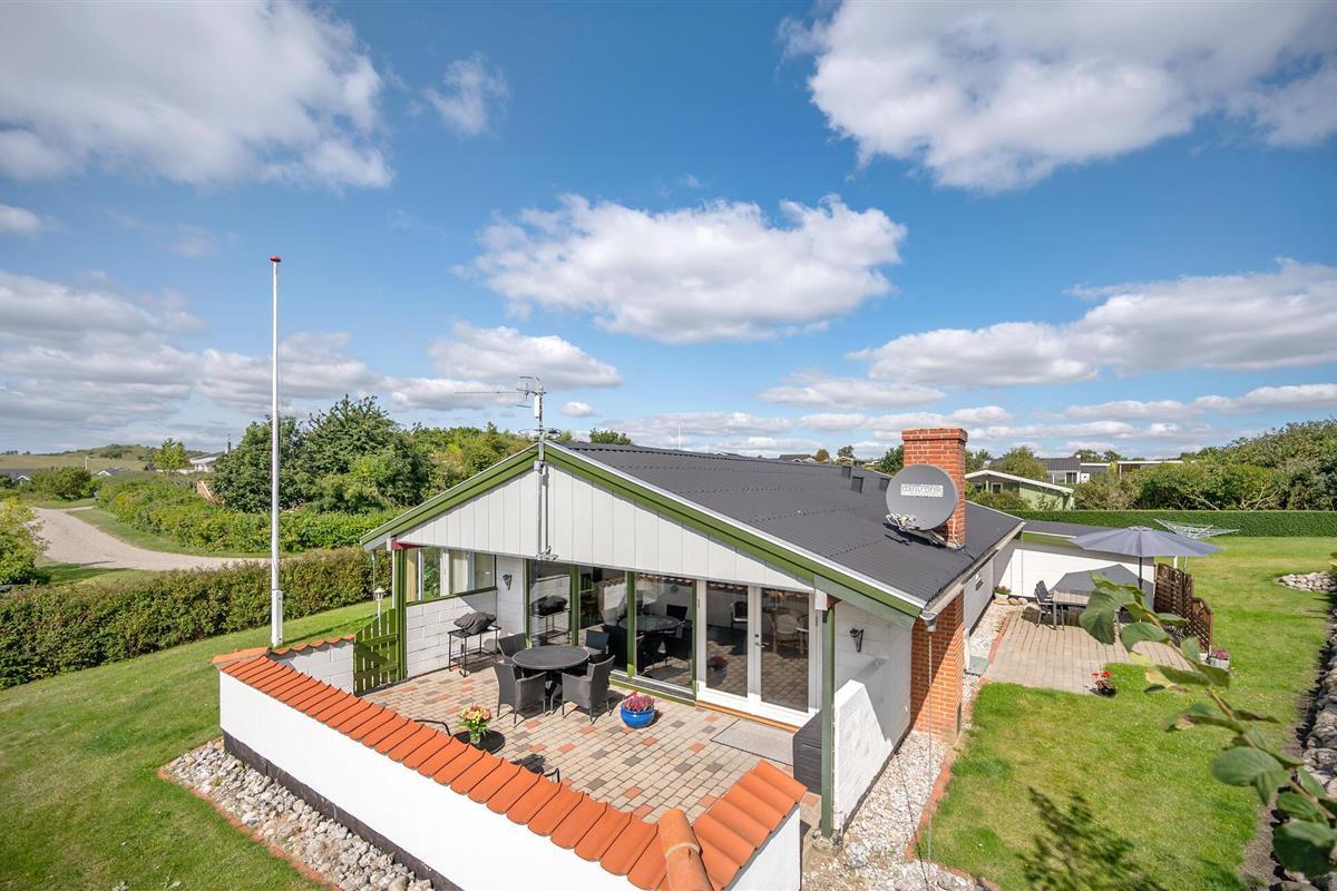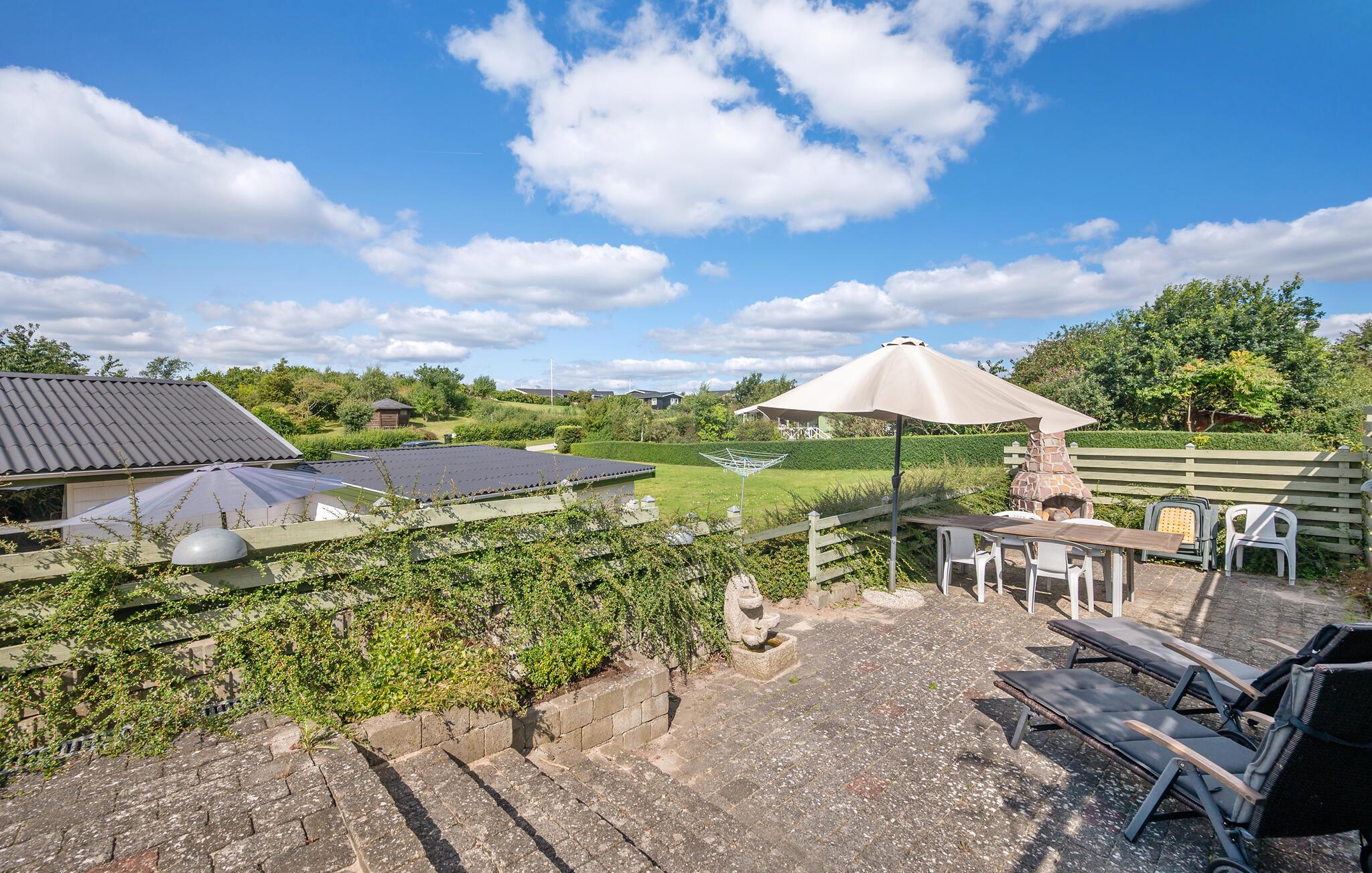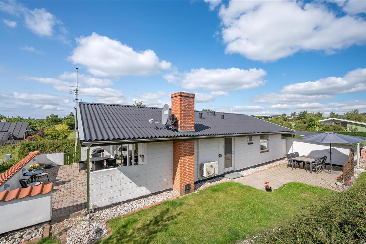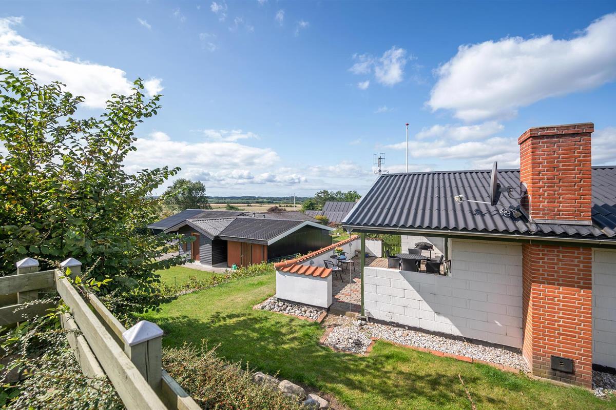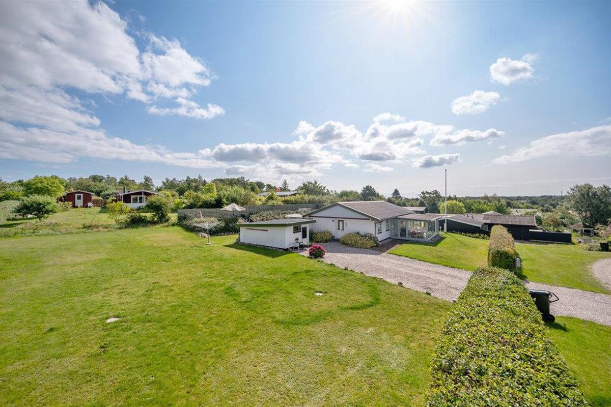 Moderne en lichte vakantiewoning nabij Dråby Strand, perfect voor ontspanning met verwarmde serre en uitzicht op het platteland.
