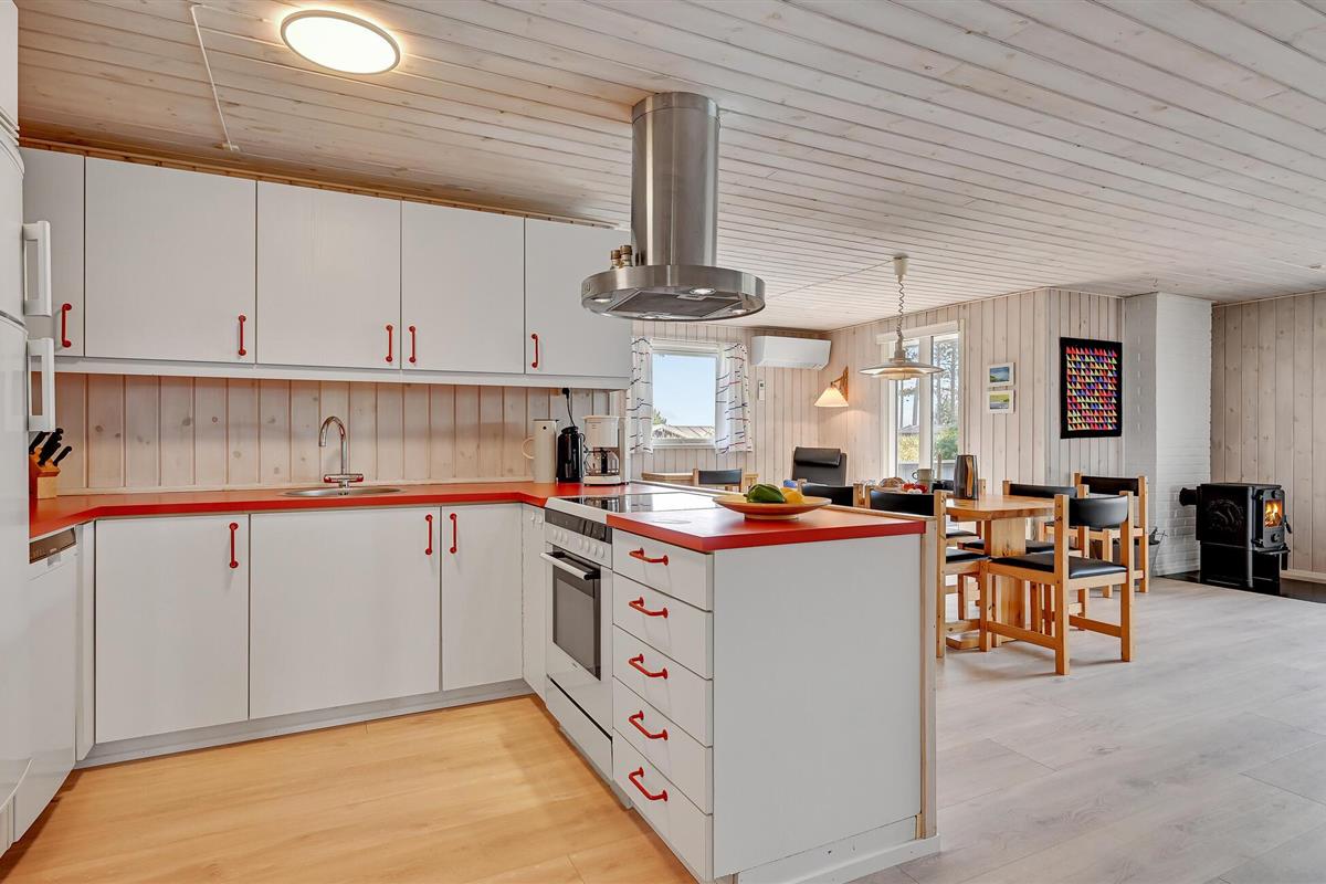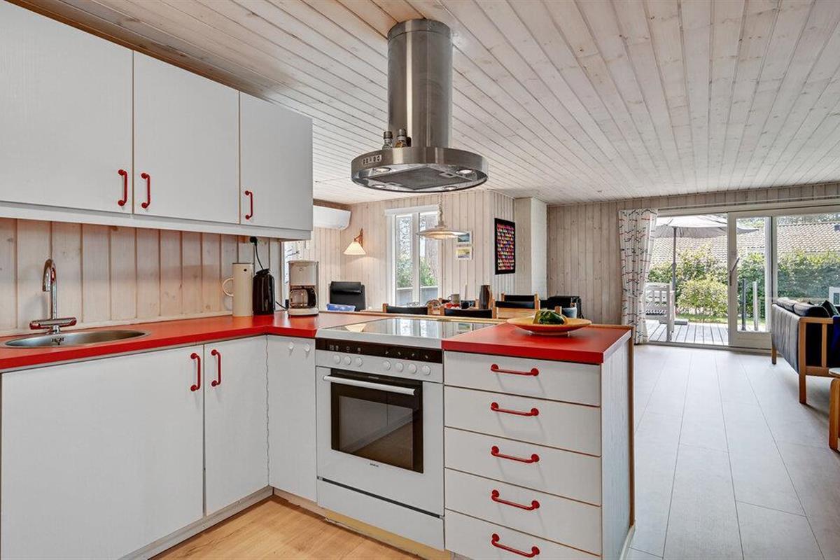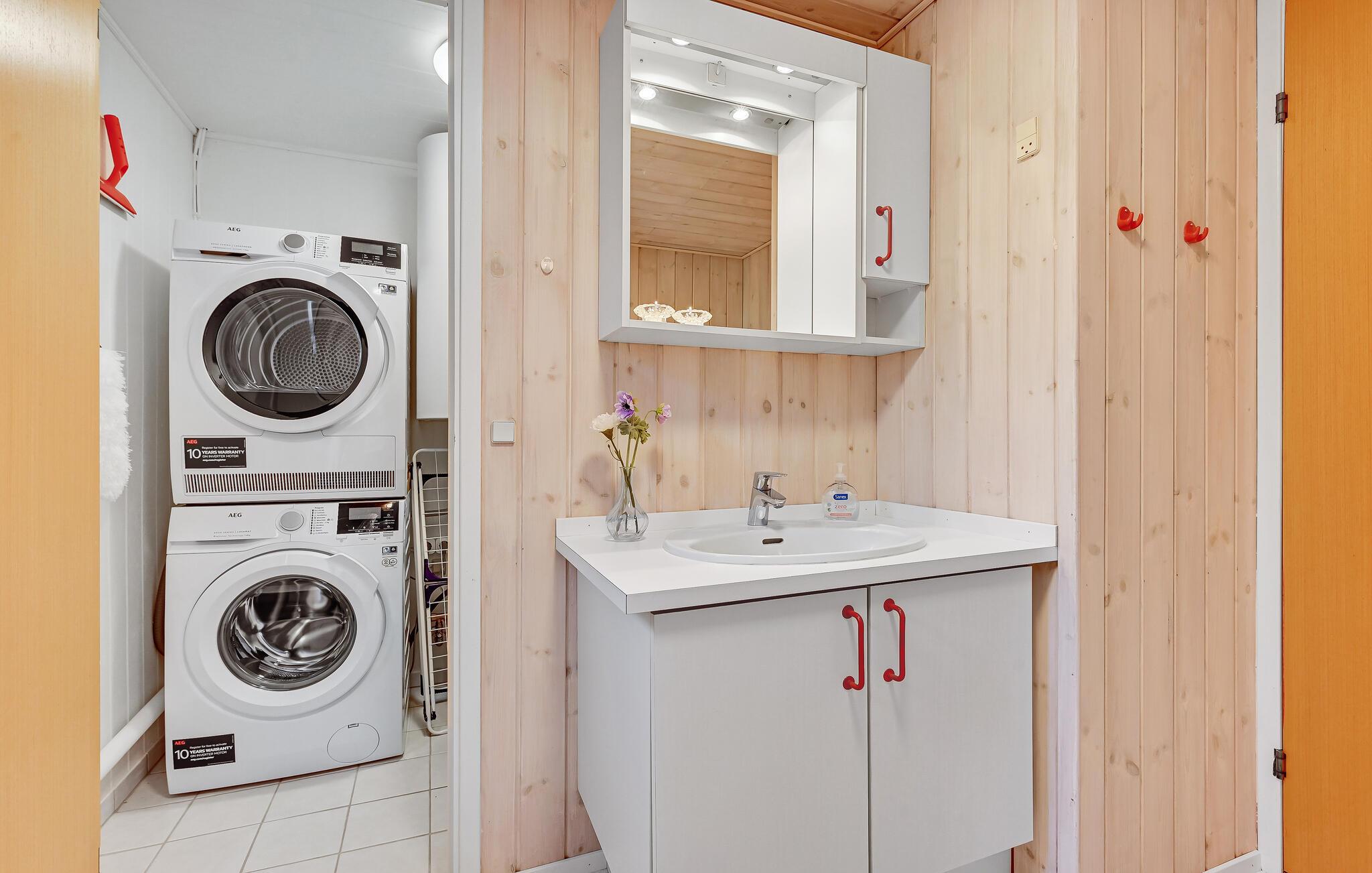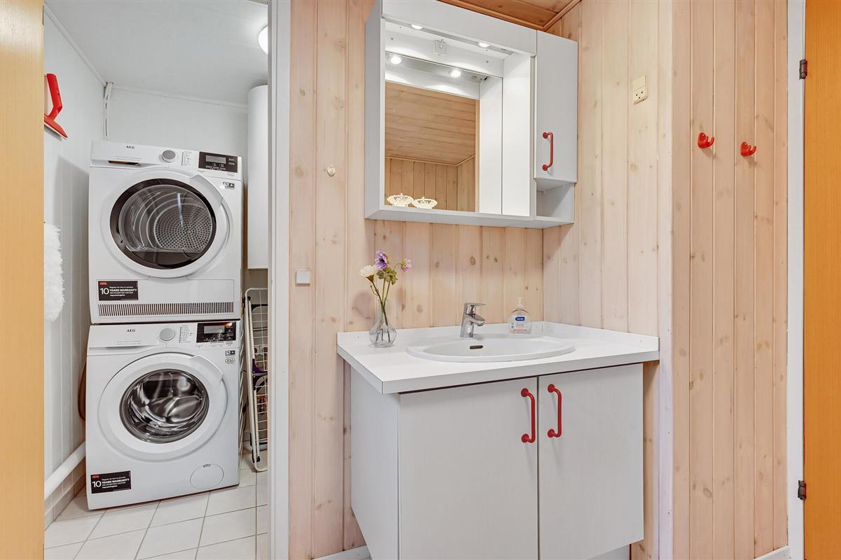 Welkom in dit mooie vakantiehuis bij de zee en fantastische natuur. Vanaf het grote houten terras heeft u een prachtig uitzicht over het water, waar u in de verte het eiland Hjelmen kunt zien liggen. Het hart van het huis is de mooie woonkamer met open keuken, eethoek en open haard, waar u gezellige avonden samen kunt doorbrengen. Voor vermaak op dagen met koelere temperaturen is het vakantiehuis uitgerust met een snelle glasvezelverbinding (50/50 mbit).