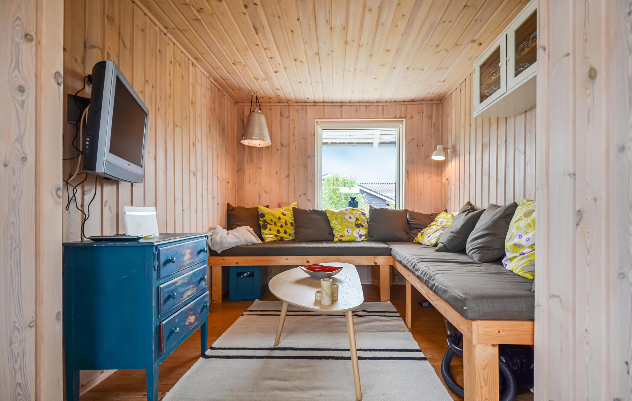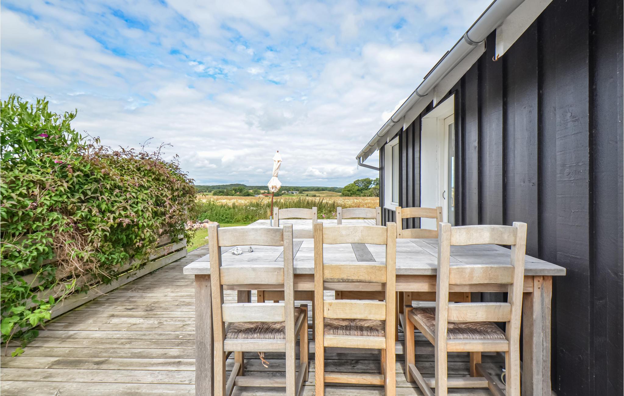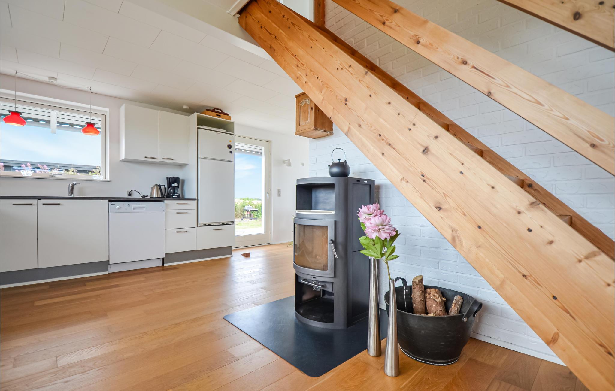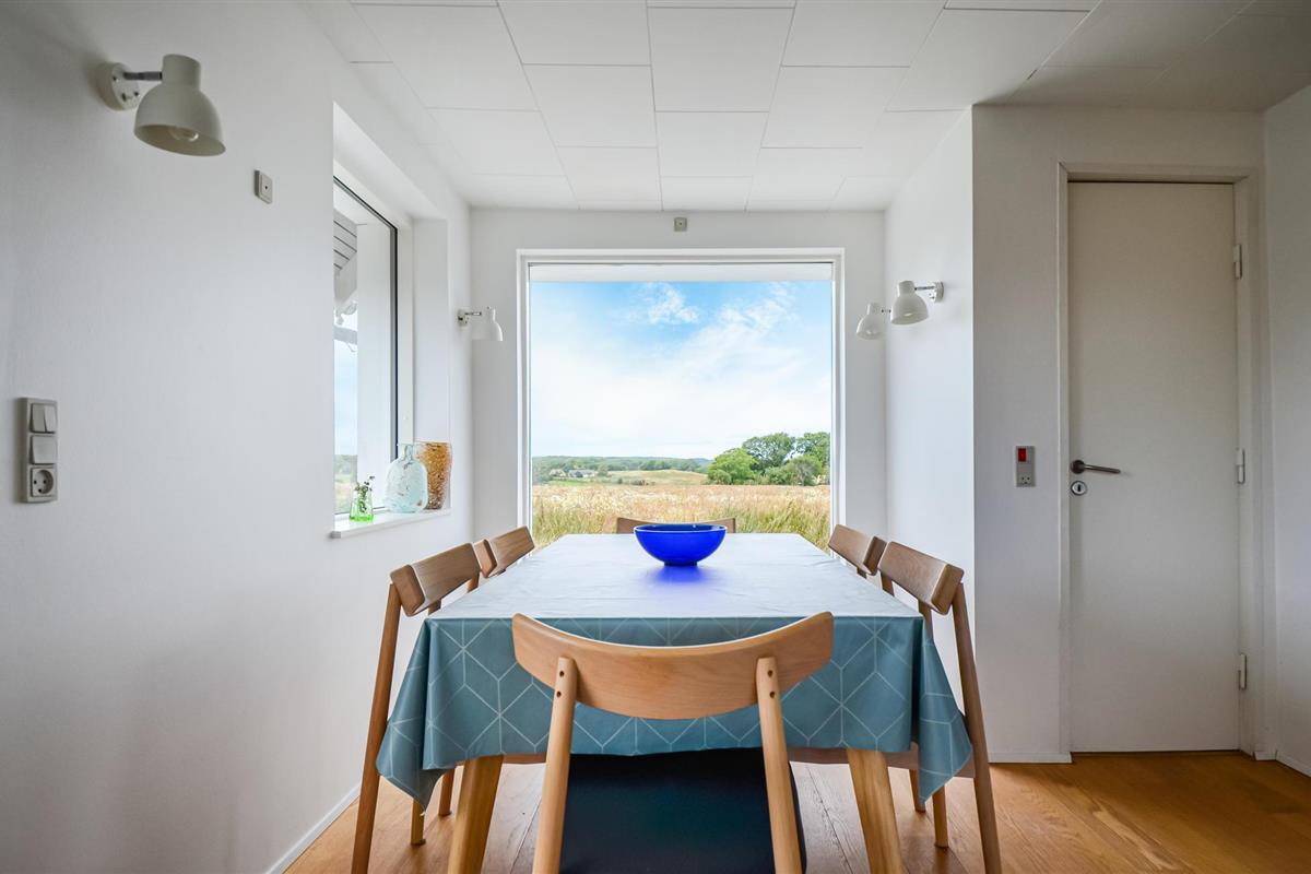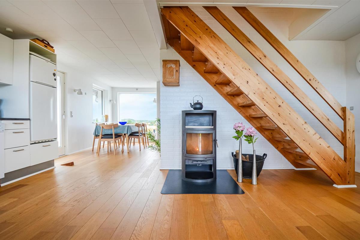 Het vakantiehuis op twee niveaus ligt in de buurt van het strand van Dråby, dat bekend staat als goed vis- en zwemwater. Op de eerste verdieping zijn er twee lichte kamers met uitzicht op de velden, de zee en de Jernhatten. Op de begane grond is een natuurlijke ontmoetingsplek met een open verbinding tussen de keuken, eethoek en kleine tv-lounge. Het grote gevelraam laat het licht binnen en biedt uitzicht op zee en op de prachtige natuur die kronkelt in het klassieke heuvellandschap. De charmante houtkachel verspreidt warmte en gezelligheid.