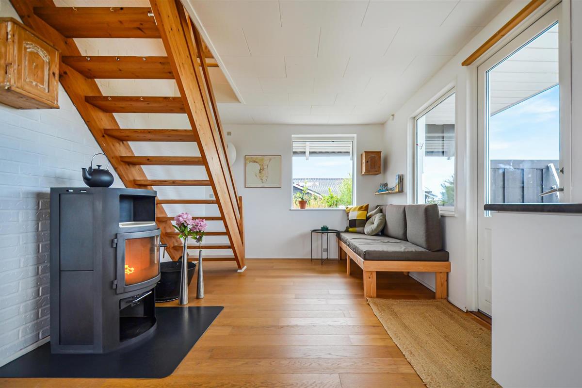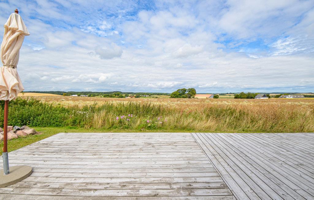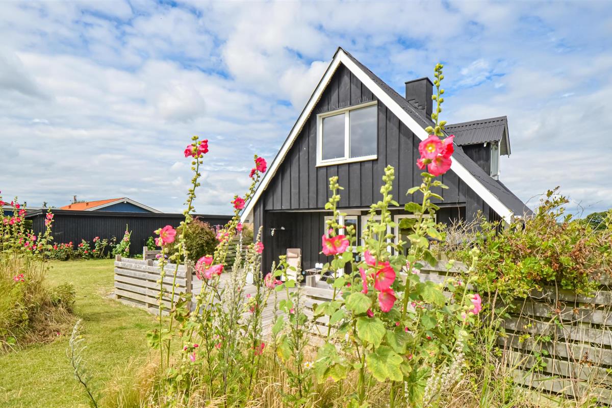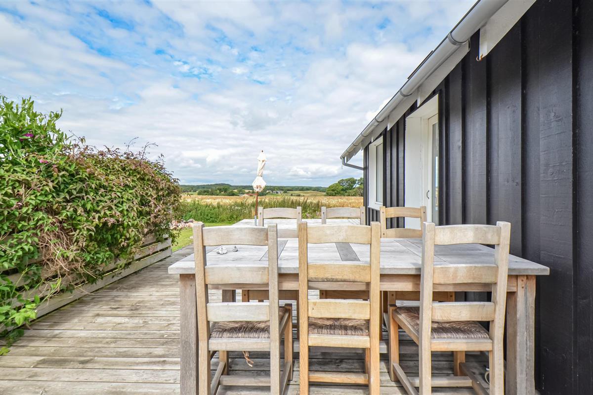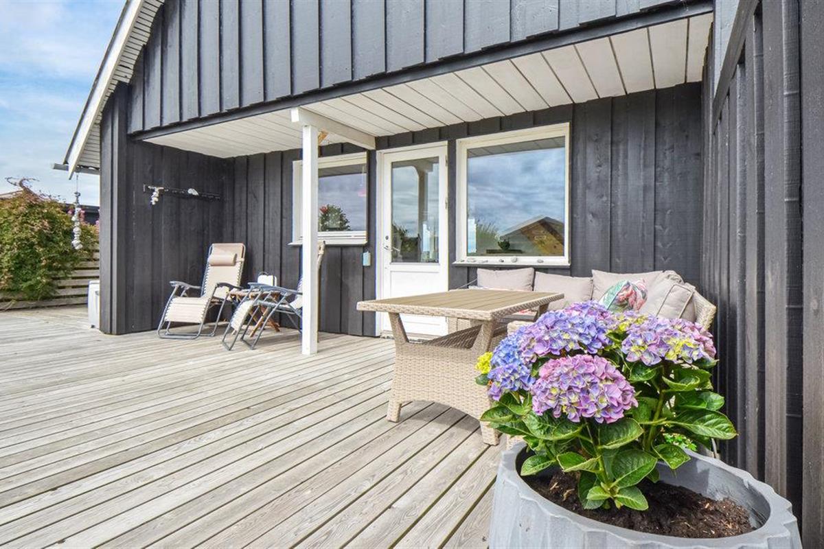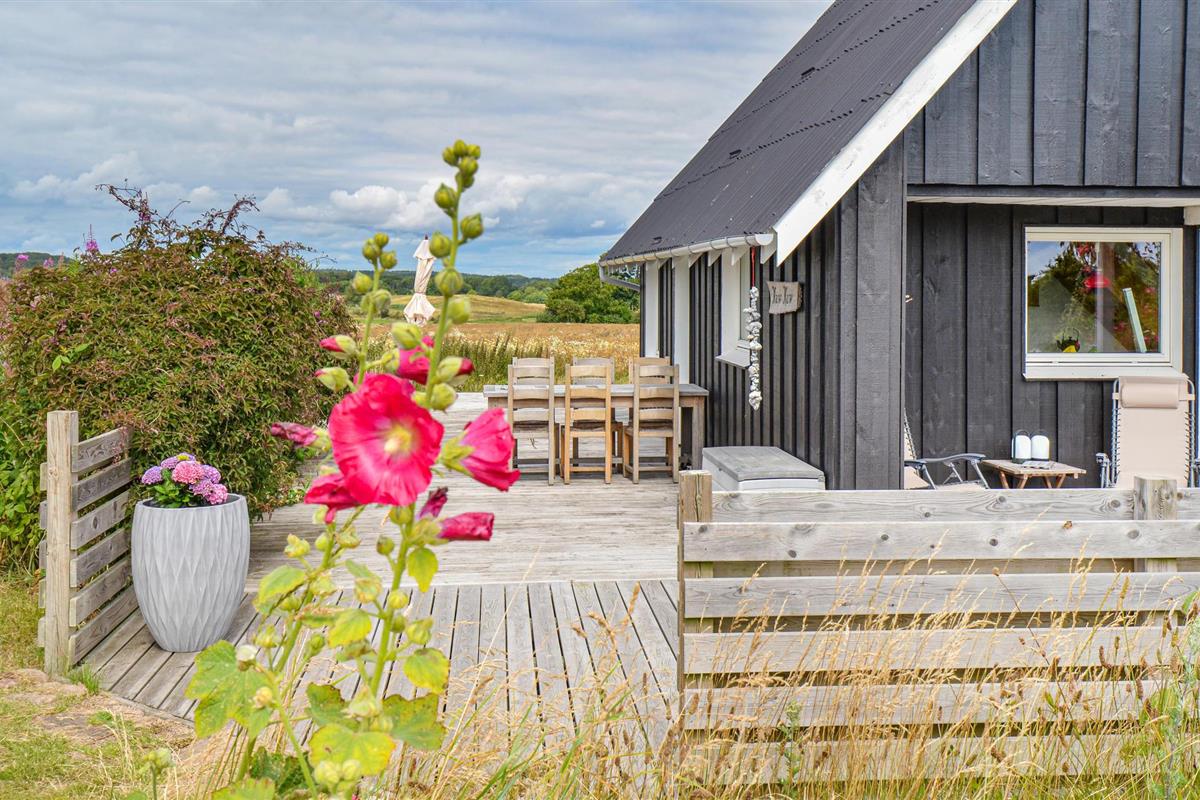 Charmant vakantiehuis nabij Dråby Strand met zeezicht, houten terras en volop natuur- en recreatiemogelijkheden.