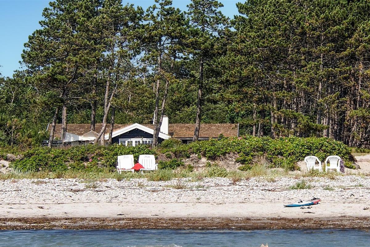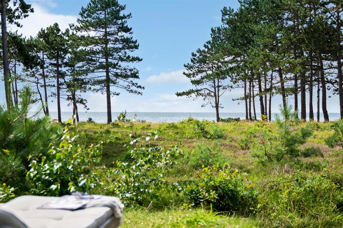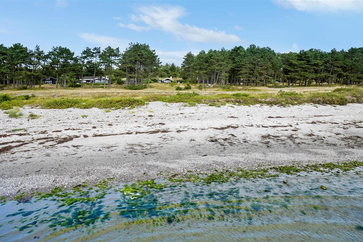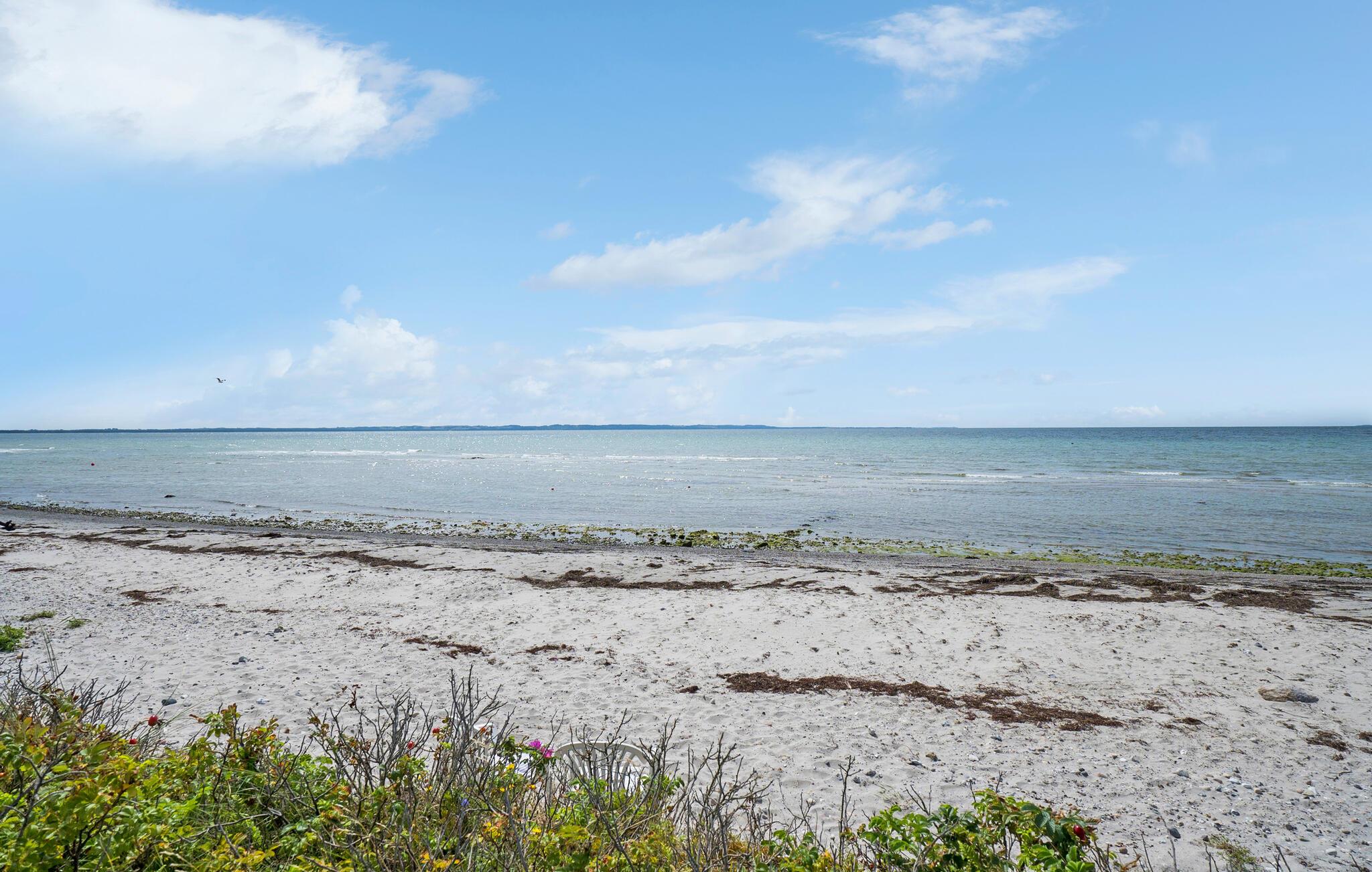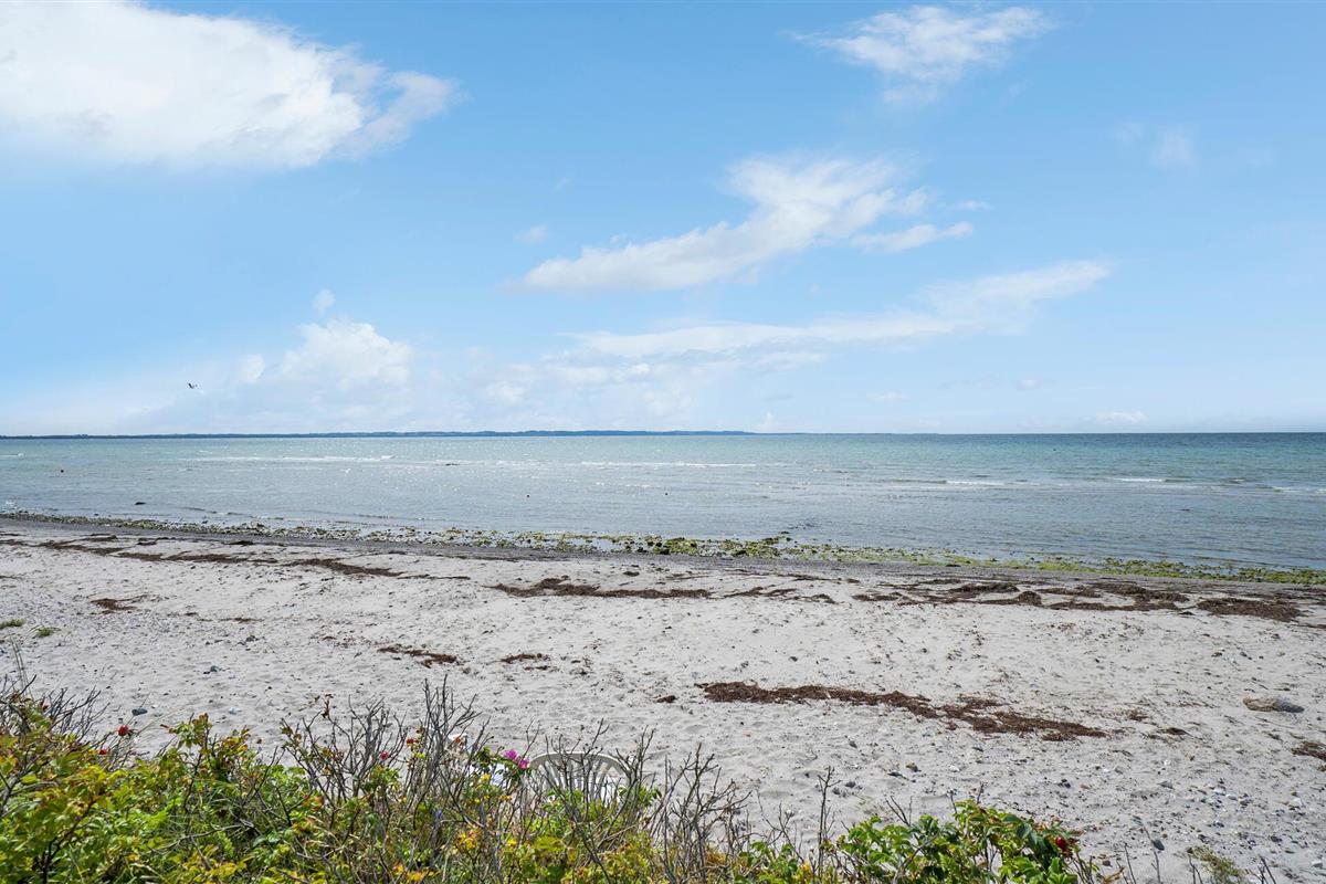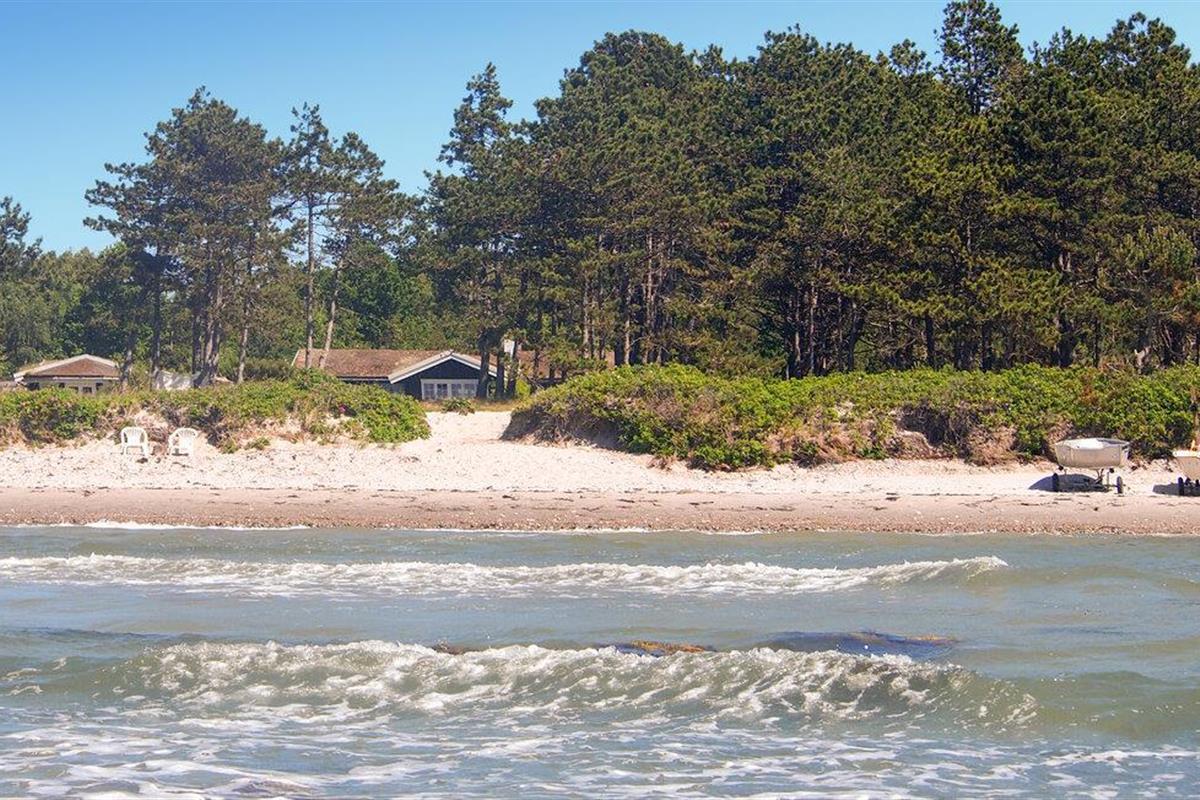 Ruim houten vakantiehuis direct aan Ebbeløkke Strand, perfect voor rust en ontspanning met familie of vrienden.