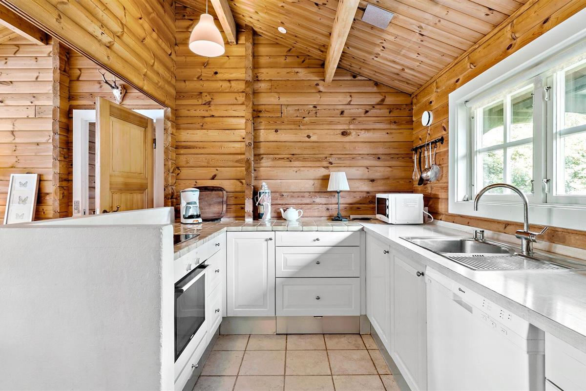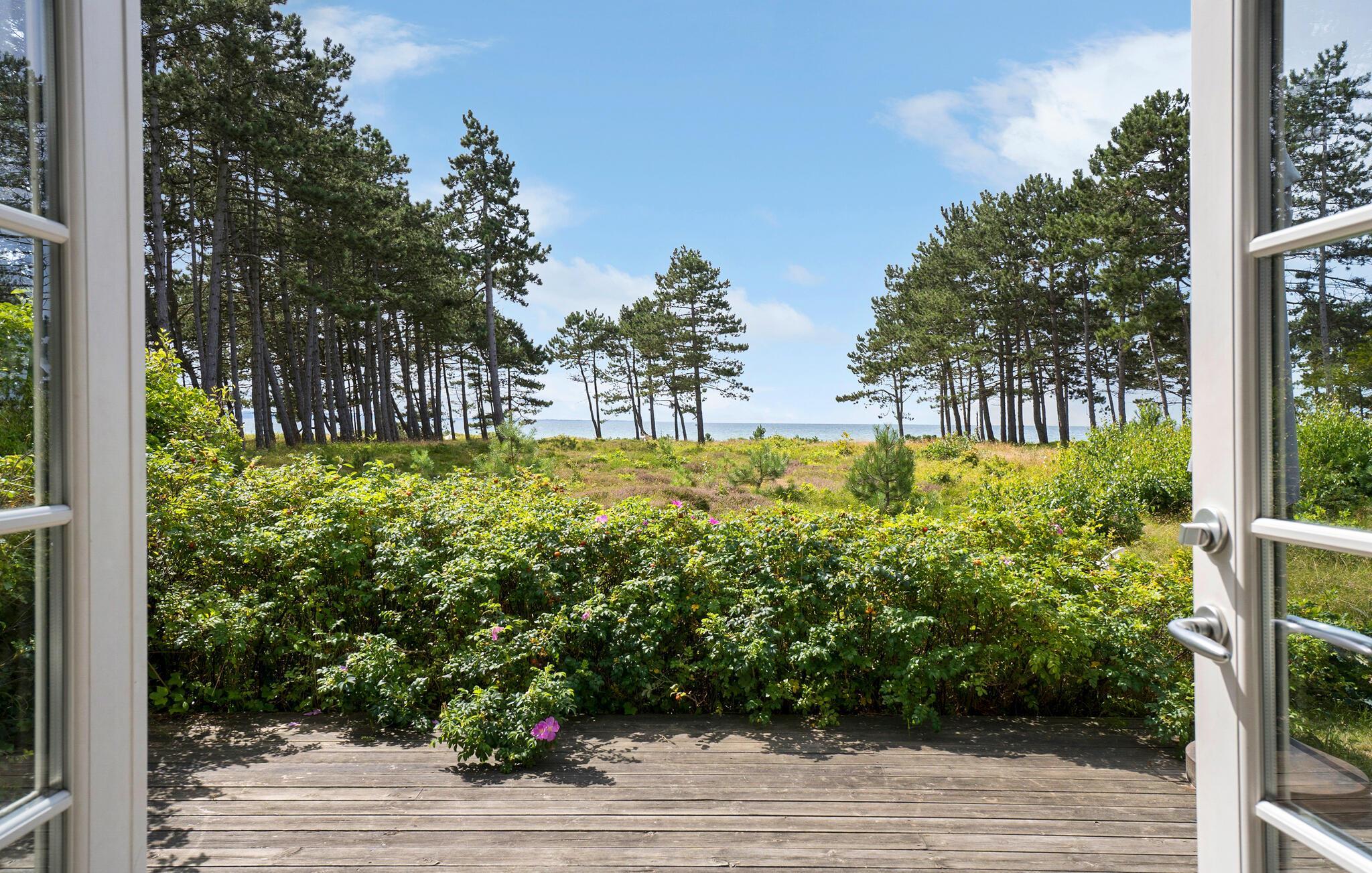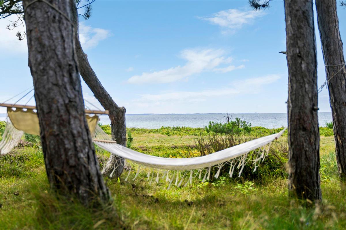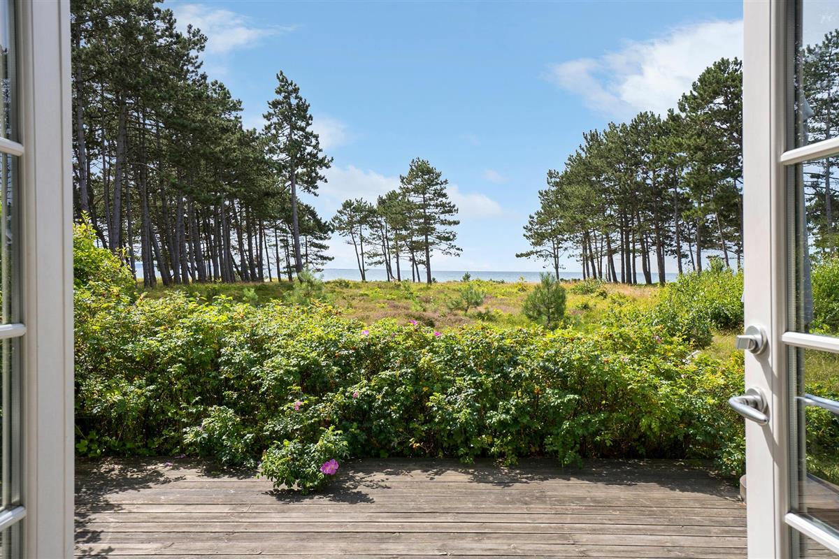 Ruim houten vakantiehuis direct aan Ebbeløkke Strand met open leefruimte, houtkachel en groot terras.