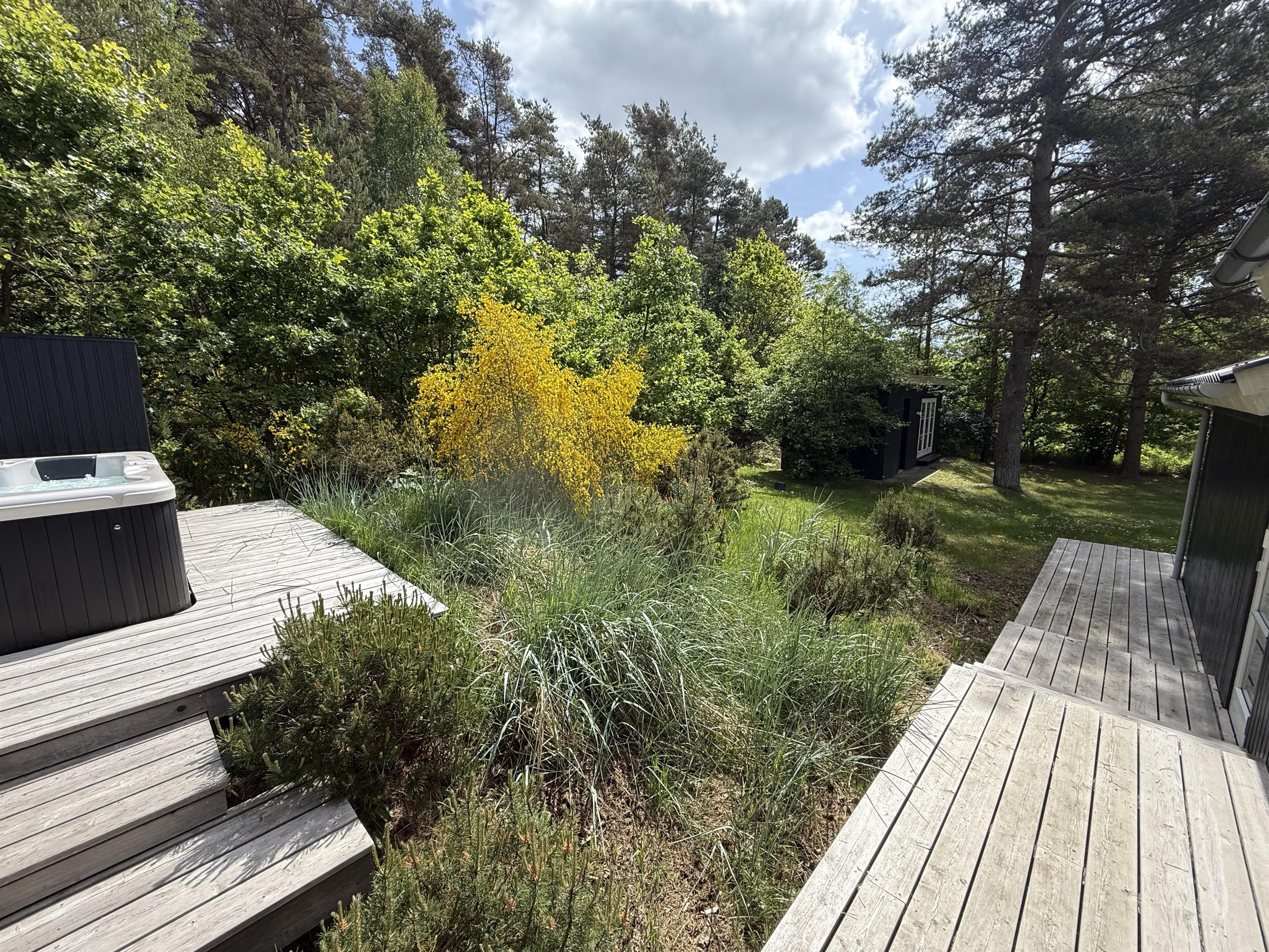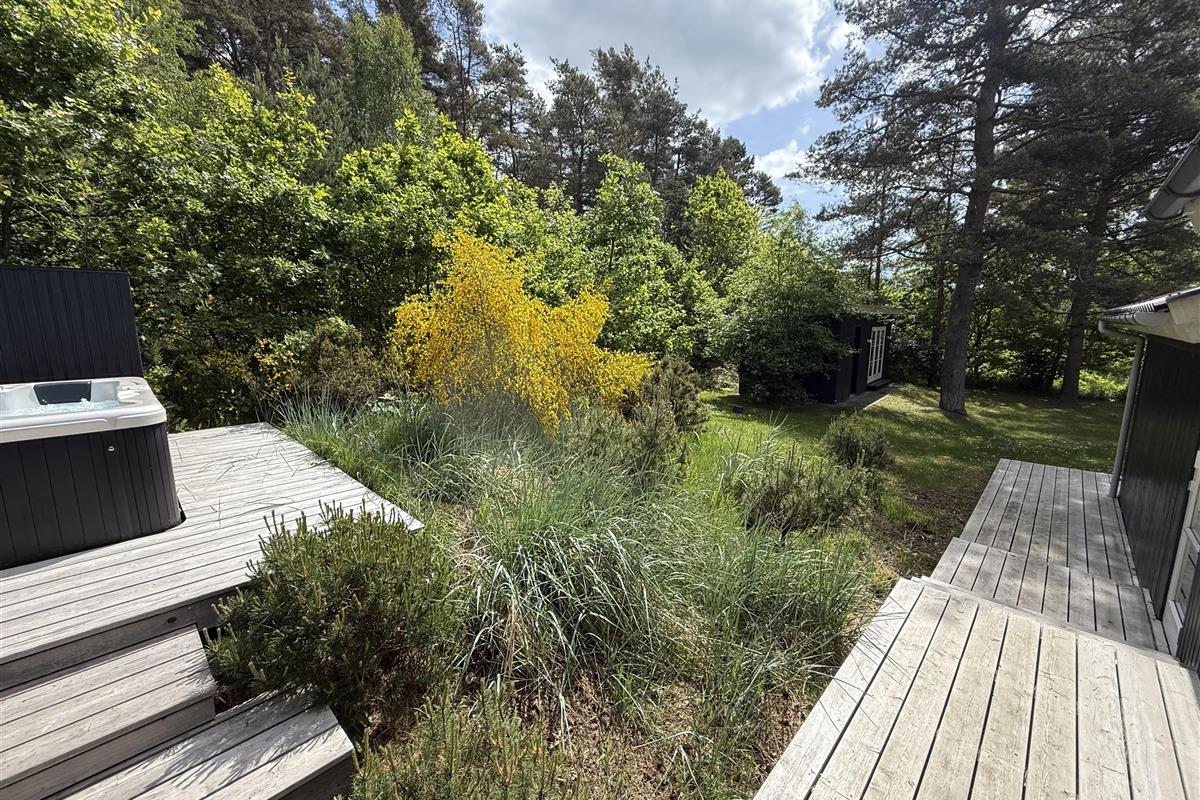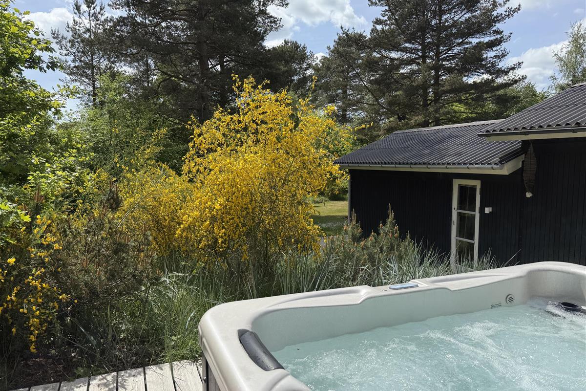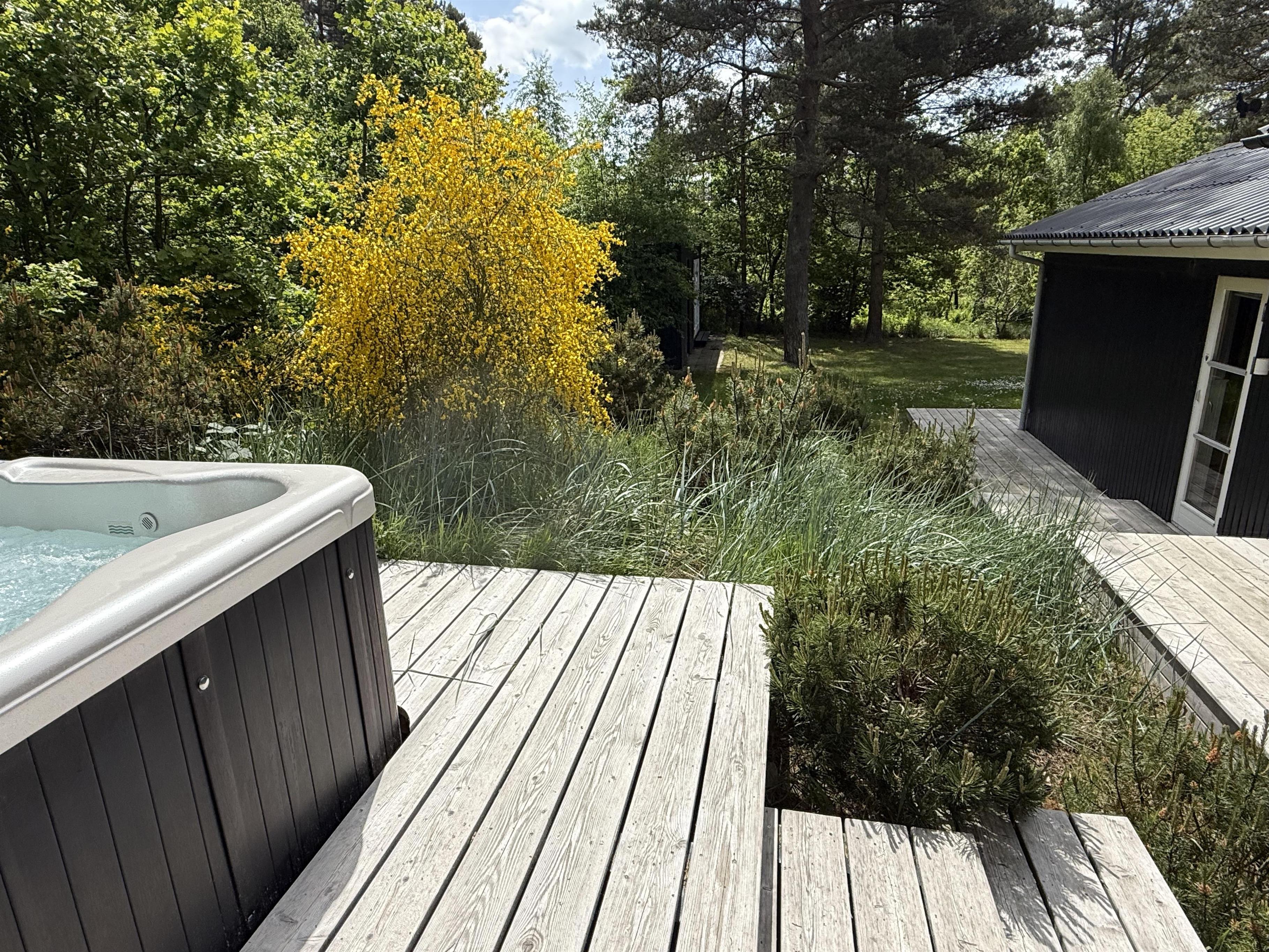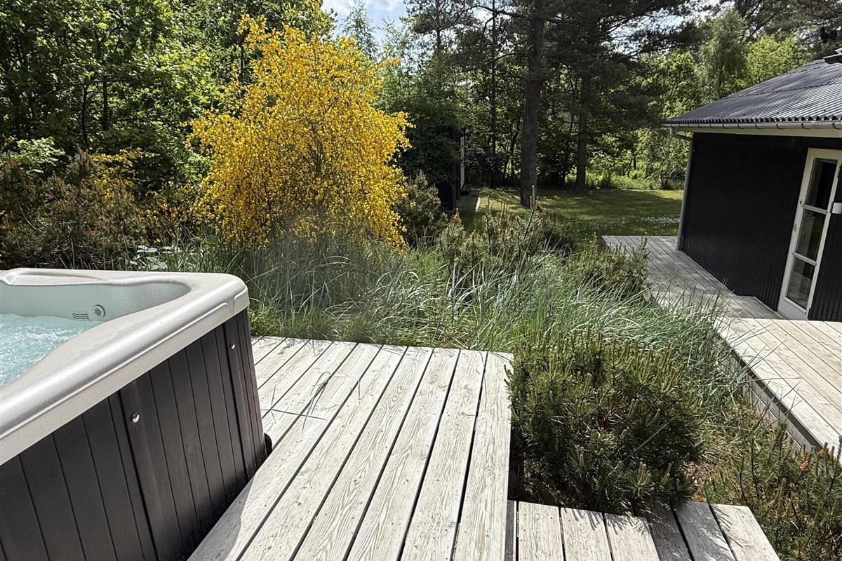 This exclusive holiday home for 10 people, located in the scenic area of Handrup Bakker, north of Ebeltoft, offers everything the heart desires for a perfect vacation. Not only will you experience a stylish, modern interior exuding romance and nostalgia, but also luxurious amenities like a large outdoor hot tub, perfect for the most delightful wellness experiences under the open sky. The spacious, lovely, and brand-new wooden terrace is set in different levels, offering both sun and shade, as well as comfortable garden furniture, a grill, and a parasol. Additionally, there is an outdoor shower, and the property also features a cozy campfire area.