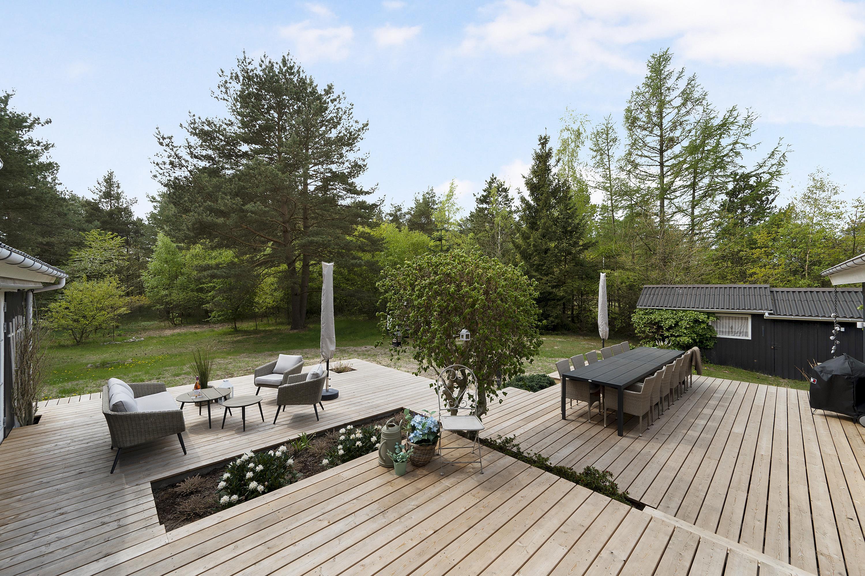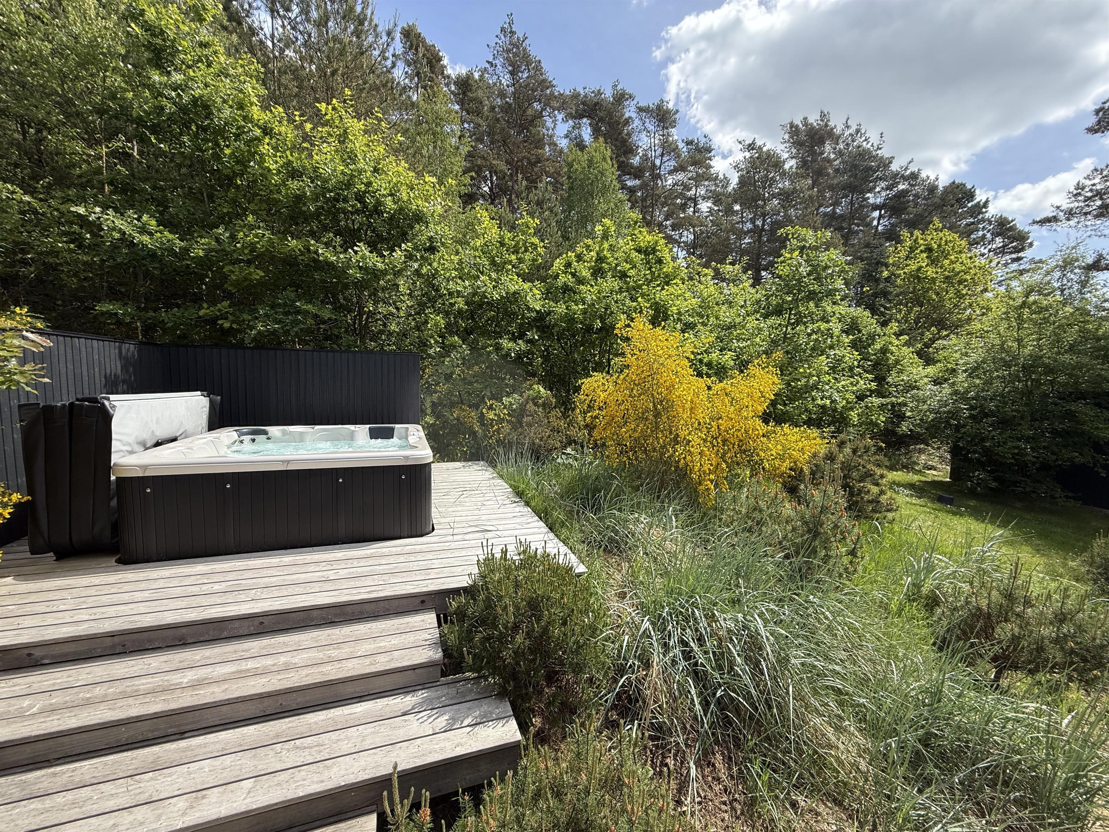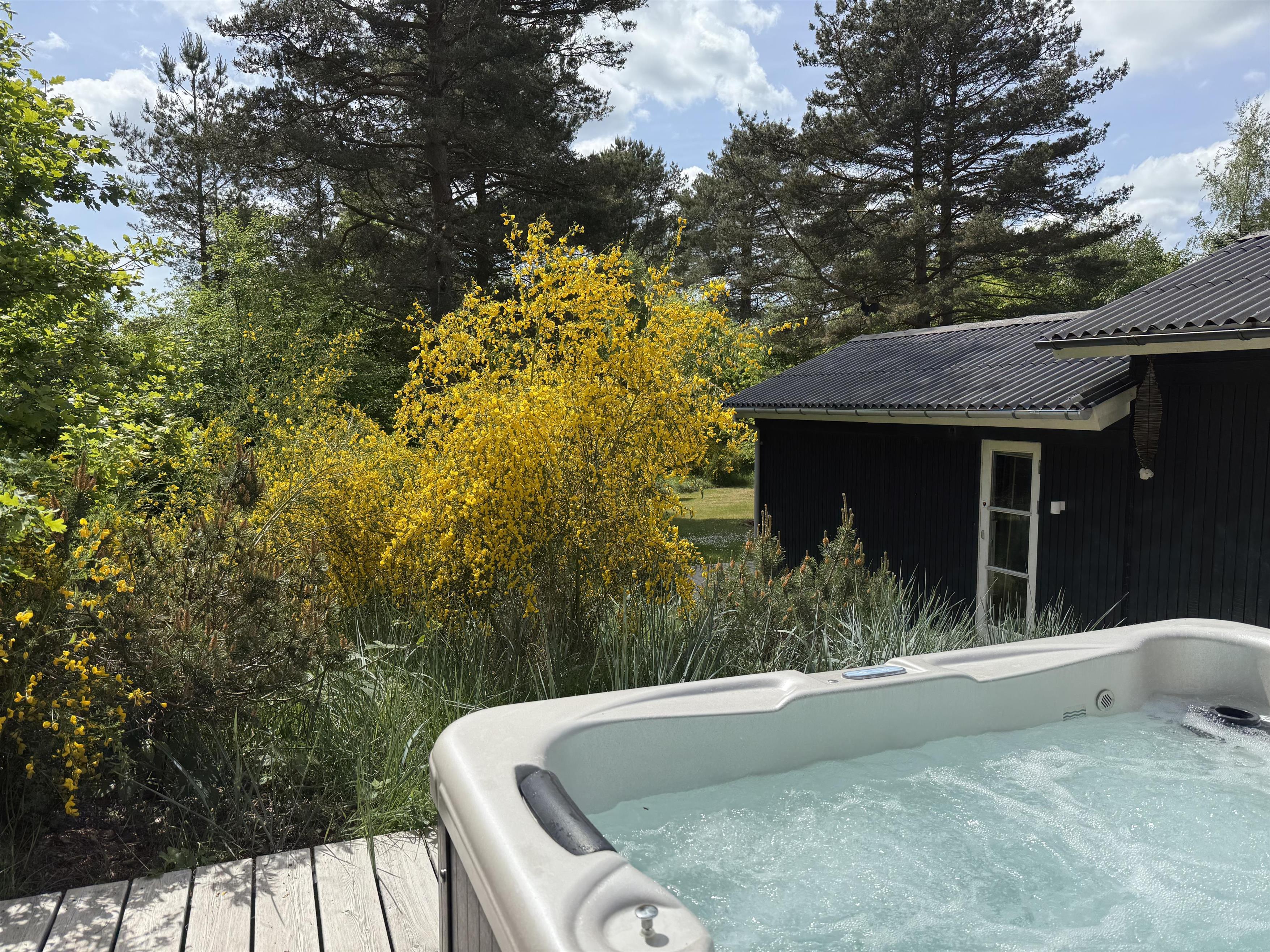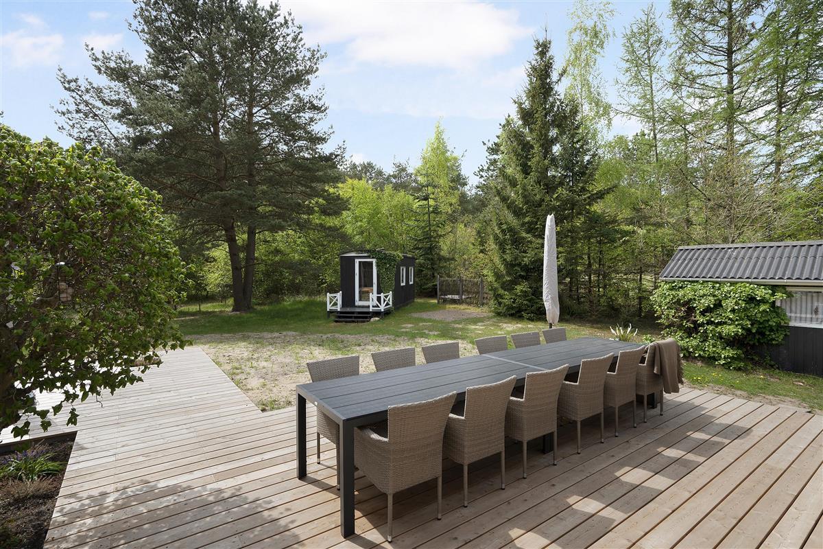 This exclusive holiday home for 10 people, located in the scenic area of Handrup Bakker, north of Ebeltoft, offers everything the heart desires for a perfect vacation. Not only will you experience a stylish, modern interior exuding romance and nostalgia, but also luxurious amenities like a large outdoor hot tub, perfect for the most delightful wellness experiences under the open sky. The spacious, lovely, and brand-new wooden terrace is set in different levels, offering both sun and shade, as well as comfortable garden furniture, a grill, and a parasol. Additionally, there is an outdoor shower, and the property also features a cozy campfire area.