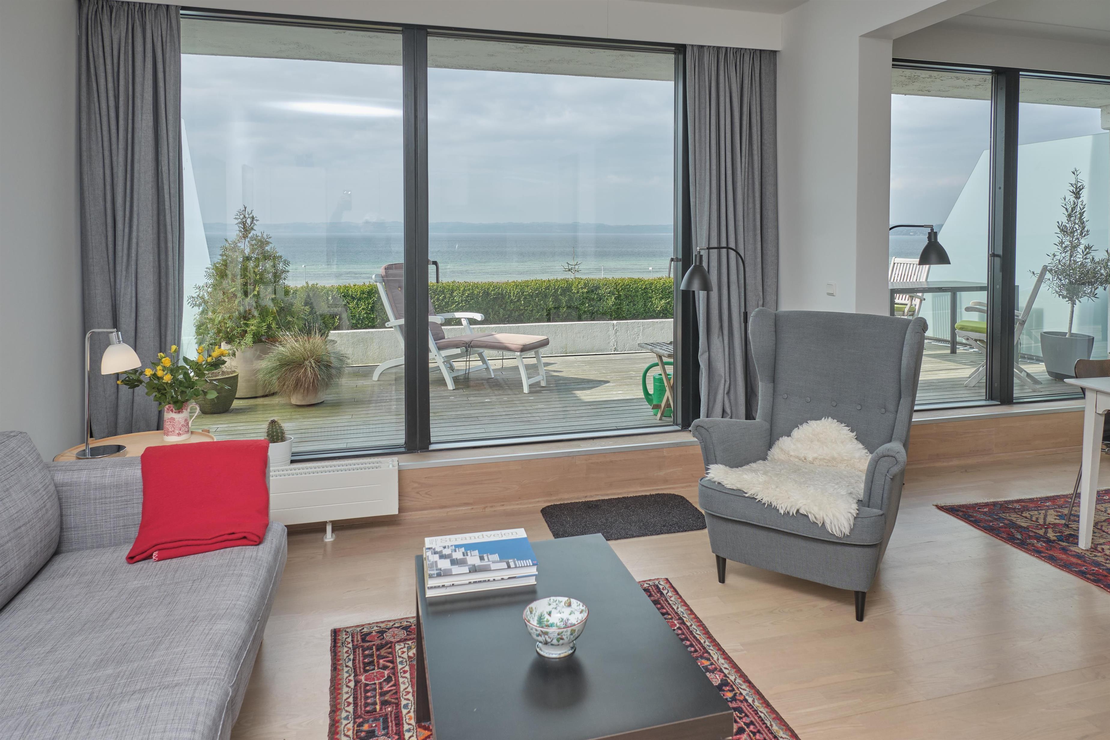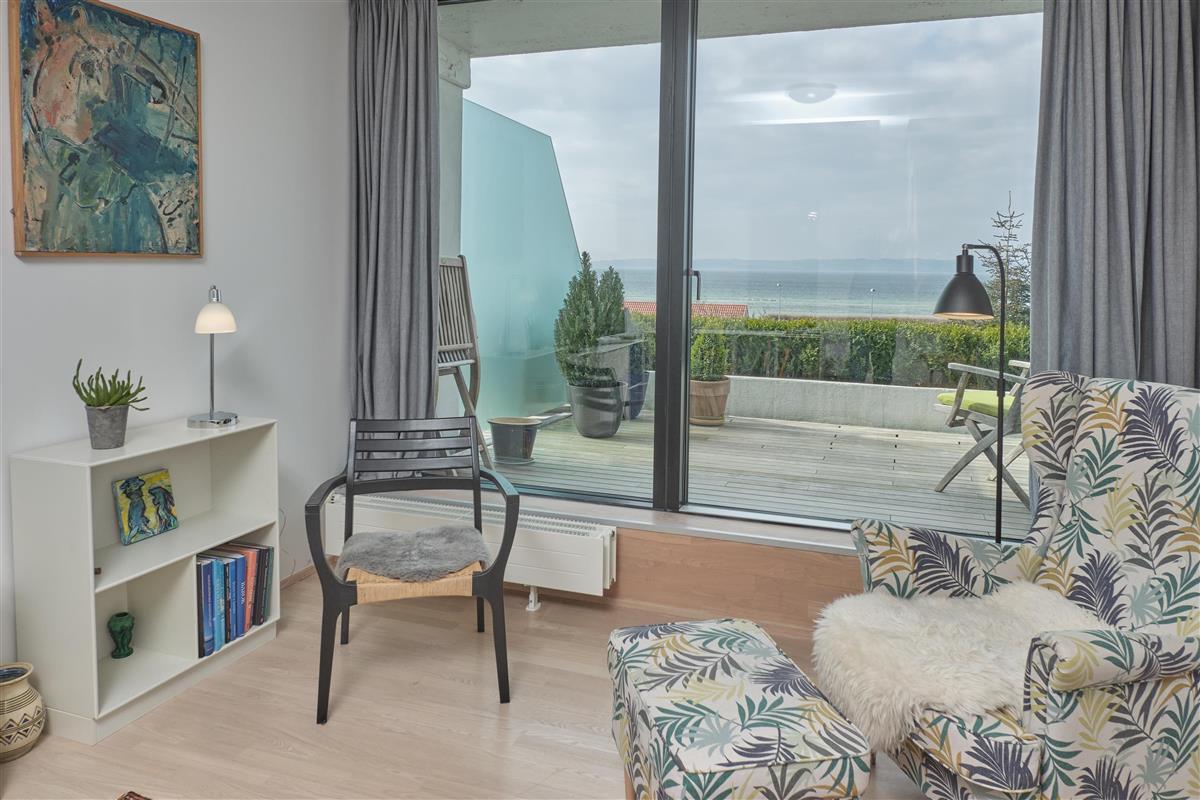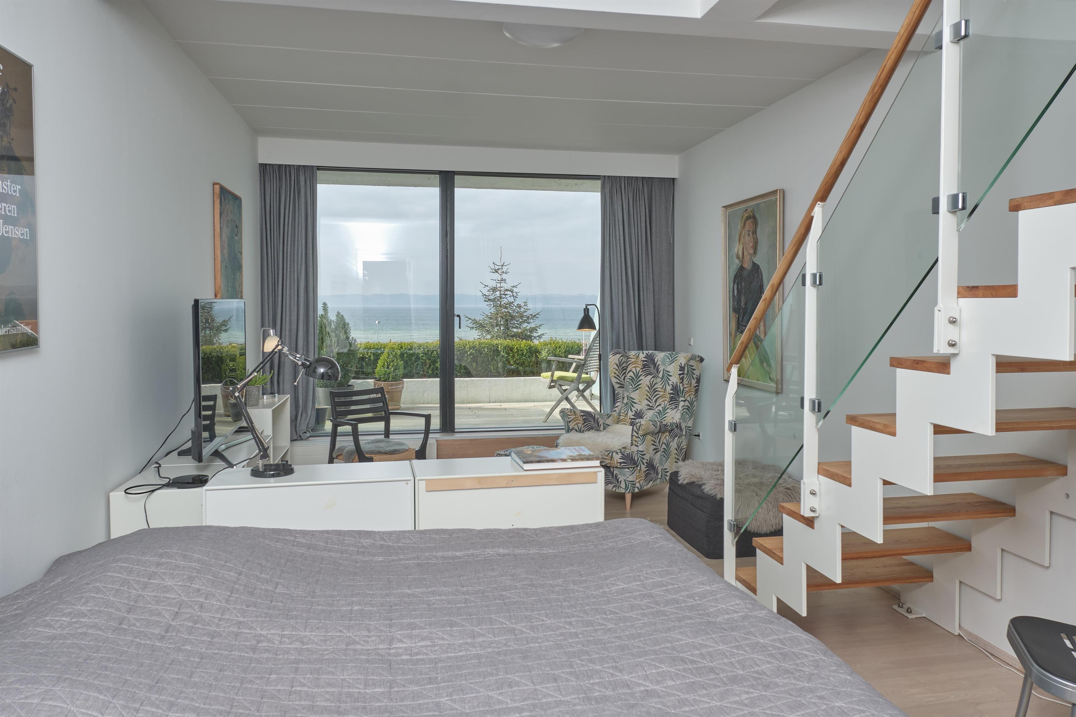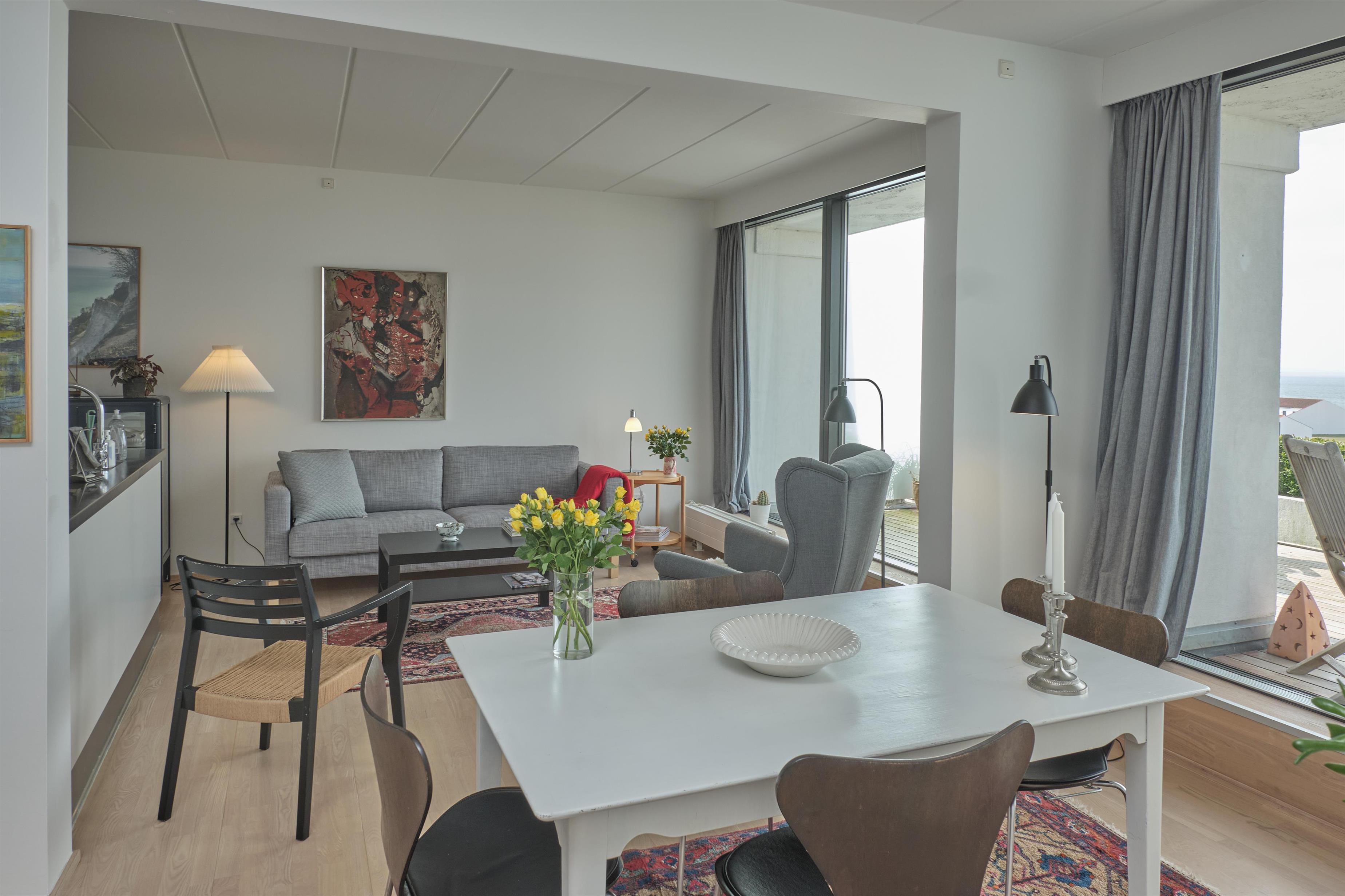 From the entrance, you enter the large, bright, and beautifully furnished living room with panoramic windows and access to the balcony. The living area offers a dining space for 4 people and a comfortable seating area. The fully equipped kitchen, with plenty of workspace, is open to the living room and features ceramic hob, oven, fridge/freezer, and dishwasher. A staircase from the living room leads down to the lower floor, where you will find a cozy lounge and an en-suite bedroom with TV including Danish (TV2) and German channels, plus its own balcony.