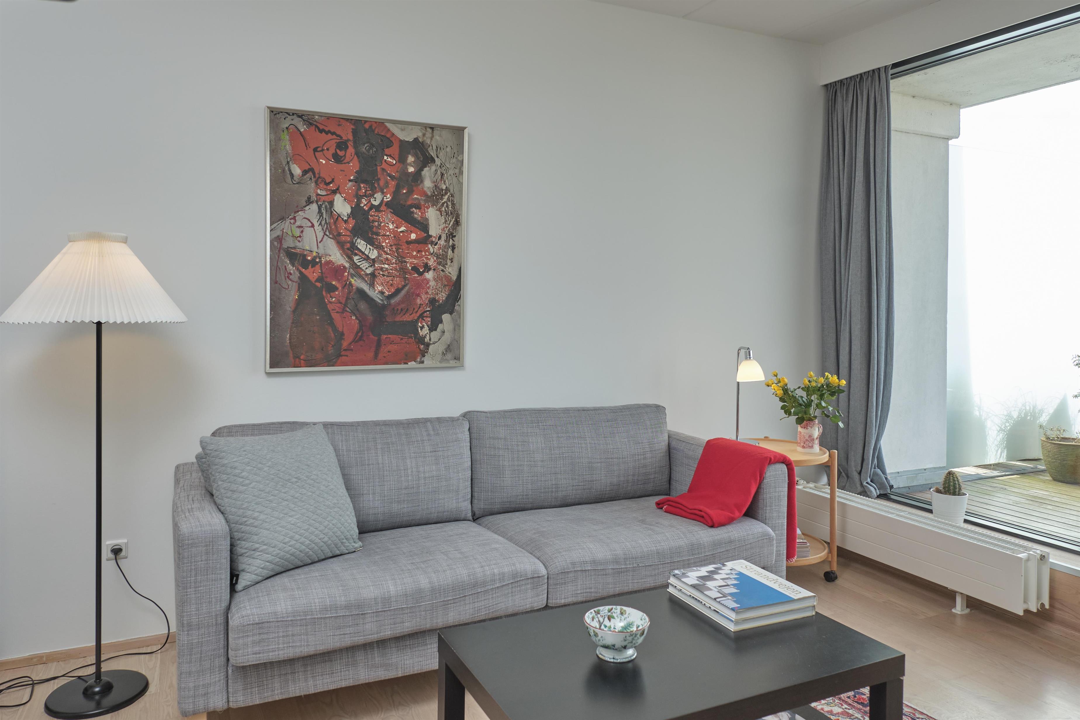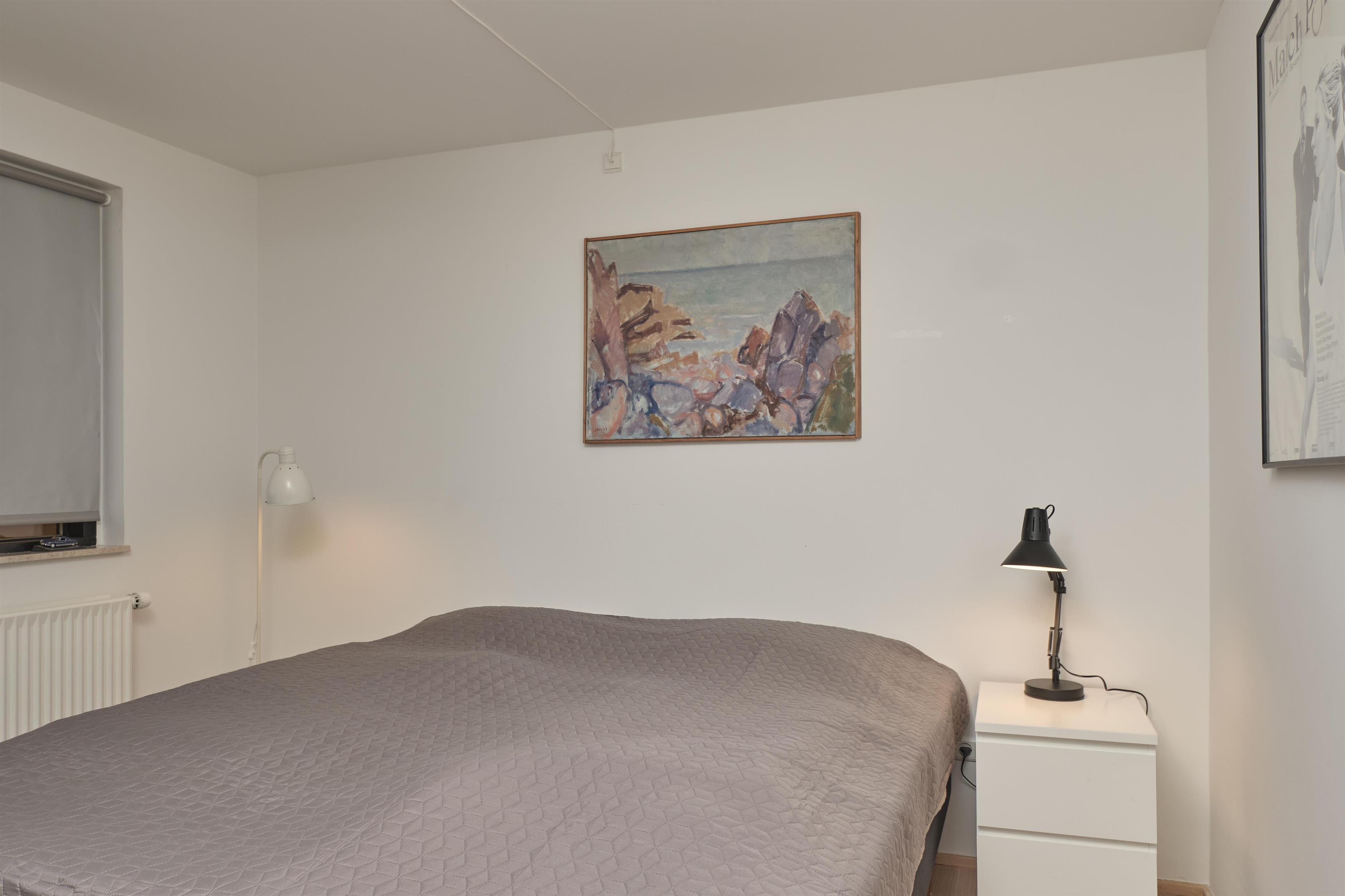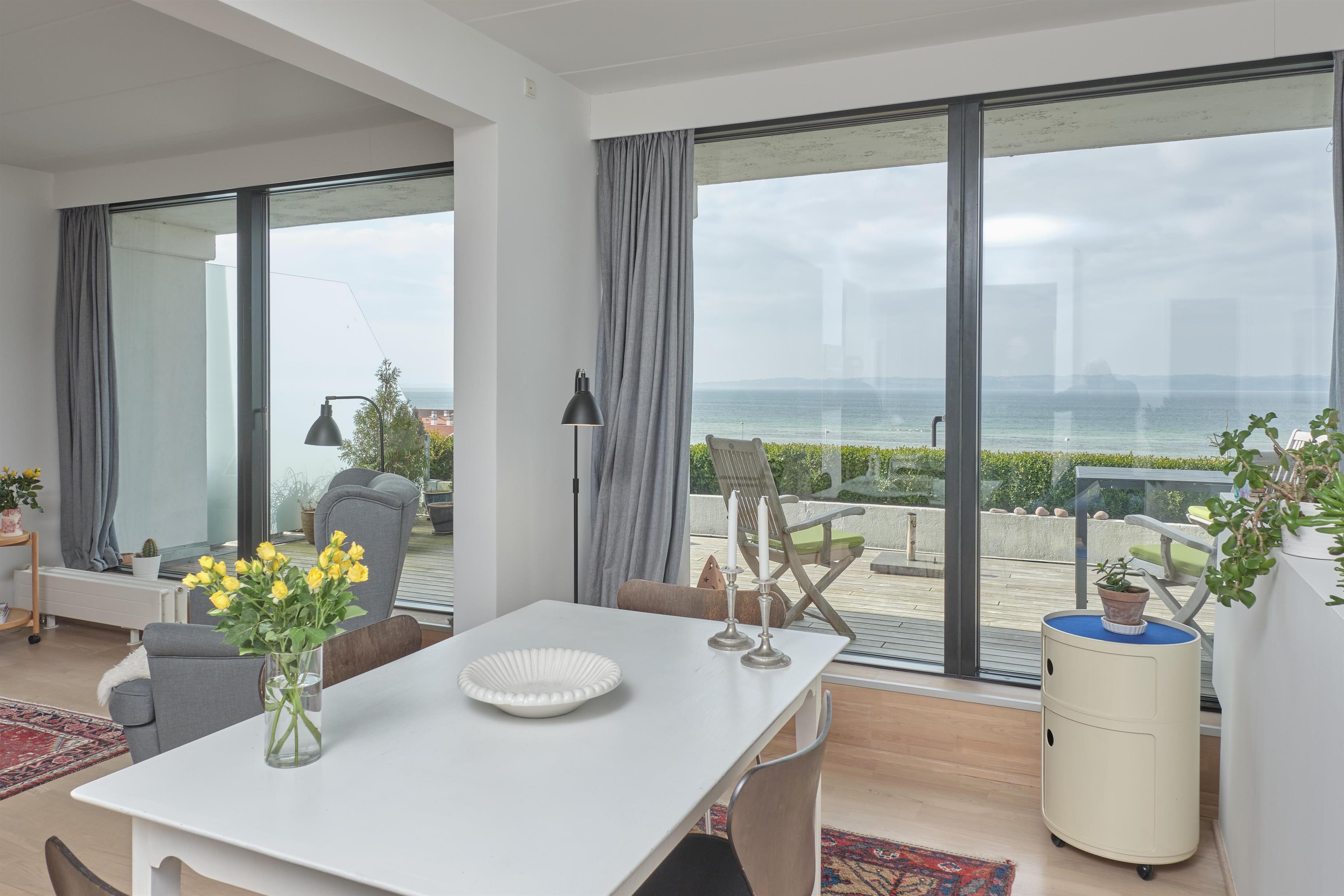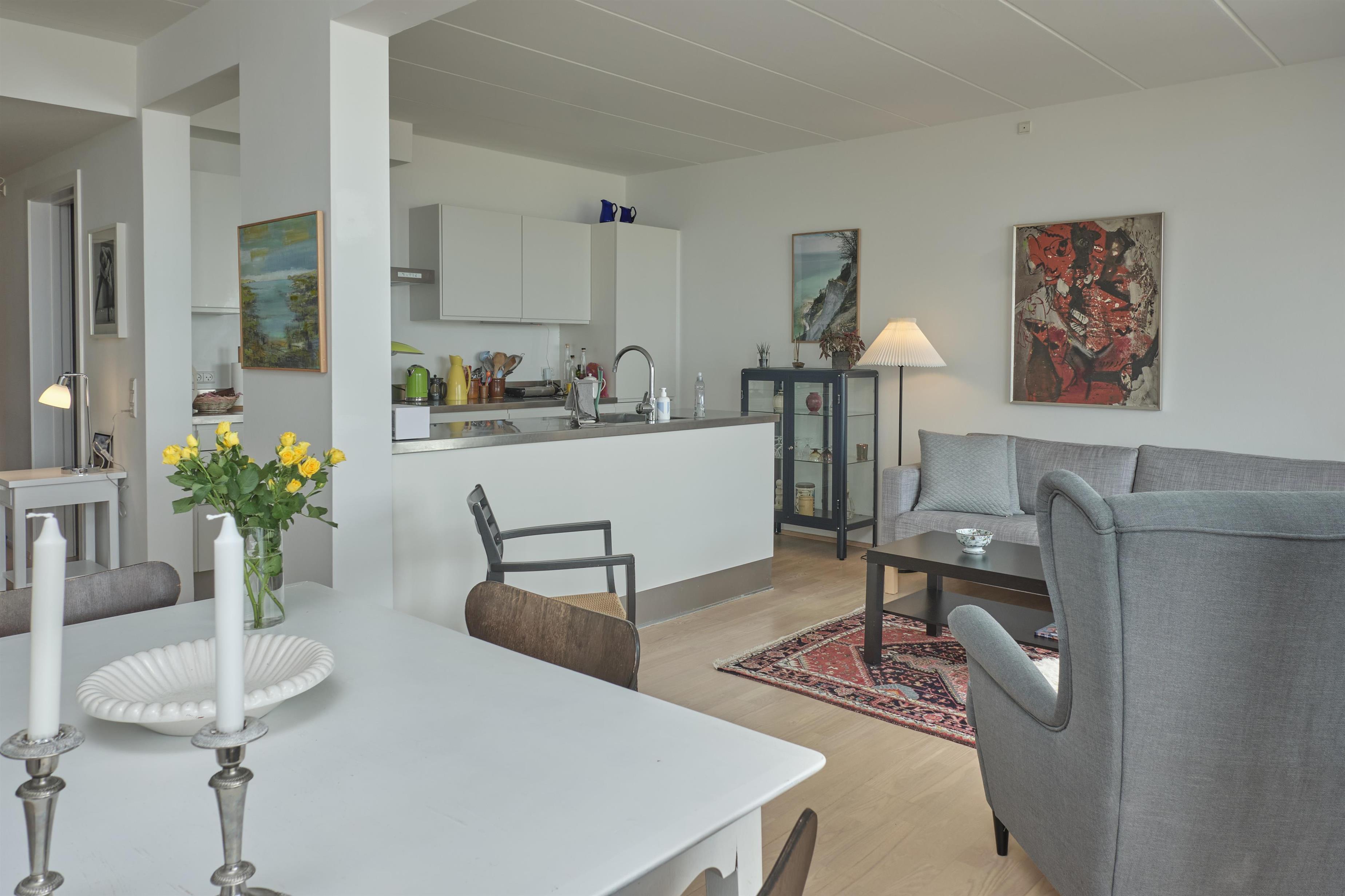 From the entrance, you enter the large, bright, and beautifully furnished living room with panoramic windows and access to the balcony. The living area offers a dining space for 4 people and a comfortable seating area. The fully equipped kitchen, with plenty of workspace, is open to the living room and features ceramic hob, oven, fridge/freezer, and dishwasher. A staircase from the living room leads down to the lower floor, where you will find a cozy lounge and an en-suite bedroom with TV including Danish (TV2) and German channels, plus its own balcony.