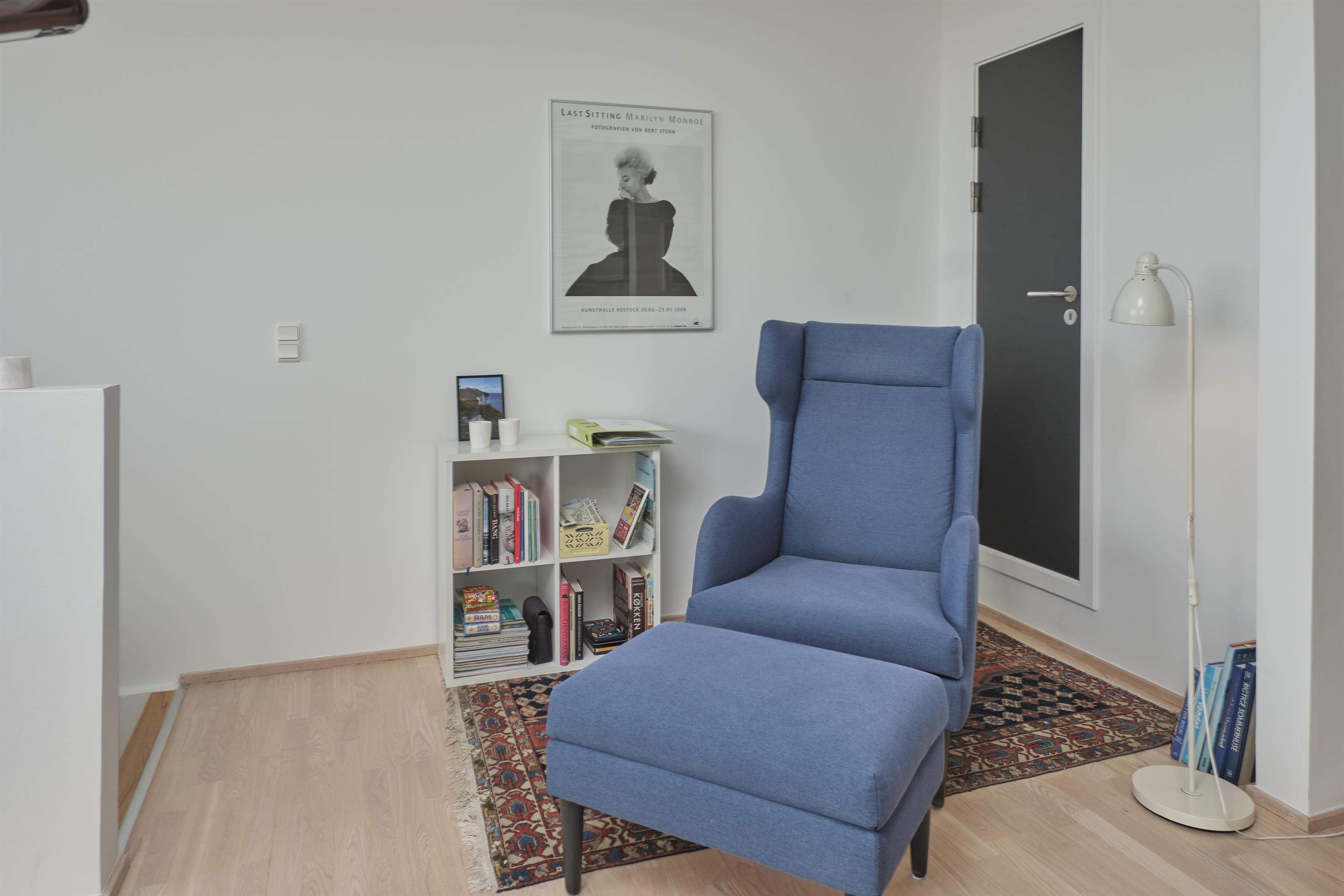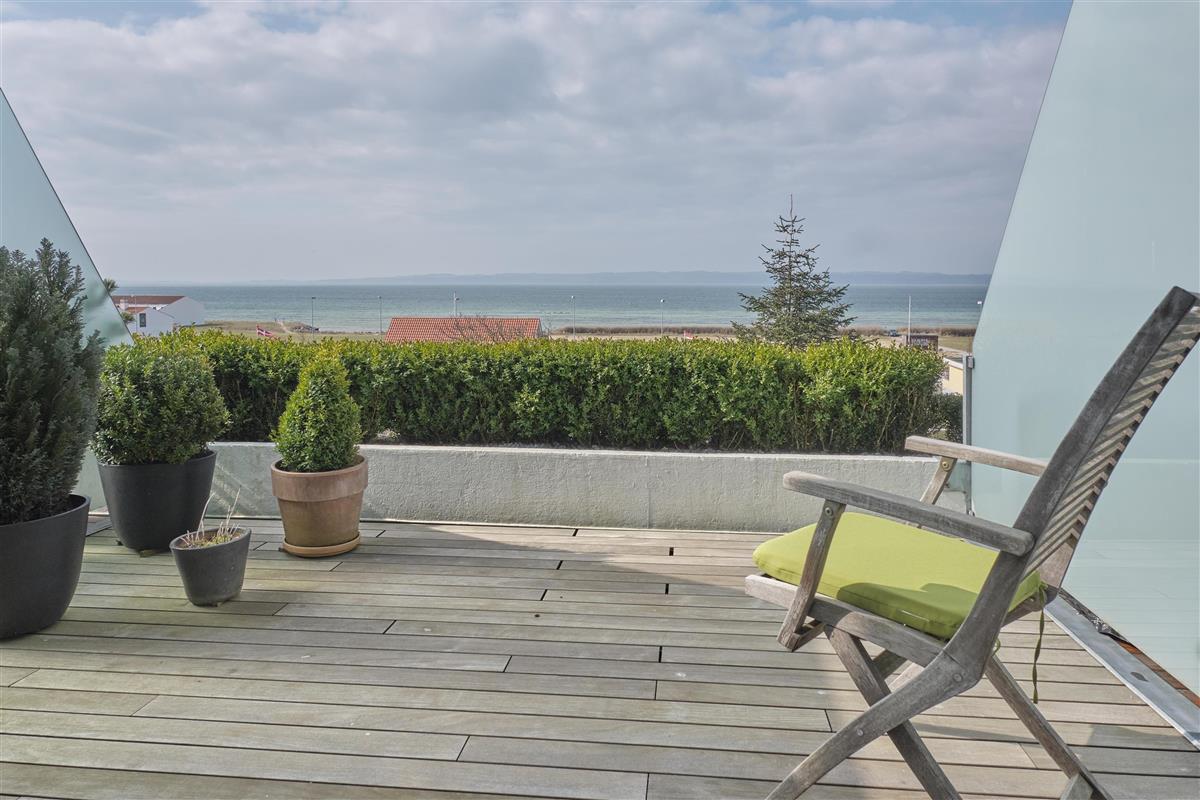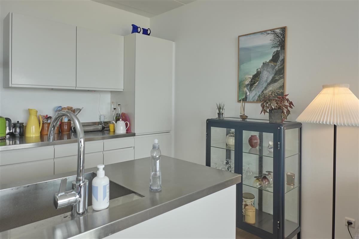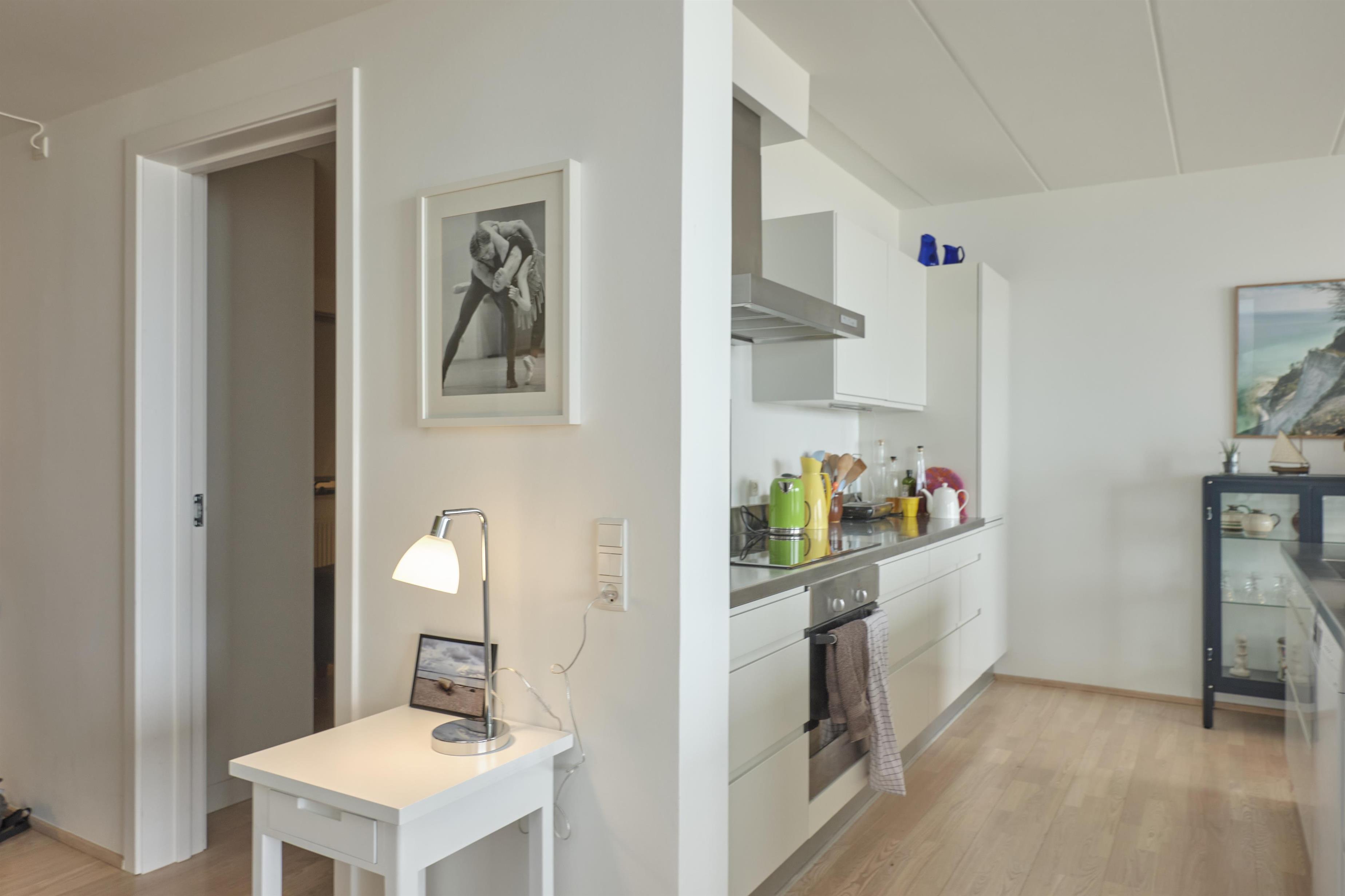From the entrance, you enter the large, bright, and beautifully furnished living room with panoramic windows and access to the balcony. The living area offers a dining space for 4 people and a comfortable seating area. The fully equipped kitchen, with plenty of workspace, is open to the living room and features ceramic hob, oven, fridge/freezer, and dishwasher. A staircase from the living room leads down to the lower floor, where you will find a cozy lounge and an en-suite bedroom with TV including Danish (TV2) and German channels, plus its own balcony.