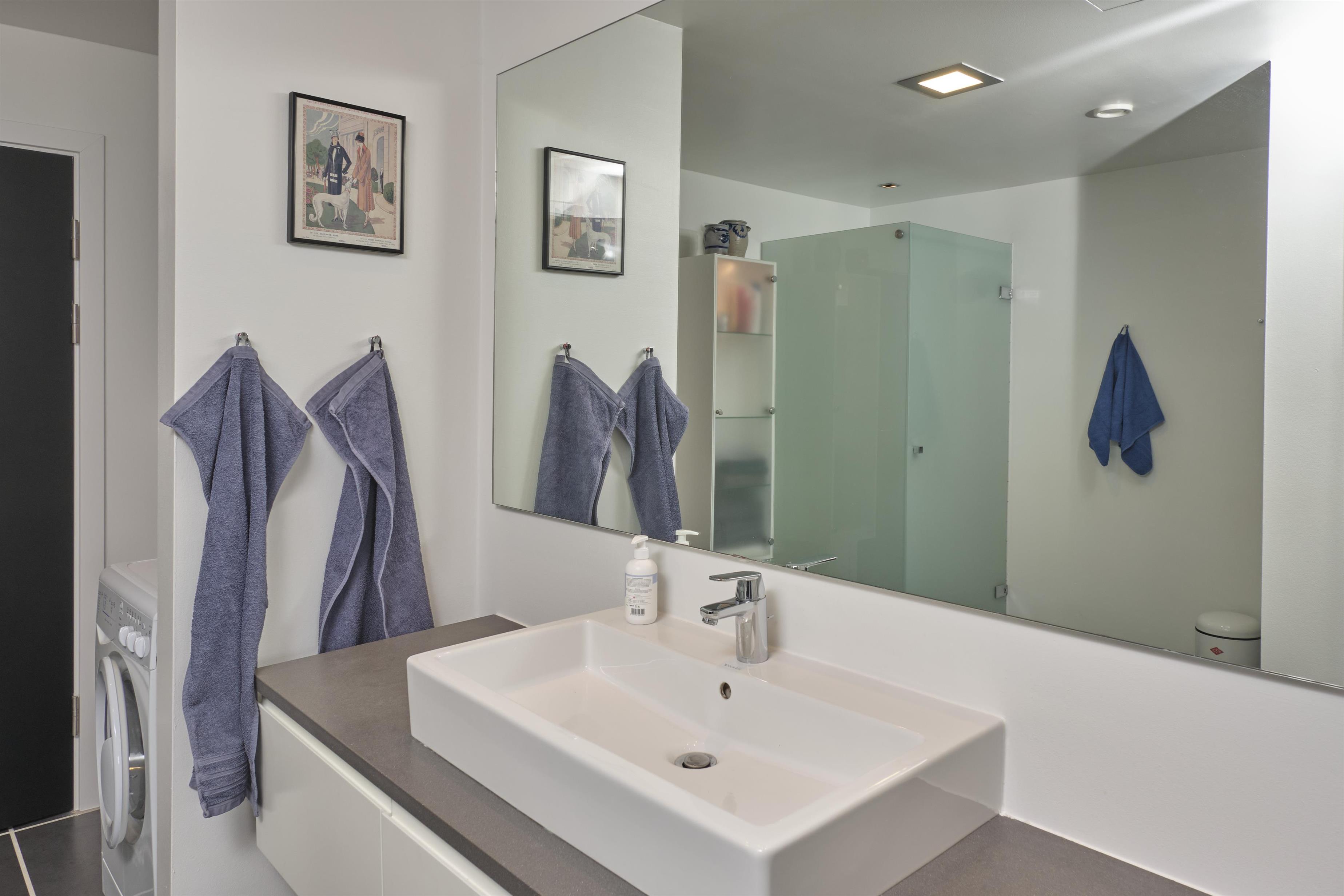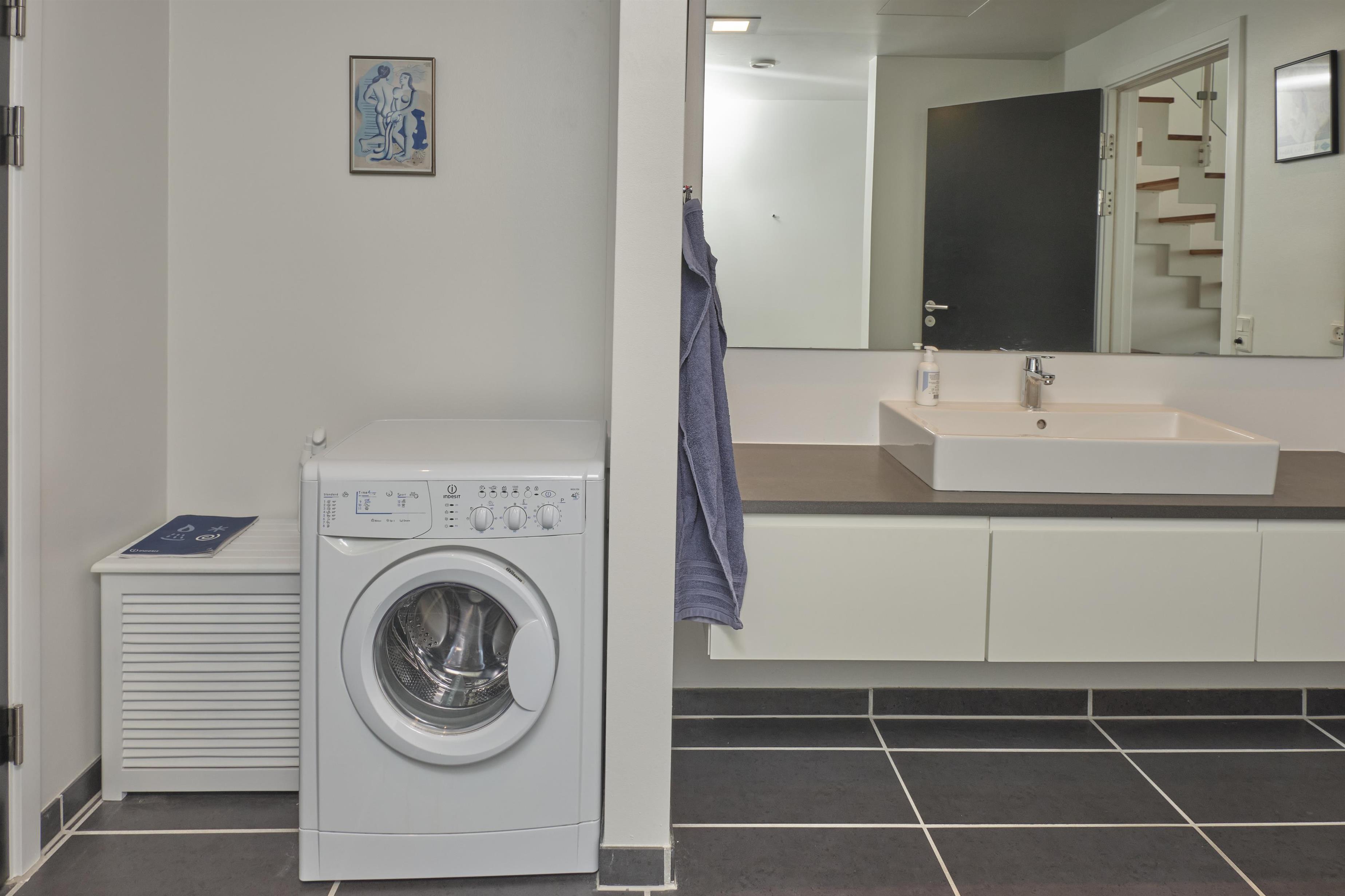 The apartment accommodates 4 guests in total, with one bedroom on the first floor and one on the lower floor, both furnished with high-quality beds (double bed or 2 single beds, 90 cm wide, with latex mattresses). Both floors have a stylish bathroom with a shower, and the lower floor bathroom also includes a washing machine. Internet access is available.
