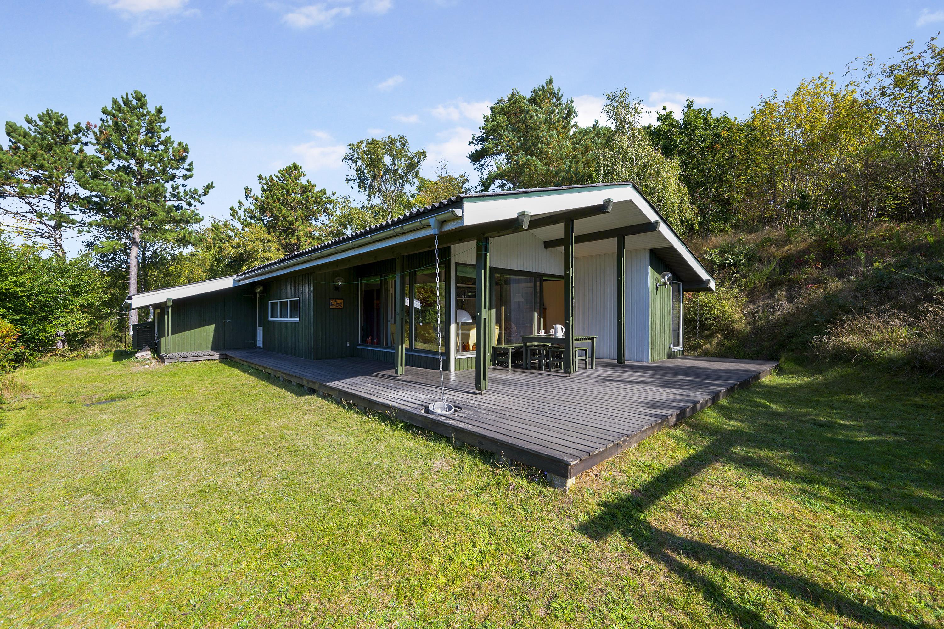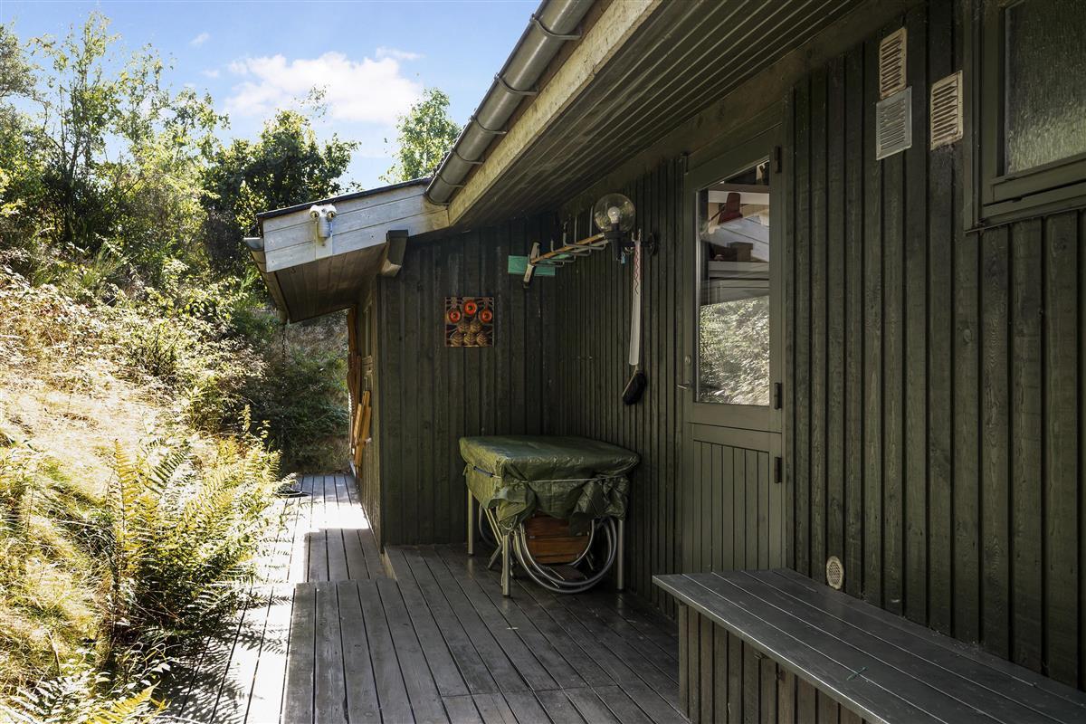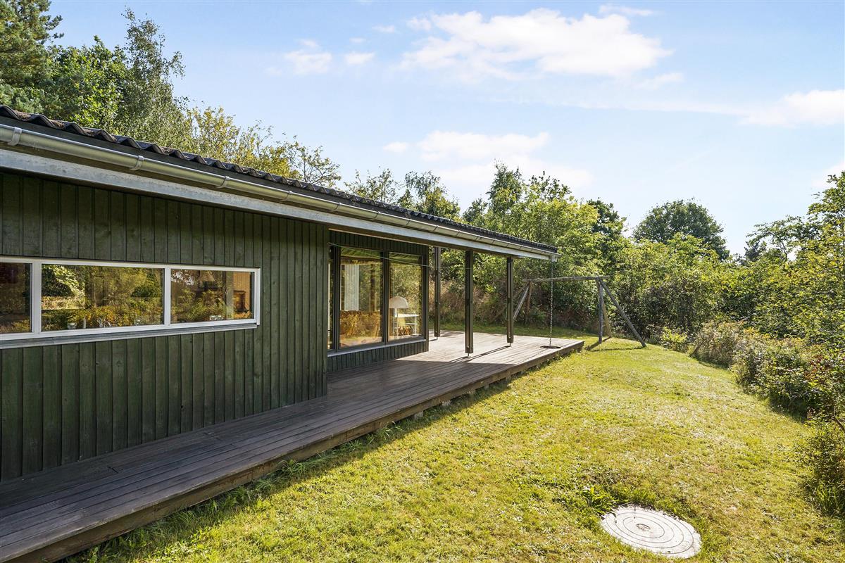 This well-maintained and continuously modernized house from 1974 is situated high and completely secluded on a hilly natural plot in a beautiful cottage area in eastern Ebeltoft. There's a lovely partially covered south and west-facing wooden terrace on three sides of the house with garden furniture, sun loungers, a parasol, and a grill. On the large plot, there are swings for the children.