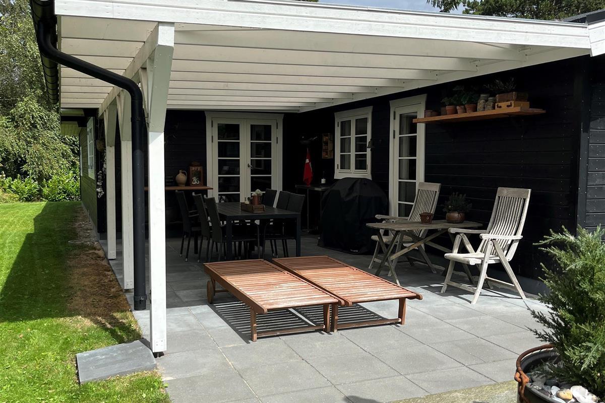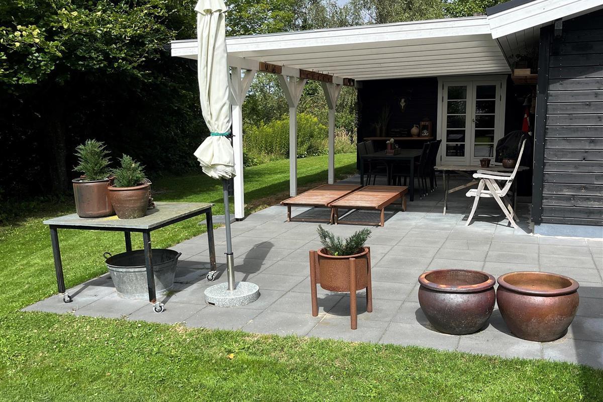 On a high-lying natural plot in the beautiful and quiet cottage area of Skelhøje Plantation in eastern Ebeltoft, this older, newly renovated, and truly lovely house is situated. Large, southwest-facing and partially covered tiled terrace with garden furniture, sun loungers, parasol, and grill. A small natural oasis within walking distance to the town and with a beautiful view over the very hilly terrain, where you can see grazing deer.