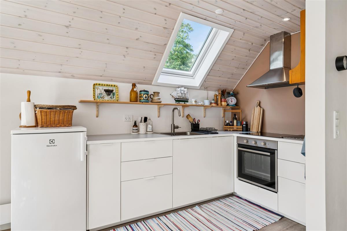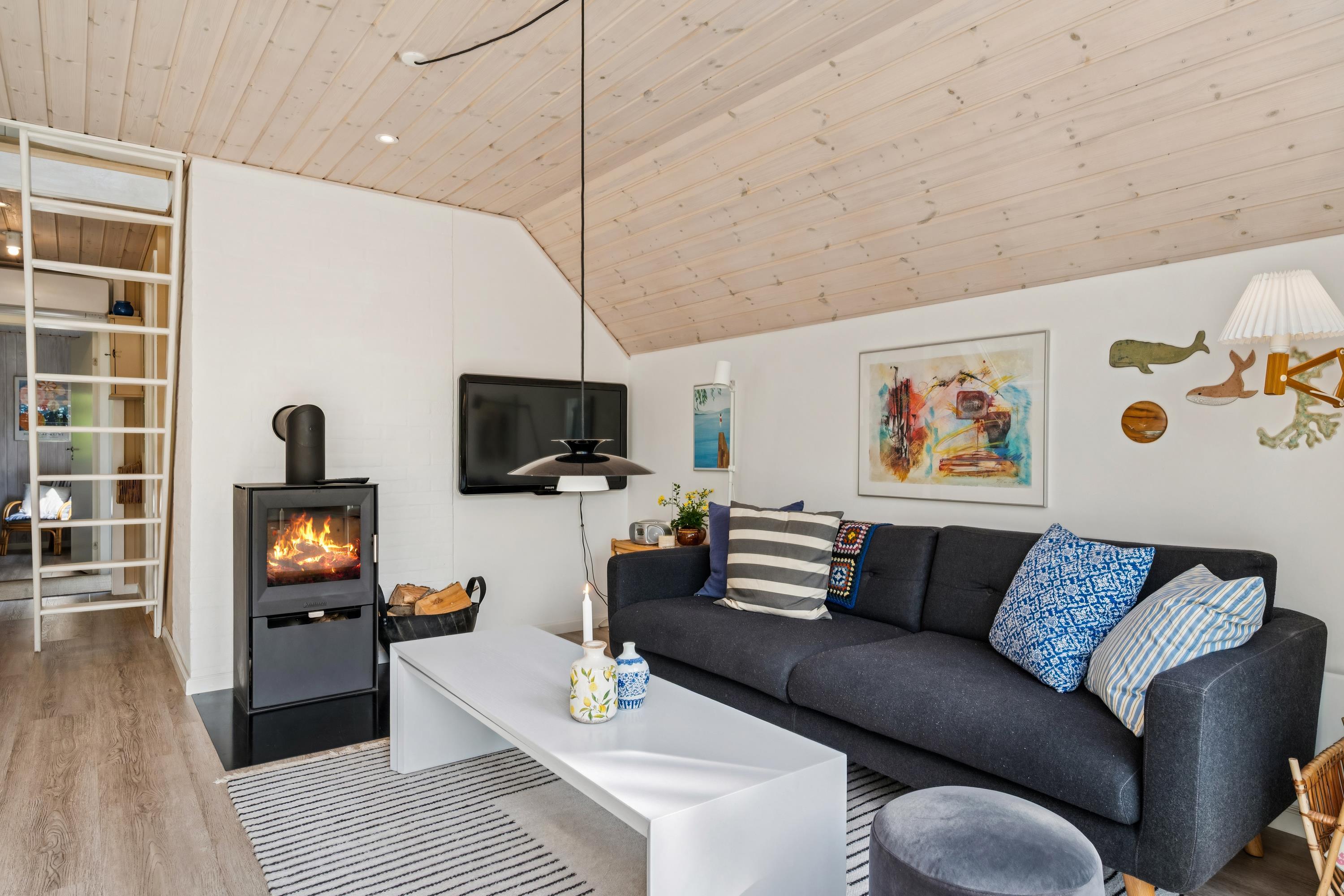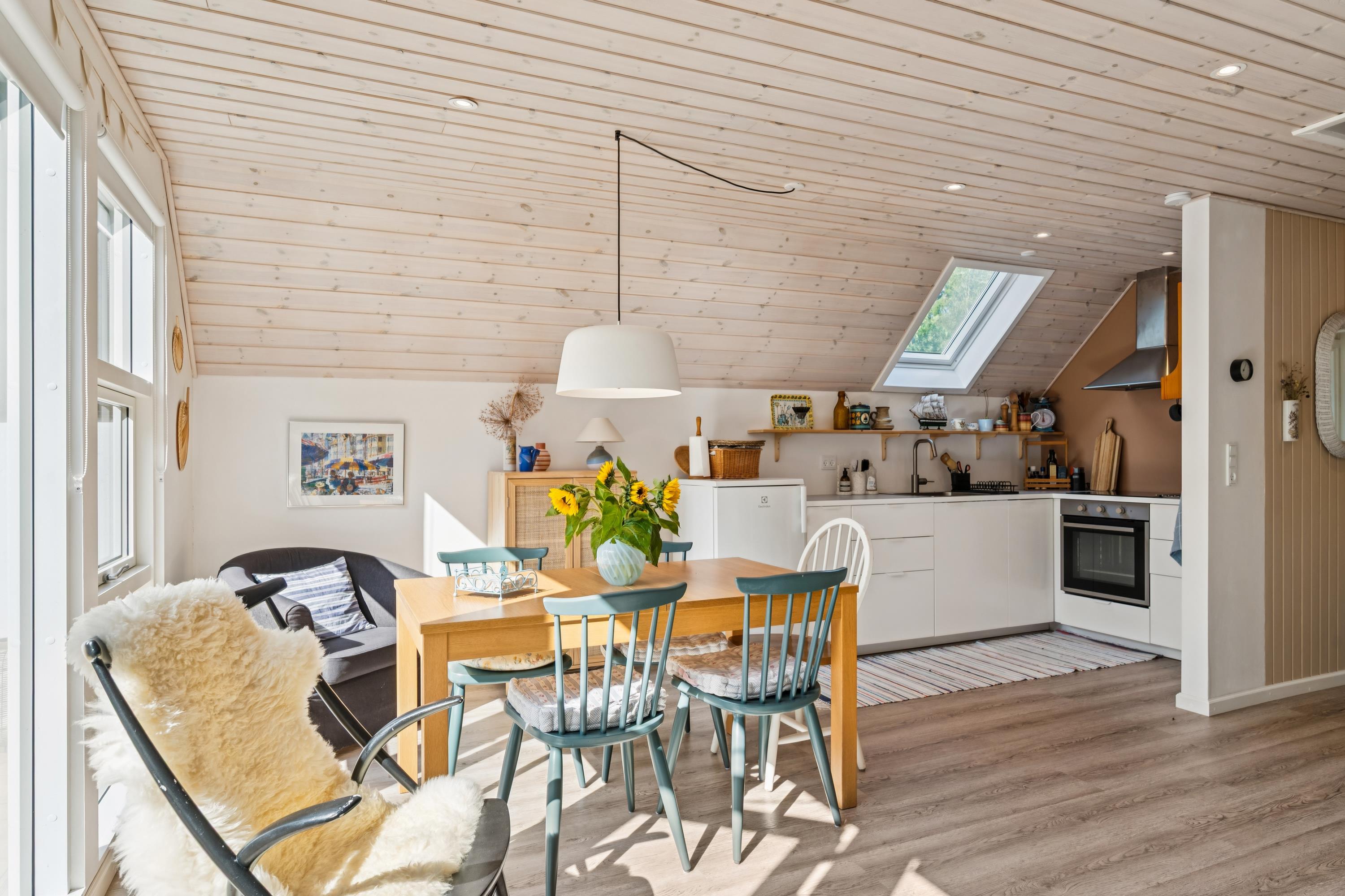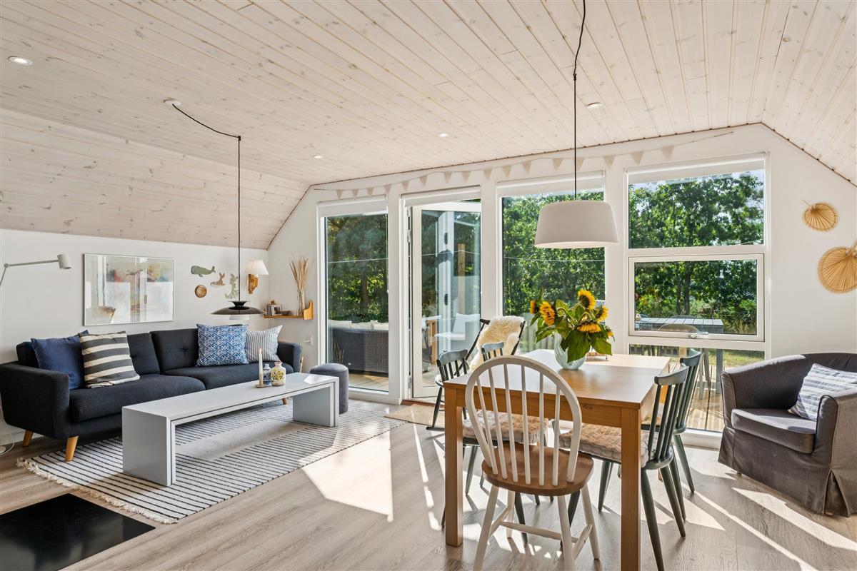 The moment you step through the door, you will feel the true holiday-home atmosphere in this particularly cosy and newly renovated cottage. Here you will find a charming and well-furnished living room featuring a wood-burning stove and a heat pump. Adjacent to the living room is a smaller but well-functioning kitchen. From the living room, there is access to a large terrace with quality garden furniture. The modern bathroom comes with a spacious shower. The sleeping arrangements include two cosy bedrooms – one with a double bed and one with a single bed. In addition, there are two extra sleeping places on good mattresses in the loft. TV is available via Chromecast. The house is situated on a beautiful natural plot, part of which has been left in a “rewilded” style, and offers two additional inviting terraces.