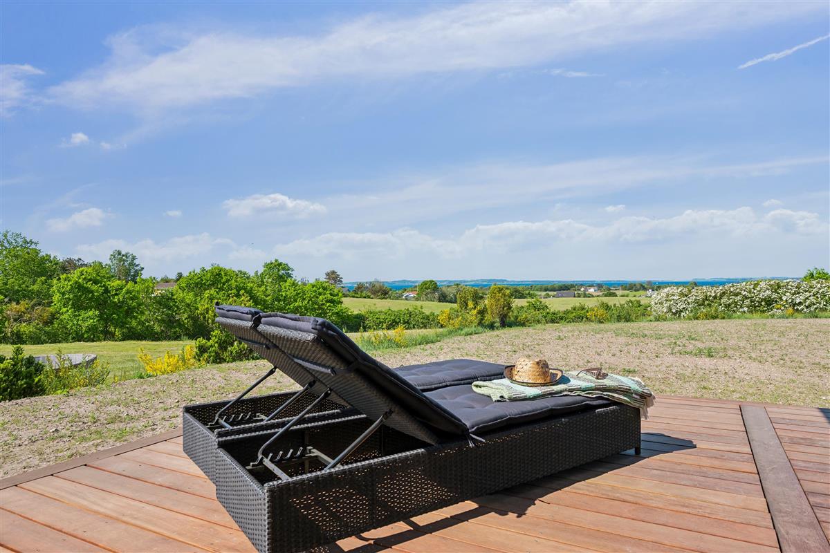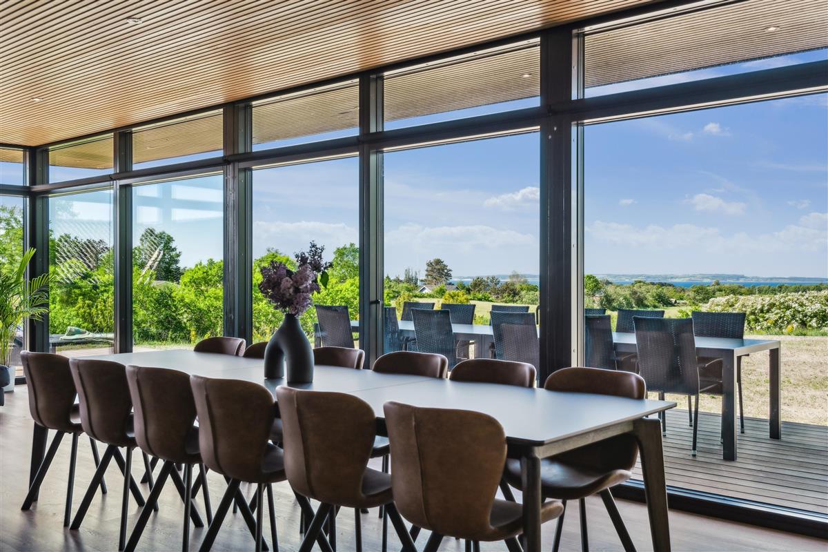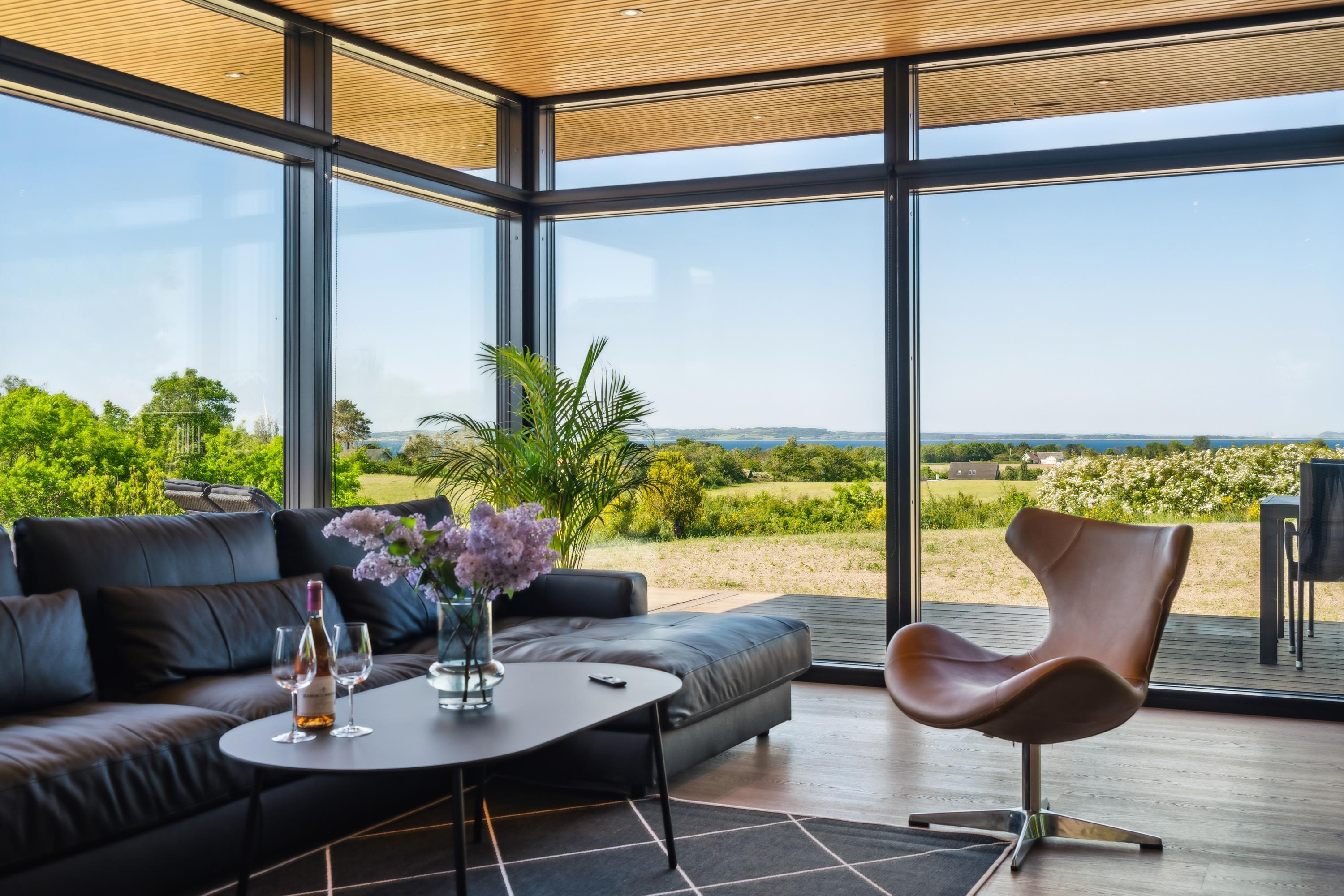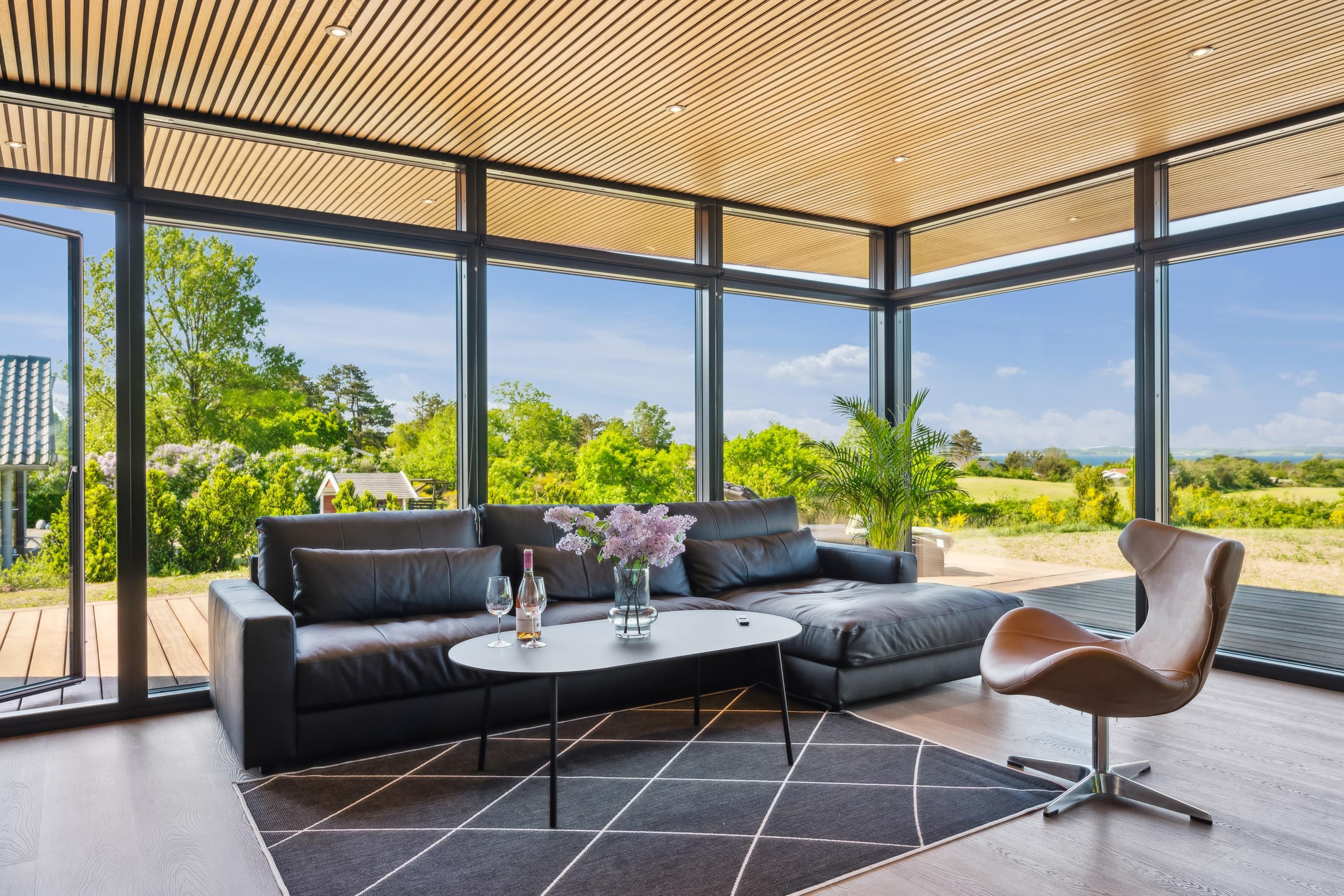 From the living room, you can also step out onto the large open terrace, which is furnished with comfortable seating, sun loungers, and offers a breathtaking view of the water – all the way to Aarhus Bay. The cozy living room is furnished with stylish furniture and features a large flat-screen TV.