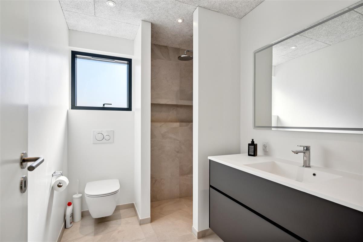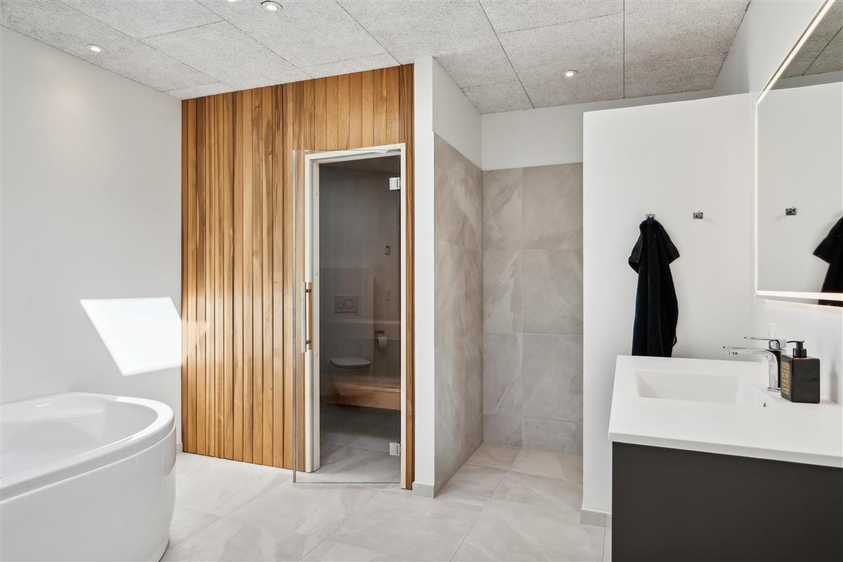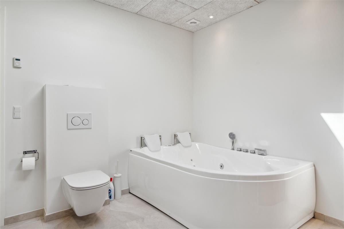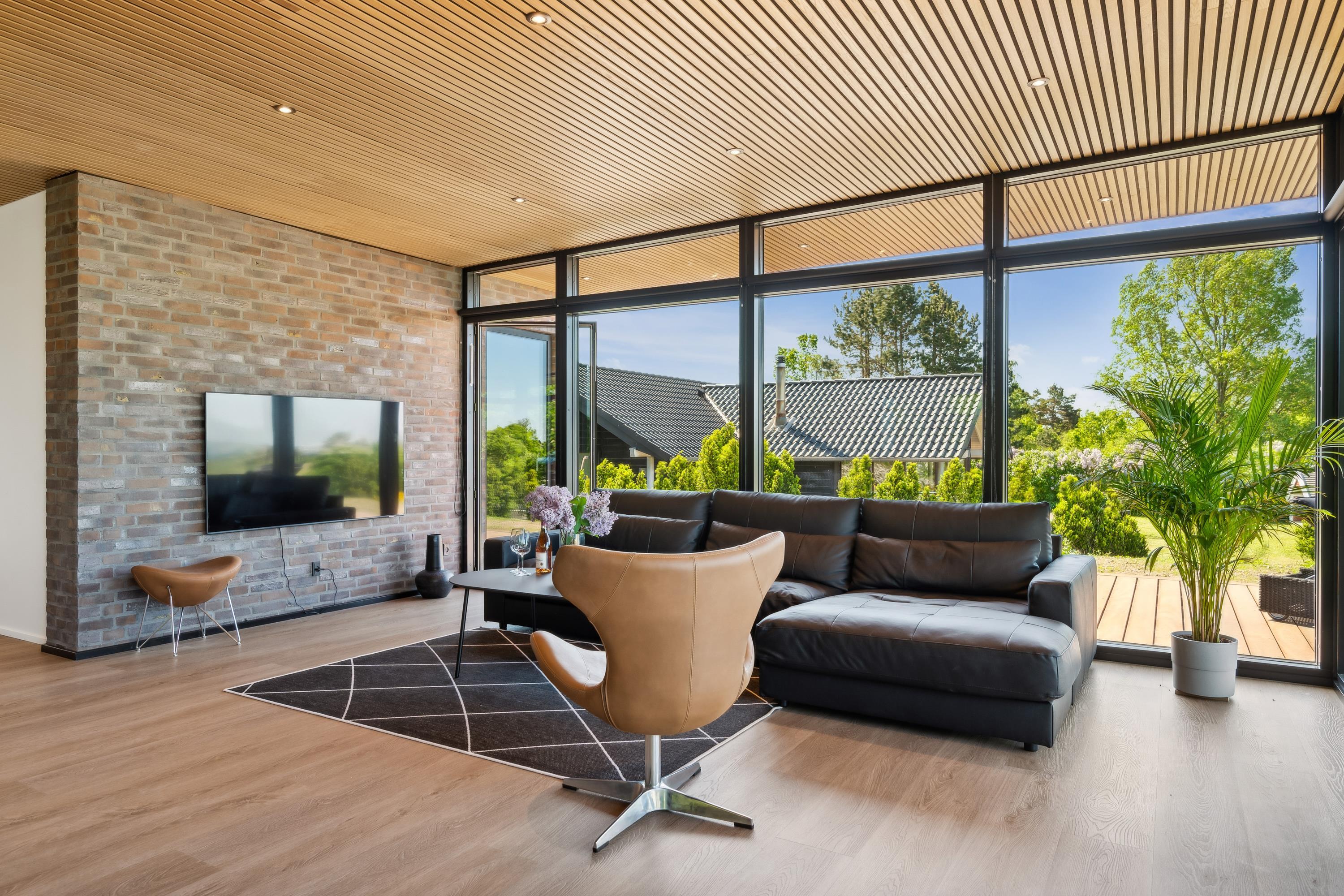 From the living room, you can also step out onto the large open terrace, which is furnished with comfortable seating, sun loungers, and offers a breathtaking view of the water – all the way to Aarhus Bay. The cozy living room is furnished with stylish furniture and features a large flat-screen TV.