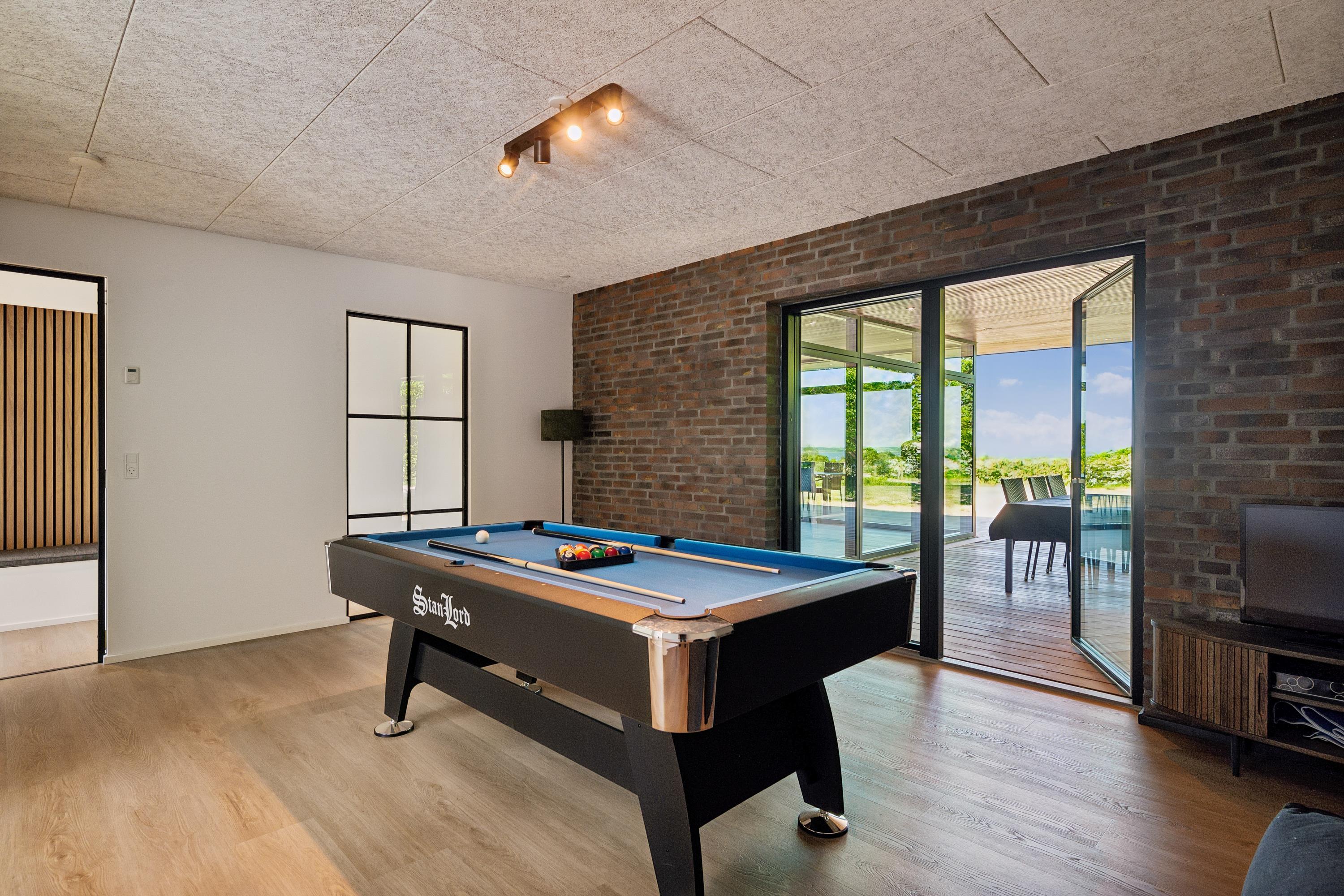 The house has two modern bathrooms, one of which includes a spa bath and access to a sauna. The sleeping arrangements are spread across five beautiful bedrooms, featuring a total of four double beds, two single beds, and a bunk bed. Additionally, there is a large activity room with a pool table and access to the covered terrace.