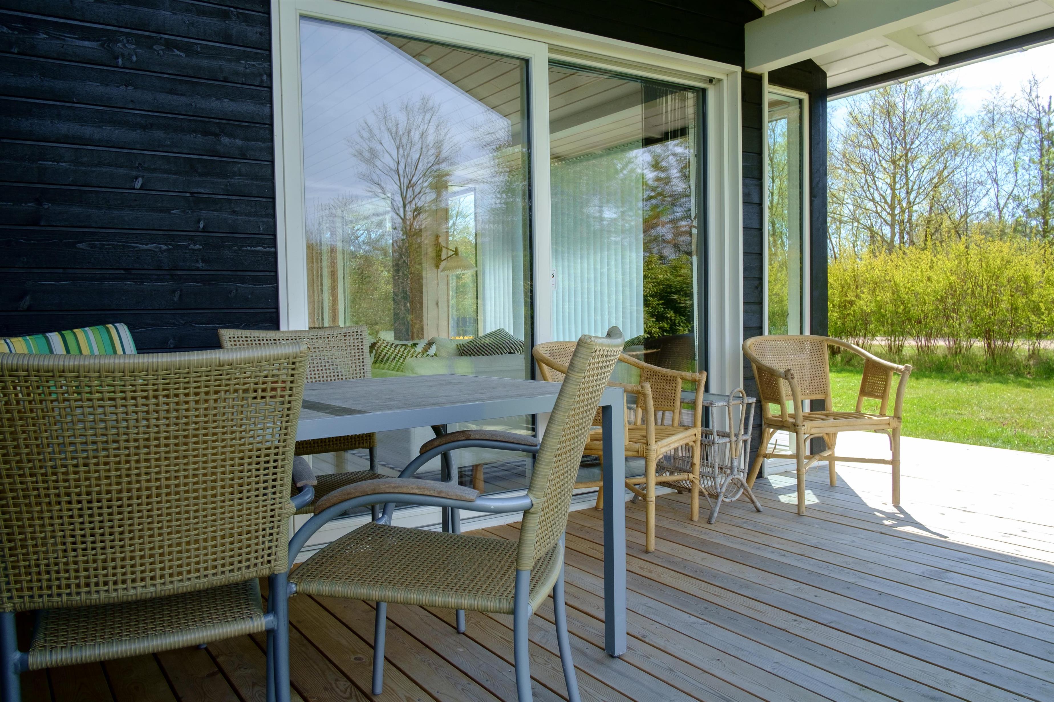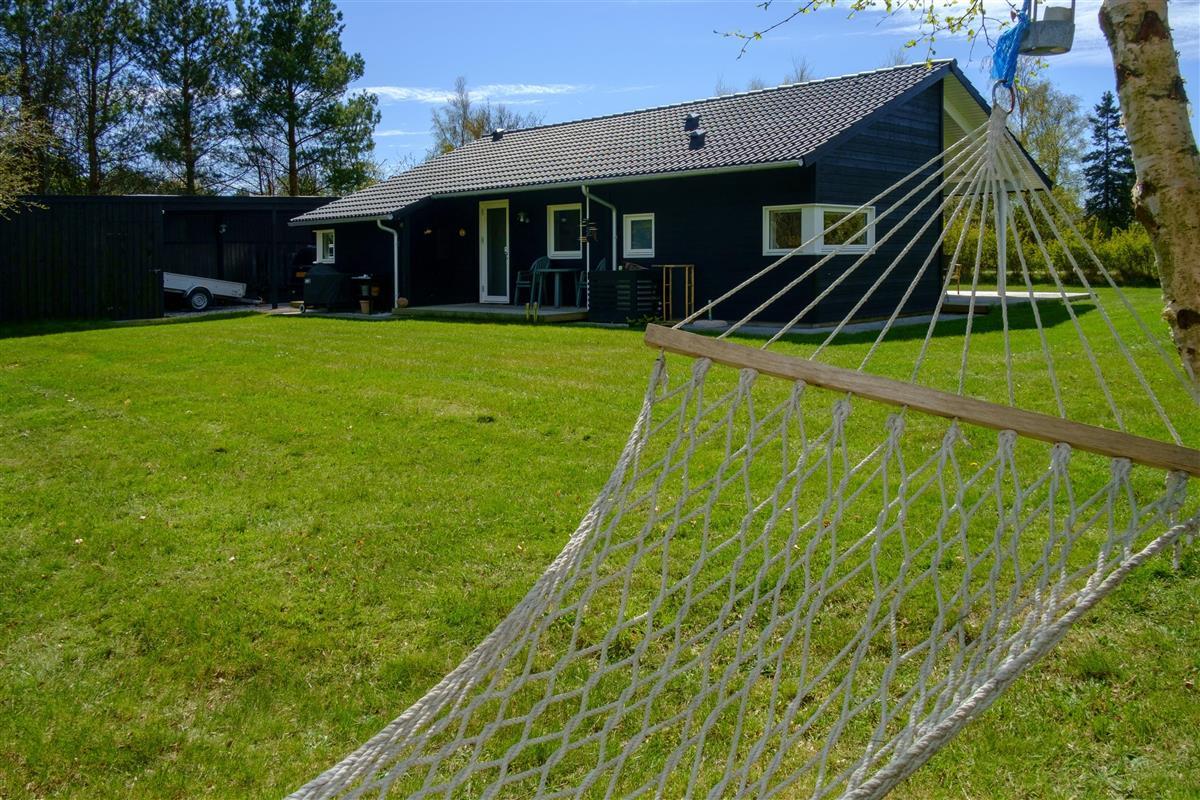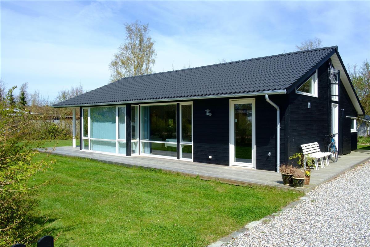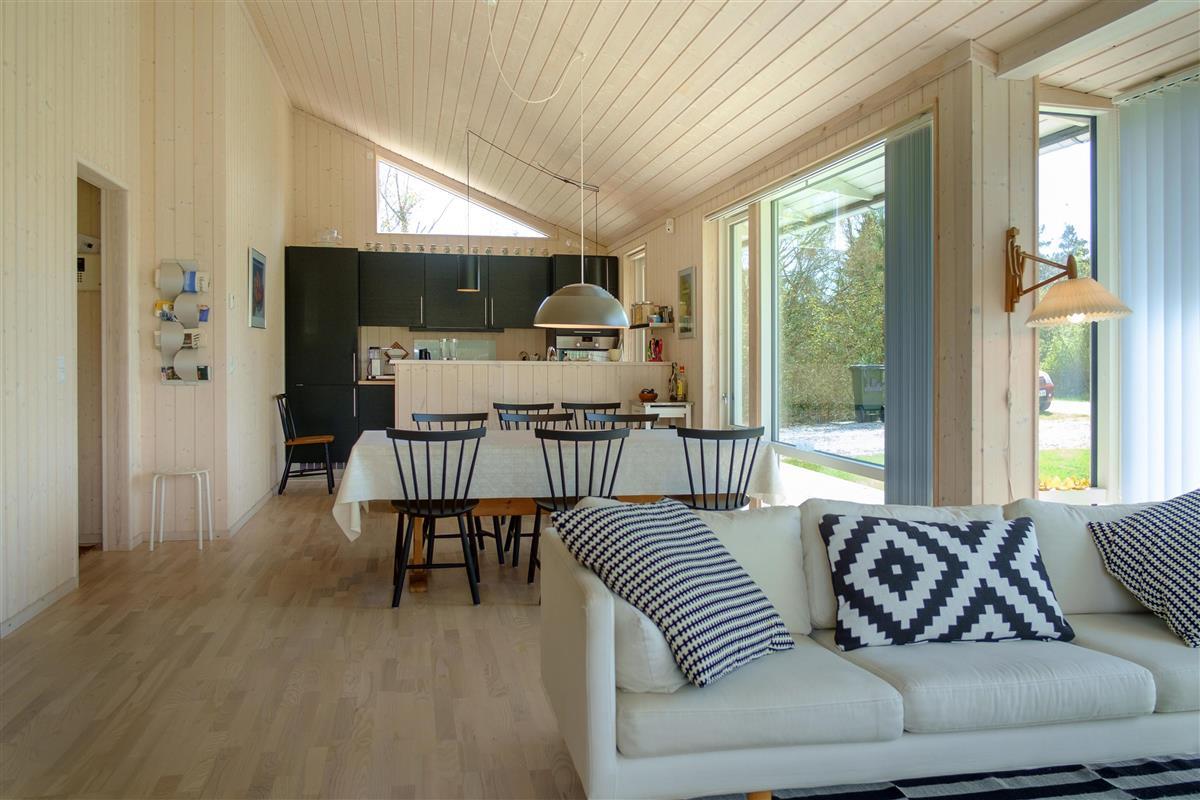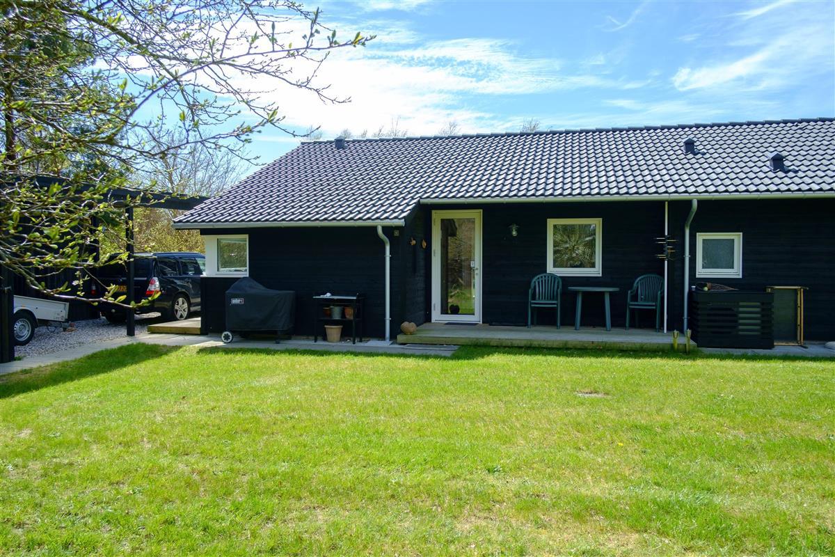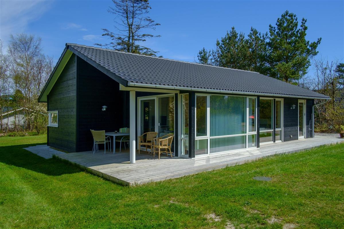 Lovely summer house from 2014 on the outskirts of Ebeltoft town and only 350 meters from the beach, situated on a beautiful natural plot with a delightful covered terrace with garden furniture and grill. The house is tastefully decorated with a cozy and bright living room with a comfortable sofa group, TV with Danish and German channels, and DVD player. Large glass panel facing the garden and terrace. The modern kitchen is in open connection with the living room and features a ceramic stove, microwave, fridge/freezer, and dishwasher. Good bathroom with shower and guest toilet. The sleeping accommodations in the house are distributed among 3 bedrooms, all with double beds. For the little holiday guests, there is a sandbox, changing table, crib, and high chair. The entire house has underfloor heating, heated by an air-to-water heat pump – together with year-round insulation, it ensures an energy-efficient holiday. Additional equipment includes an outdoor shower and bonfire spot. The house is located in a popular holiday area close to Ebeltoft and invites you to visit the many attractions and the cozy town environment