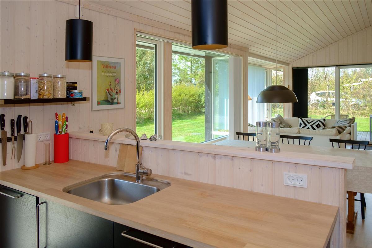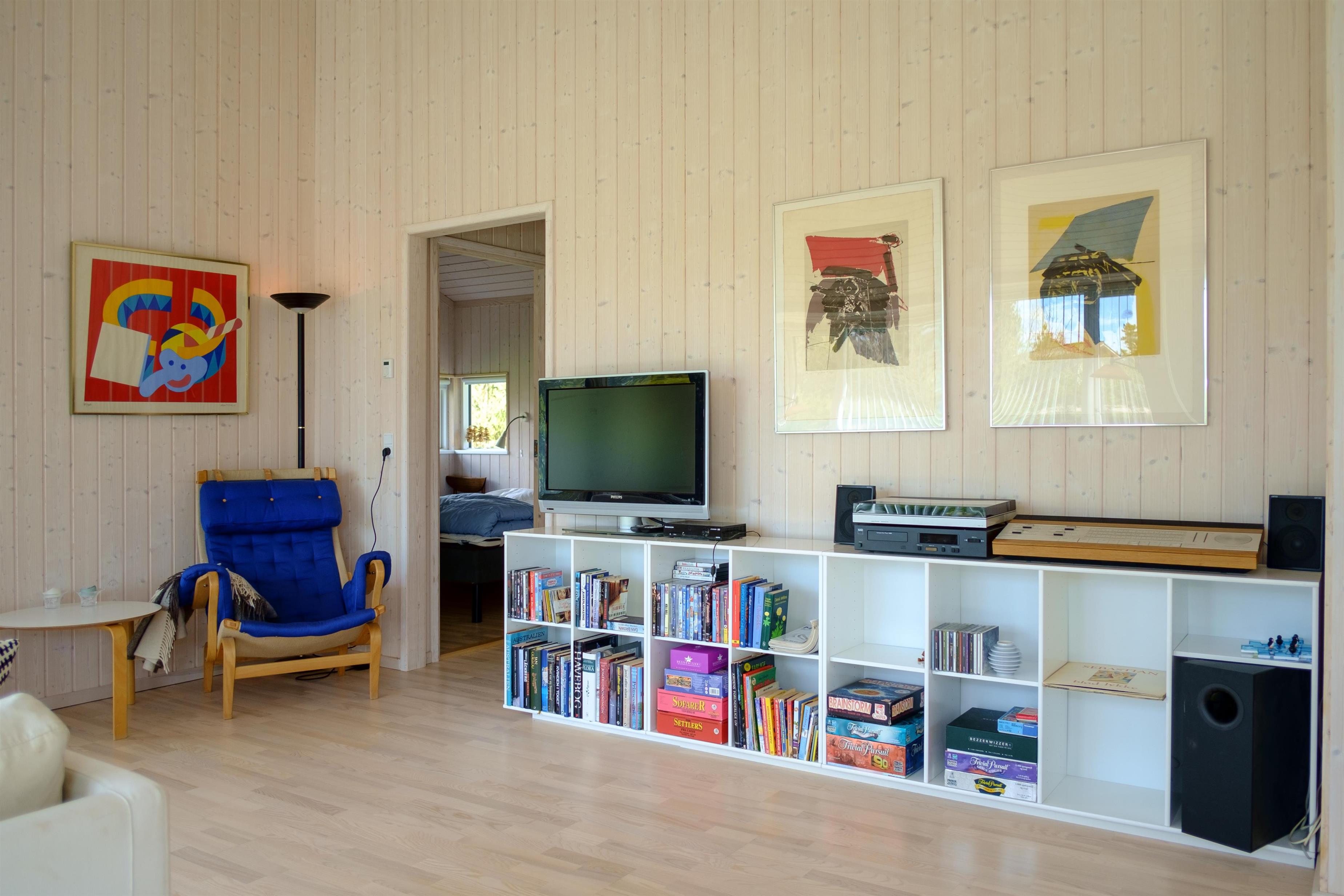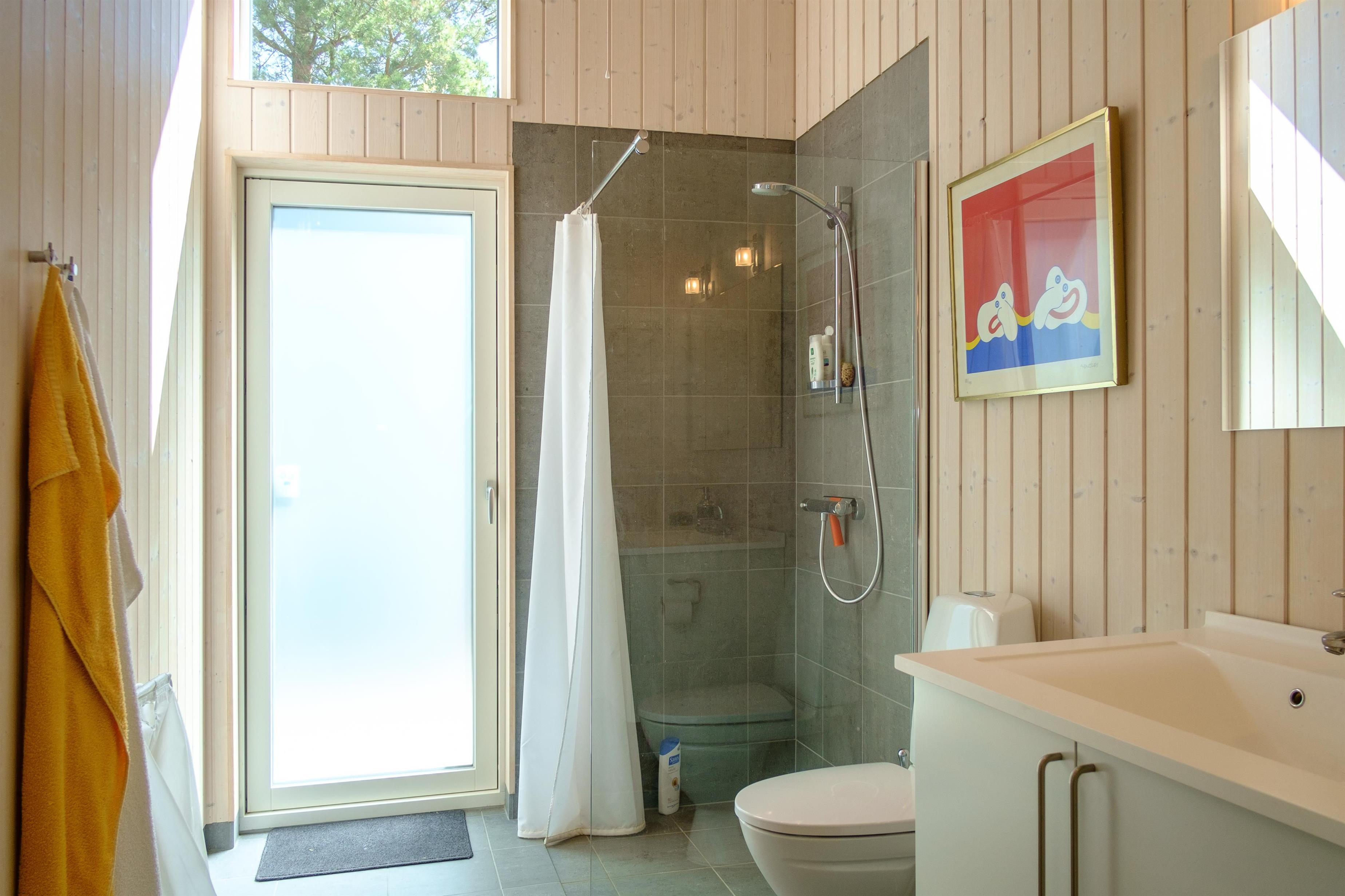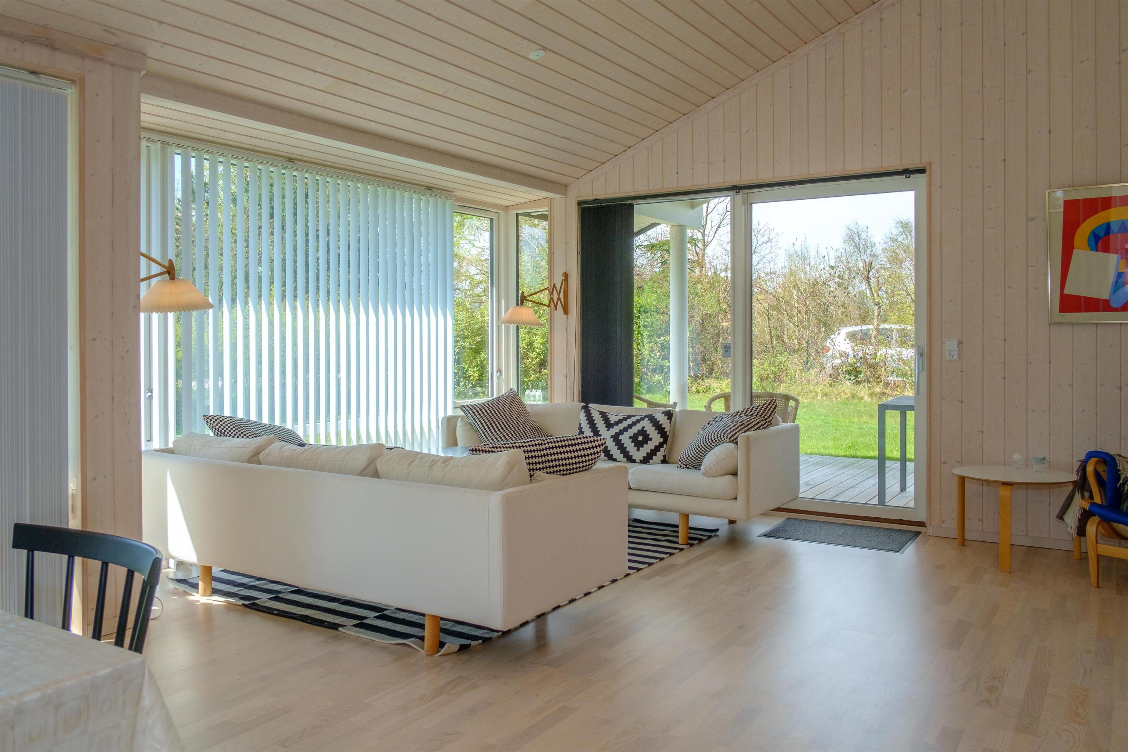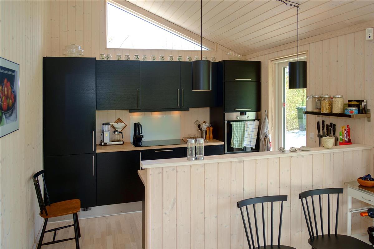 Lovely summer house from 2014 on the outskirts of Ebeltoft town and only 350 meters from the beach, situated on a beautiful natural plot with a delightful covered terrace with garden furniture and grill. The house is tastefully decorated with a cozy and bright living room with a comfortable sofa group, TV with Danish and German channels, and DVD player. Large glass panel facing the garden and terrace. The modern kitchen is in open connection with the living room and features a ceramic stove, microwave, fridge/freezer, and dishwasher. Good bathroom with shower and guest toilet. The sleeping accommodations in the house are distributed among 3 bedrooms, all with double beds. For the little holiday guests, there is a sandbox, changing table, crib, and high chair. The entire house has underfloor heating, heated by an air-to-water heat pump – together with year-round insulation, it ensures an energy-efficient holiday. Additional equipment includes an outdoor shower and bonfire spot. The house is located in a popular holiday area close to Ebeltoft and invites you to visit the many attractions and the cozy town environment