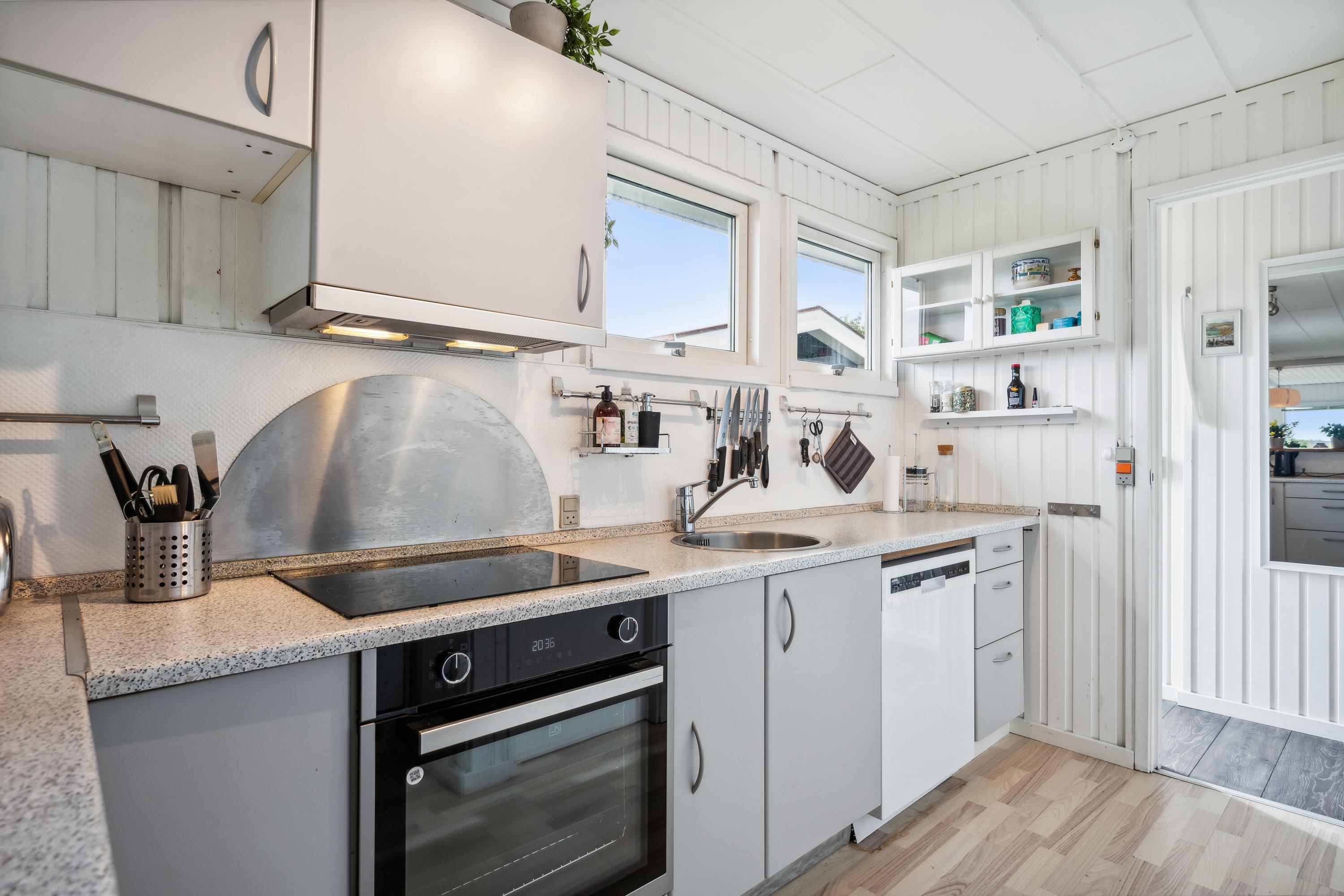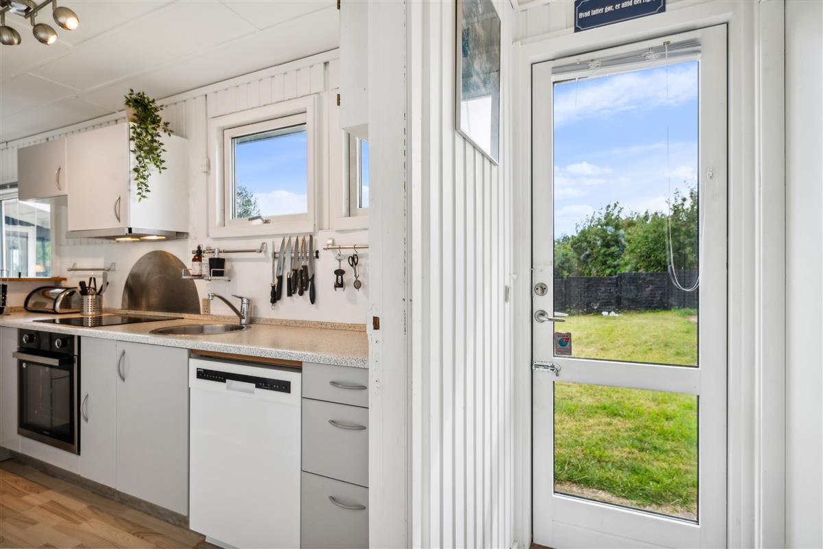 Just five minutes' drive from Ebeltoft, you’ll find this charming, older holiday home. Inside, there is a lovely bright living room, cozy and furnished with both a heat pump and a wood stove, and with access to a cozy terrace with outdoor furniture. The well-functioning kitchen is connected to the living room and includes a dishwasher. The bathroom is nicely equipped with a shower. The sleeping arrangements consist of two comfortable bedrooms with double beds in the main house, and the remaining three sleeping spaces are in a cozy annex, which features a bunk bed, a single bed, and a private toilet—perfect for older children. The house offers internet, and pets are allowed.