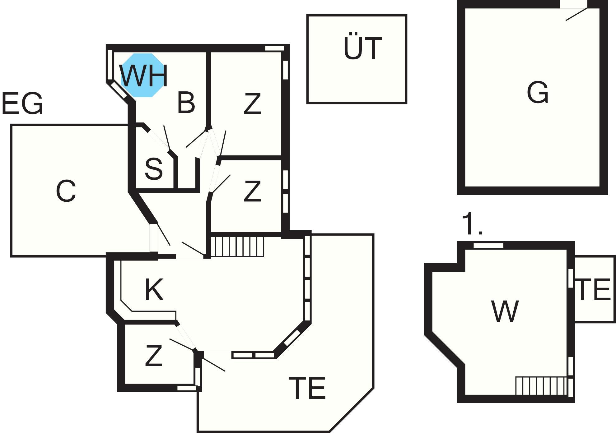 Bad: Waschm, Trockner, WC, Waschb., Dusche, Fußbodenheiz.