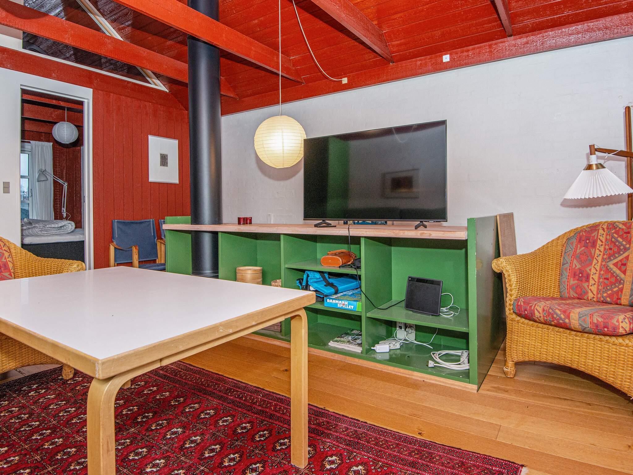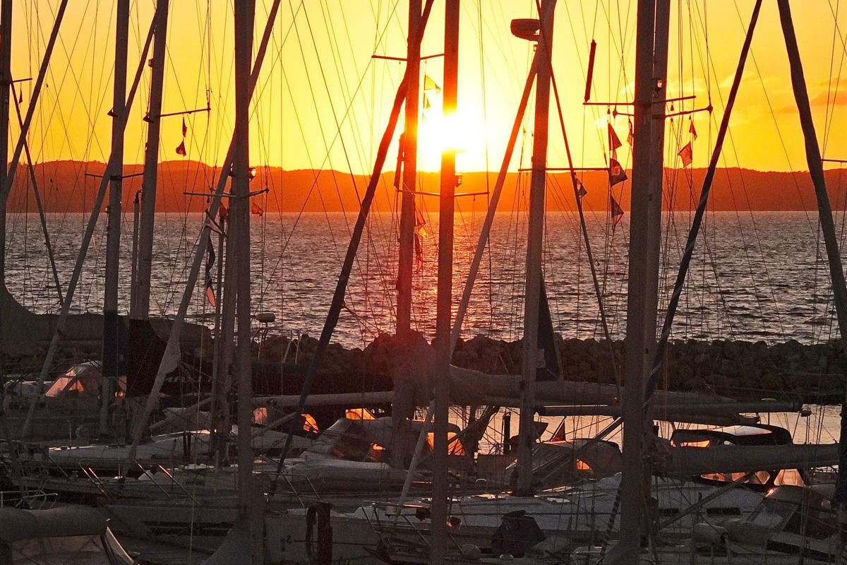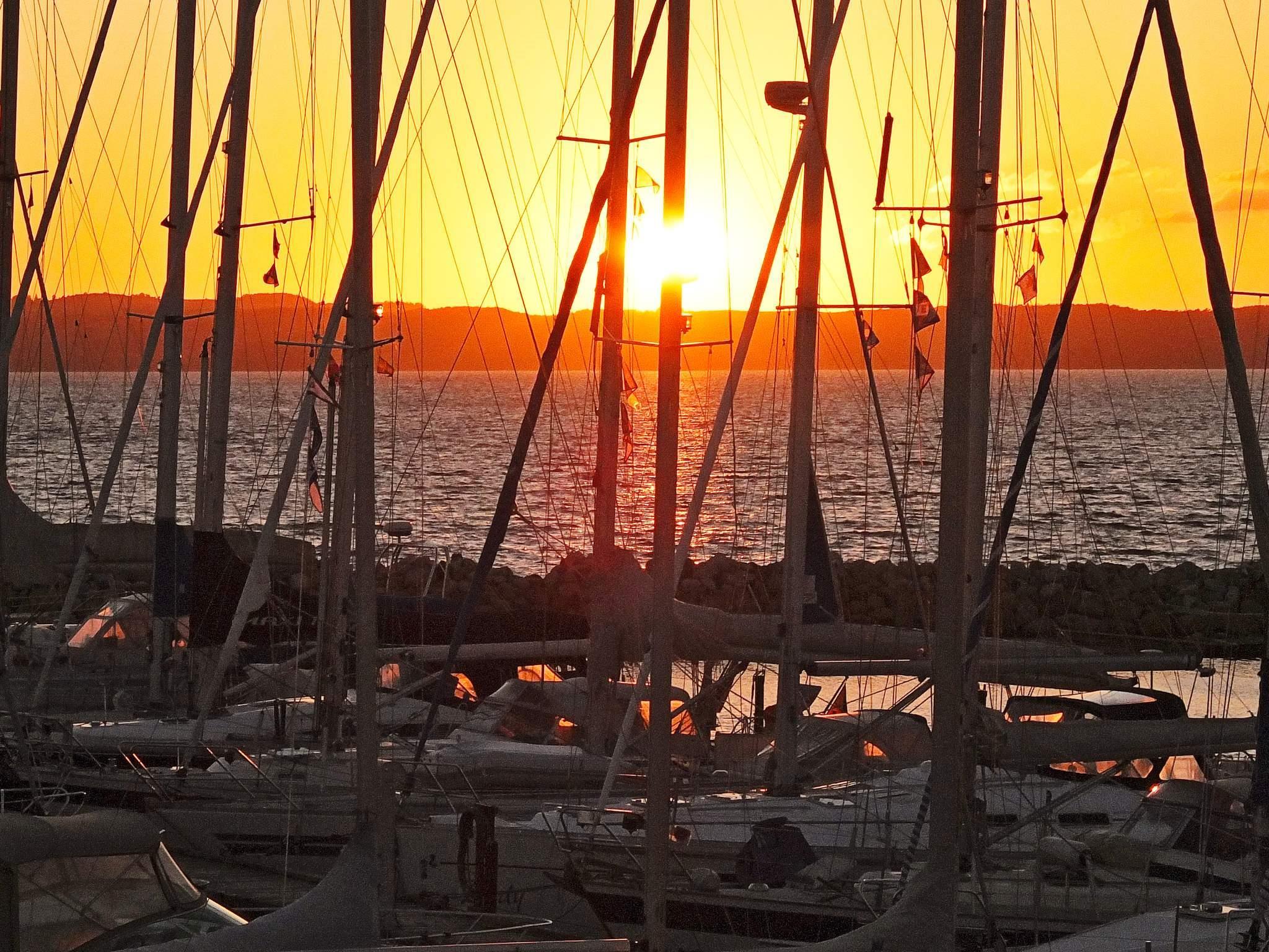 Von dem mit der Küche offen verbundenen Essbereich im Erdgeschoss hat man direkten Zugang zur Terrassenfläche mit Blick zum Segelhafen. Oben liegt das gemütliche Wohnzimmer mit Fußbodenheizung und Fernseher.