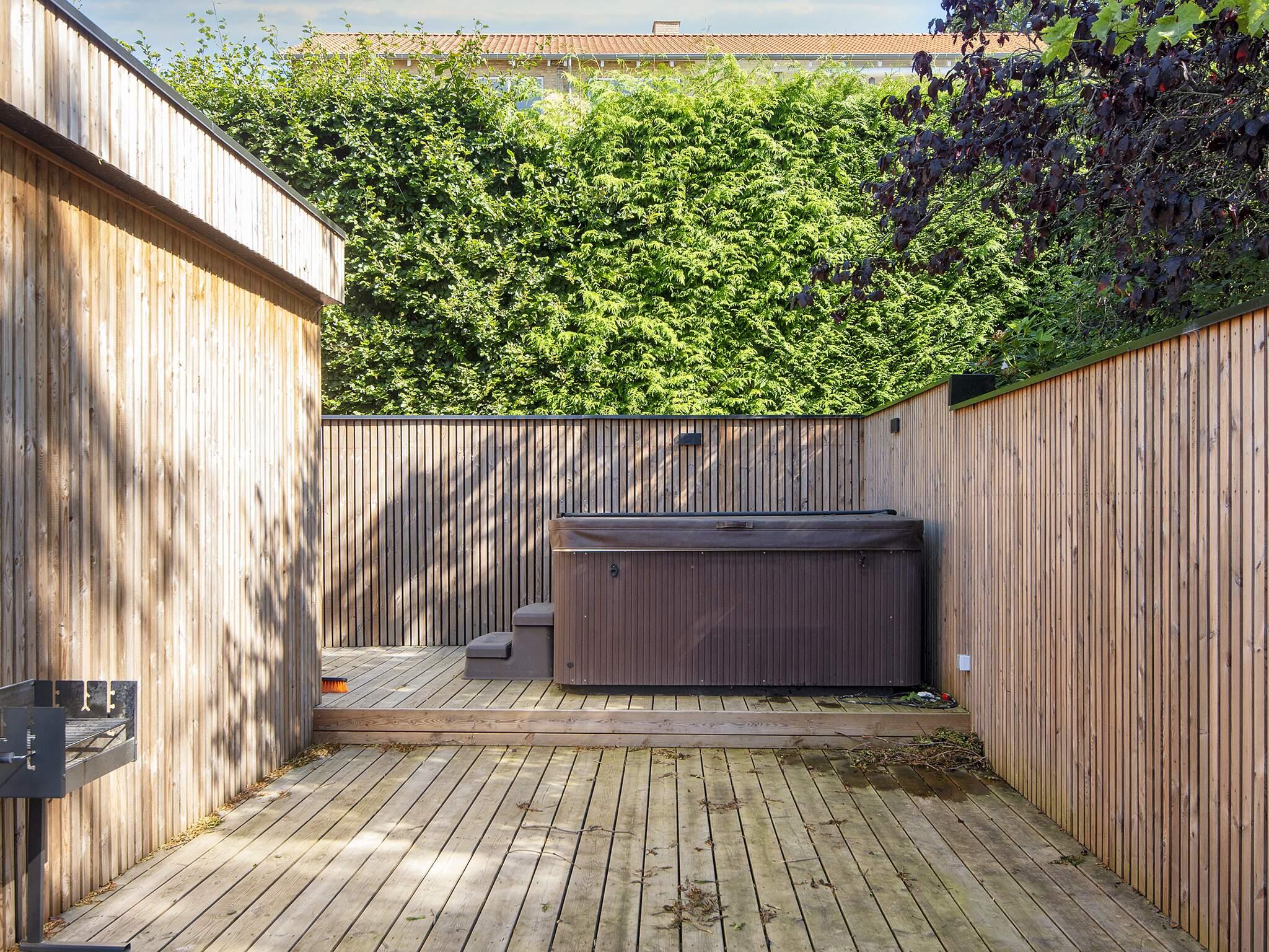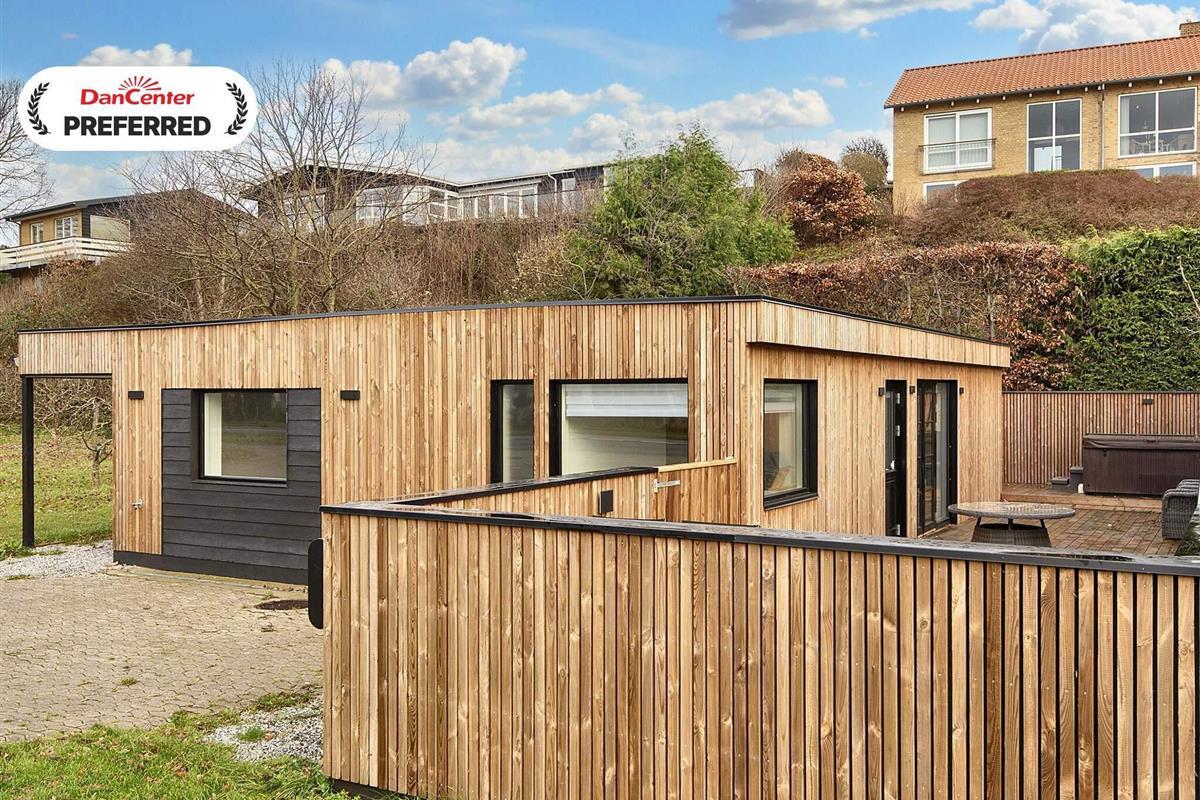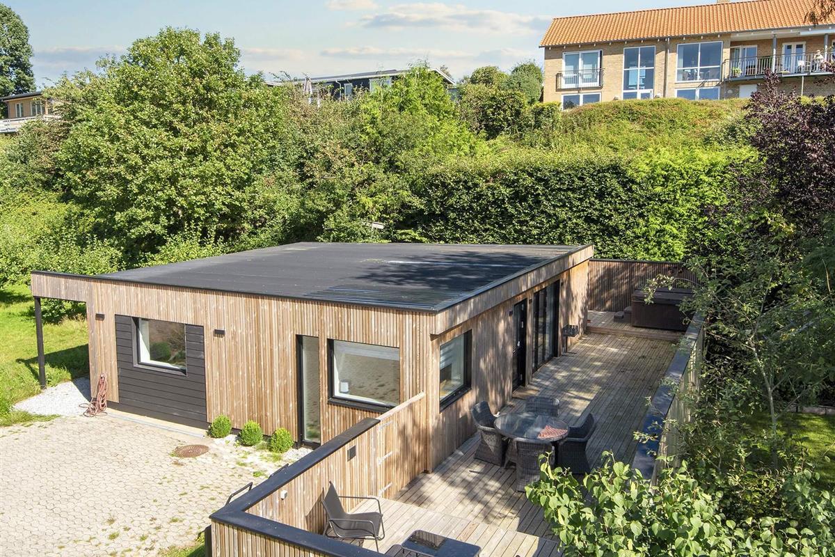 Eine ganz zentrale Lage in Ebeltoft, in der Nähe von Wasser, Wald und der Ortsmitte, bietet dieses Ferienhaus mit Meerblick sowie schöner Terrasse mit Standwasser-Whirlpool im Freien.