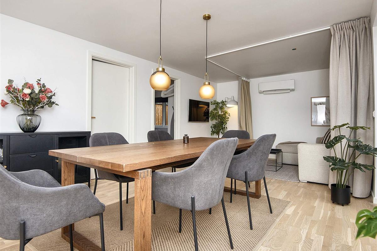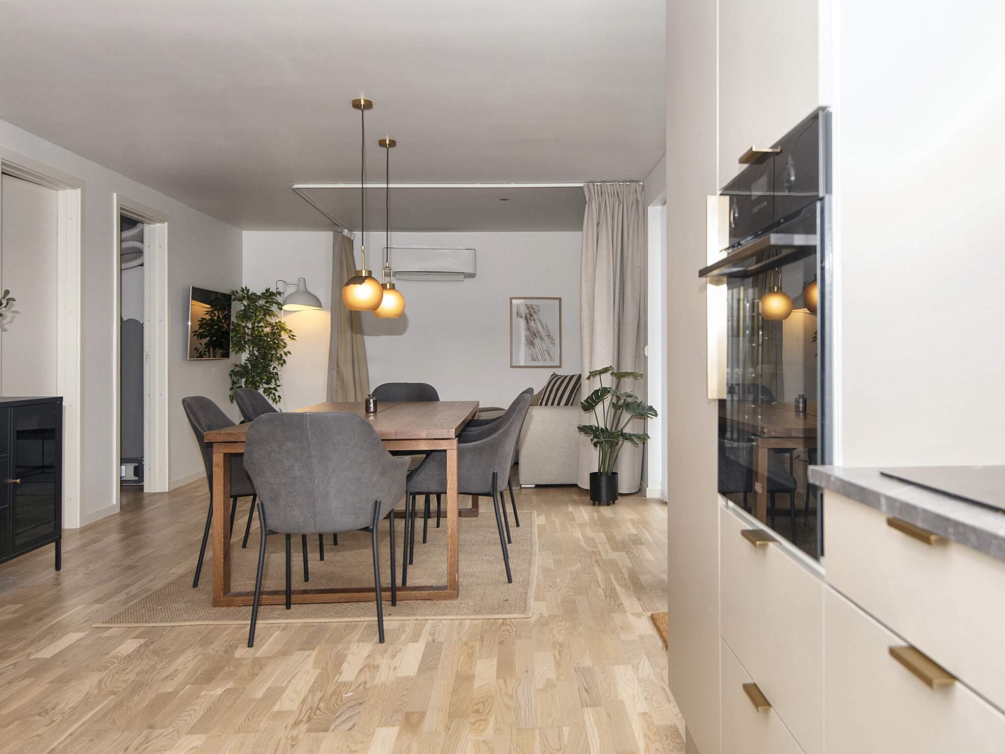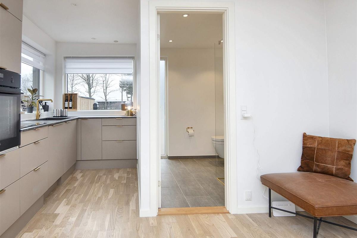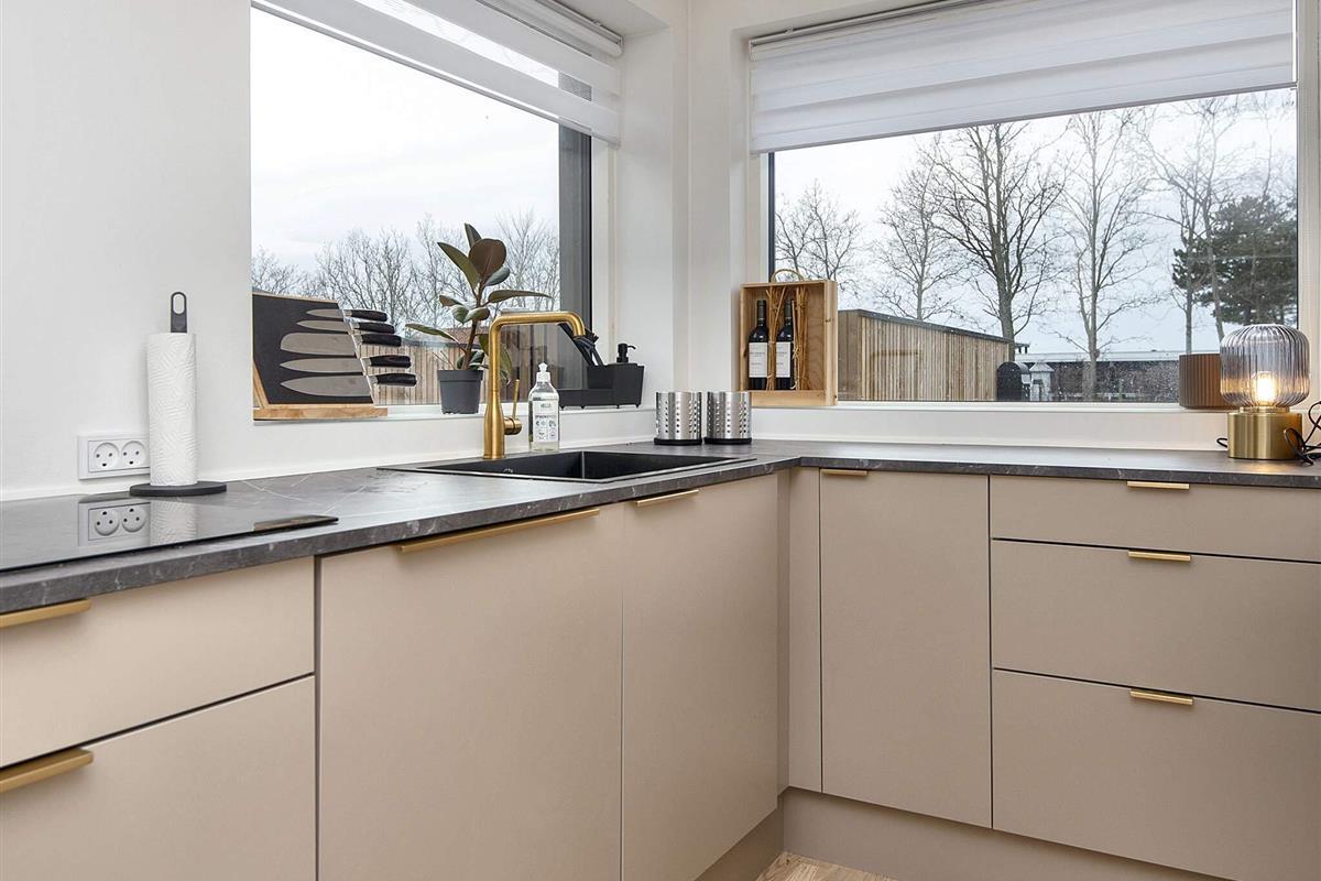 Der Wohnbereich mit Küche und Essecke ist offen und modern sowie in hellen Farben eingerichtet. Messingfarbene Armaturen im Bad und in der Küche. Alles ist ansprechend und typisch skandinavisch gestaltet. Stellplatz vor dem Haus. Das Haus ist außen mit Holzlamellen verkleidet und alles passt gut zusammen.