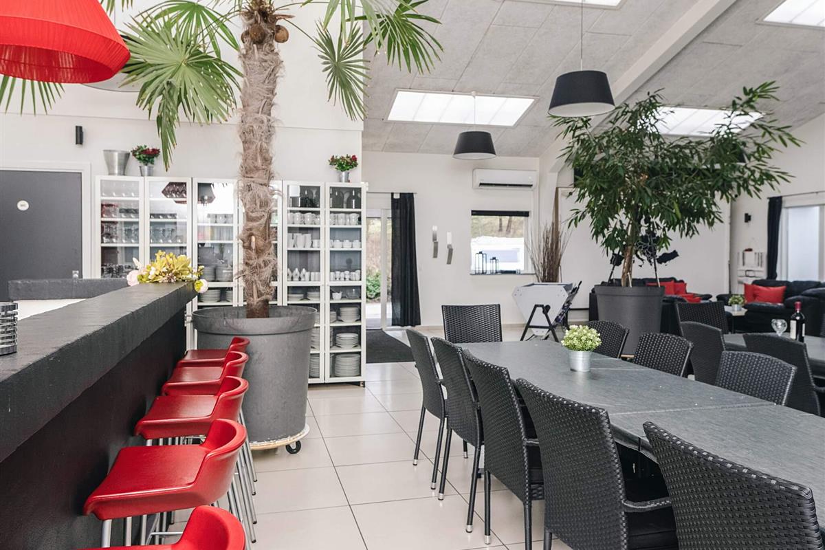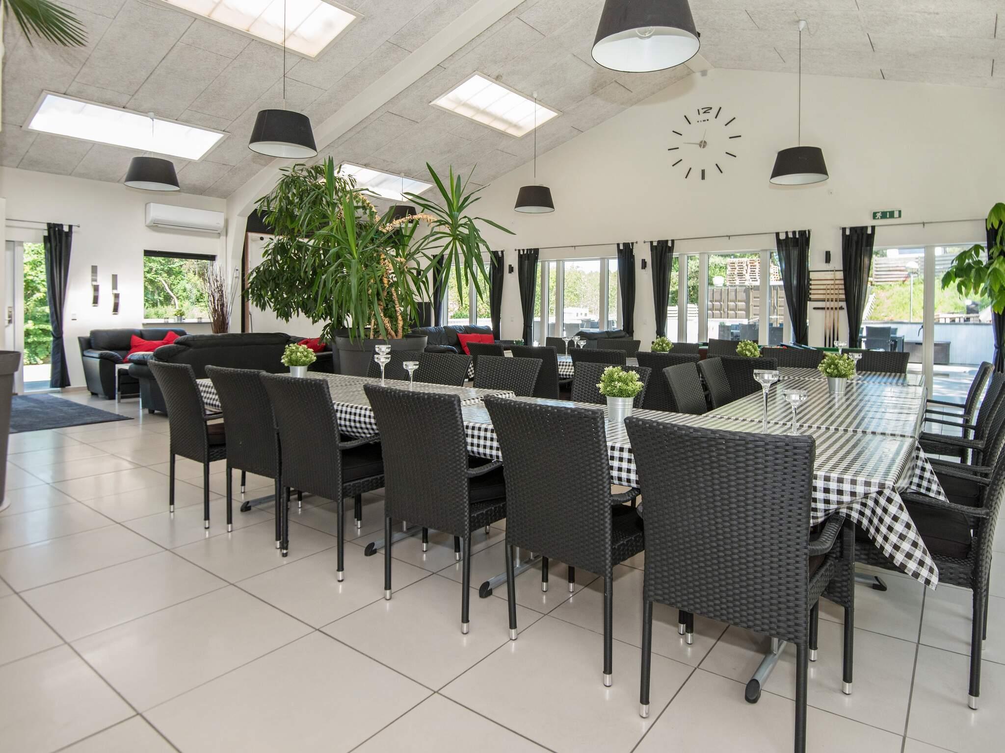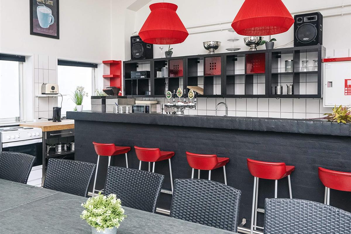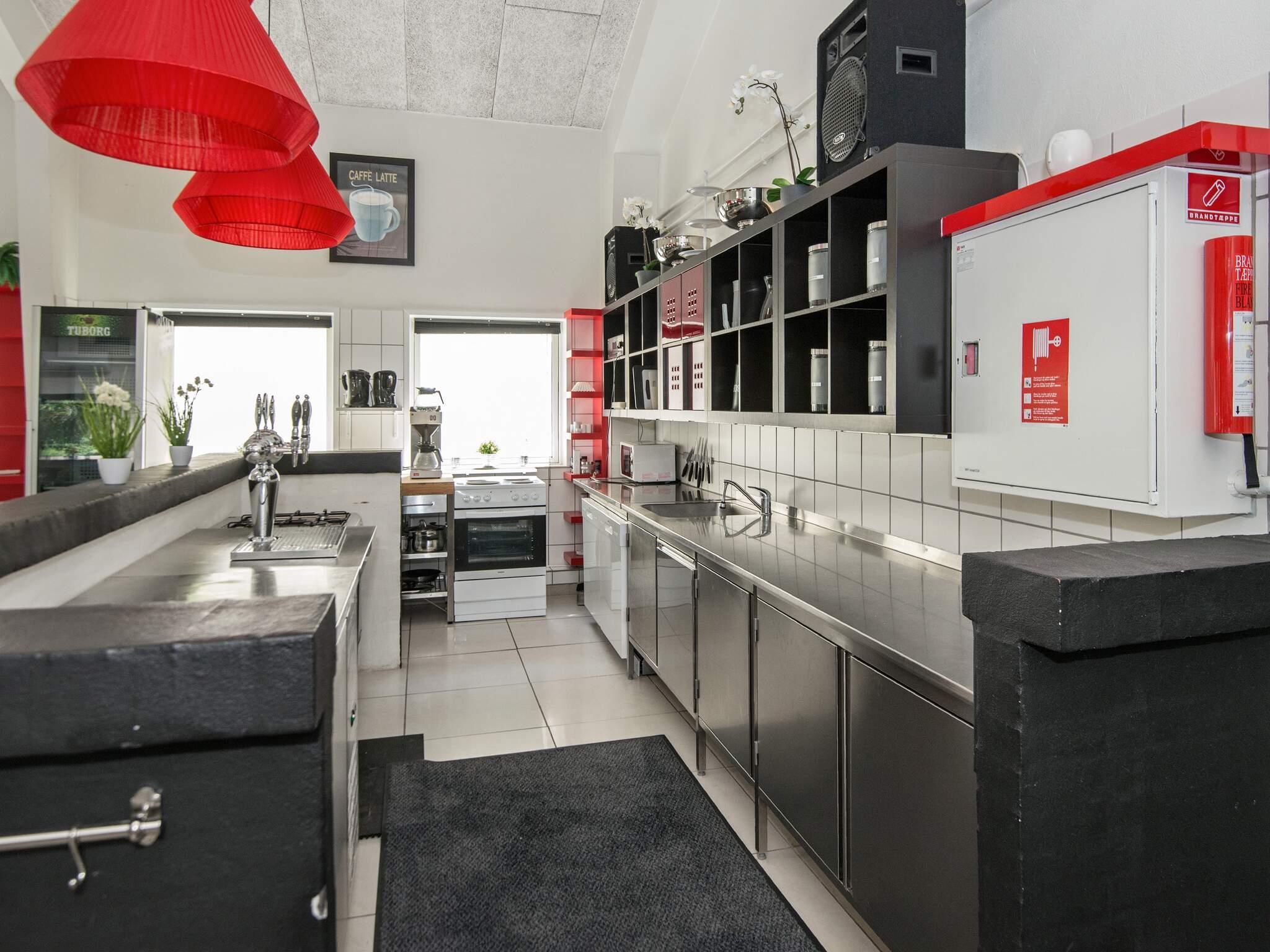 Im Gemeinschaftsraum gibt es u.a. einen großen Essbereich für bis zu 36 Personen und eine große, offene Küche in der das Festmahl und weitere Mahlzeiten zubereitet werden können. Diese ist u.a. mit zwei Kochherden, zwei Geschirrspülern und einem großen Kühlschrank umfassend ausgestattet, damit hier für entsprechend viele Menschen gekocht werden kann.