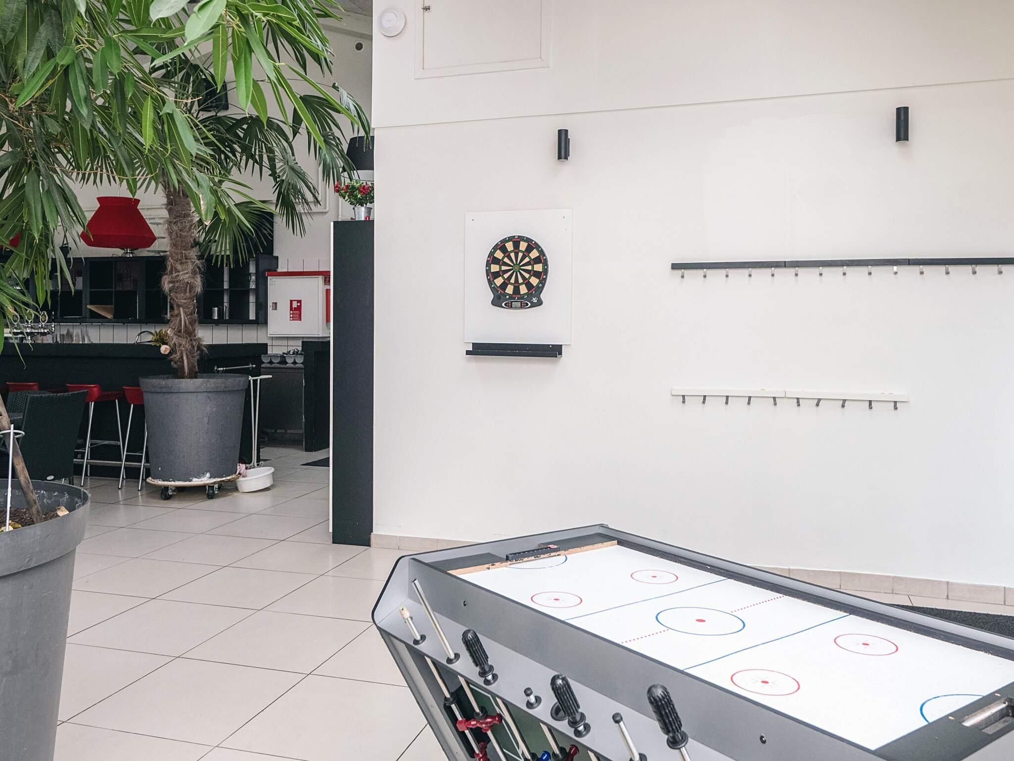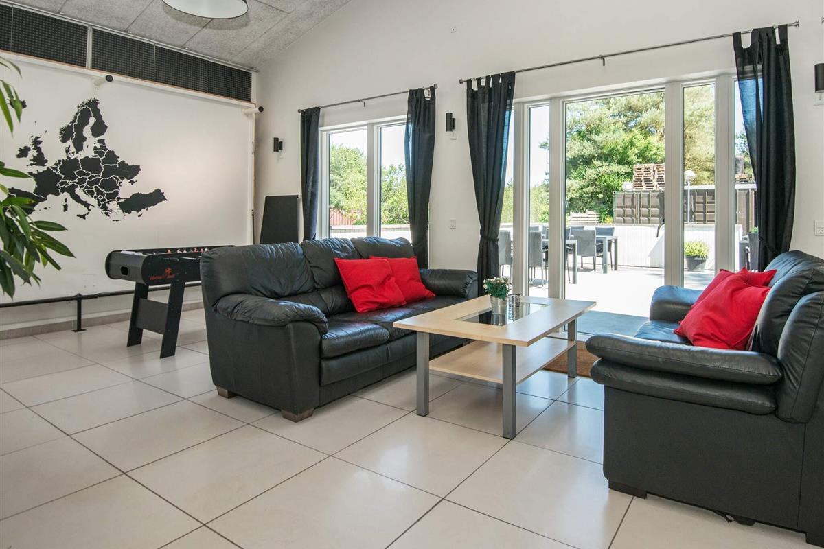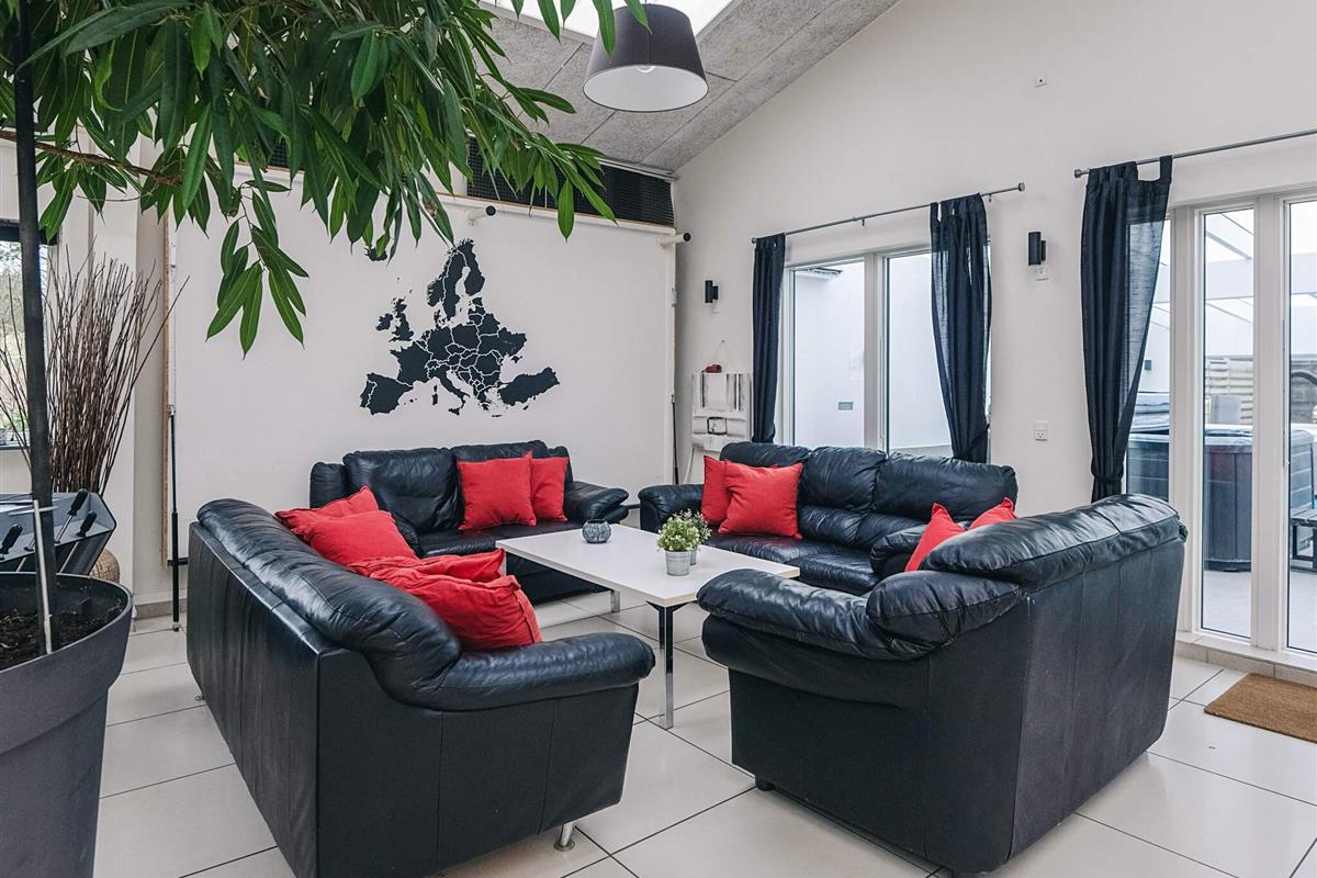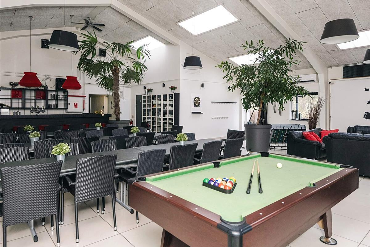 Der offen gestaltete Küchen-/Wohnbereich bietet besonders viel Platz und Überblick. Mit gemütlichen Sitzgelegenheiten und einer Theke sowie Tischkicker und Billard ist hier Platz für geselliges Beisammensein mit Jung und Alt. Das Wohnzimmer hat einen großen 60-Zoll Fernseher mit einigen deutschen Sendern zur Auswahl.