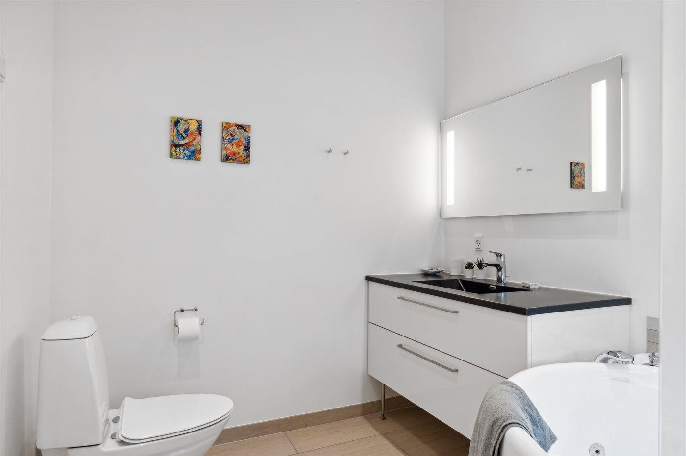 Er is 2 badkamers met douchehok en 2 toiletten. Er is vloerverwarming in 2 van de badkamers.