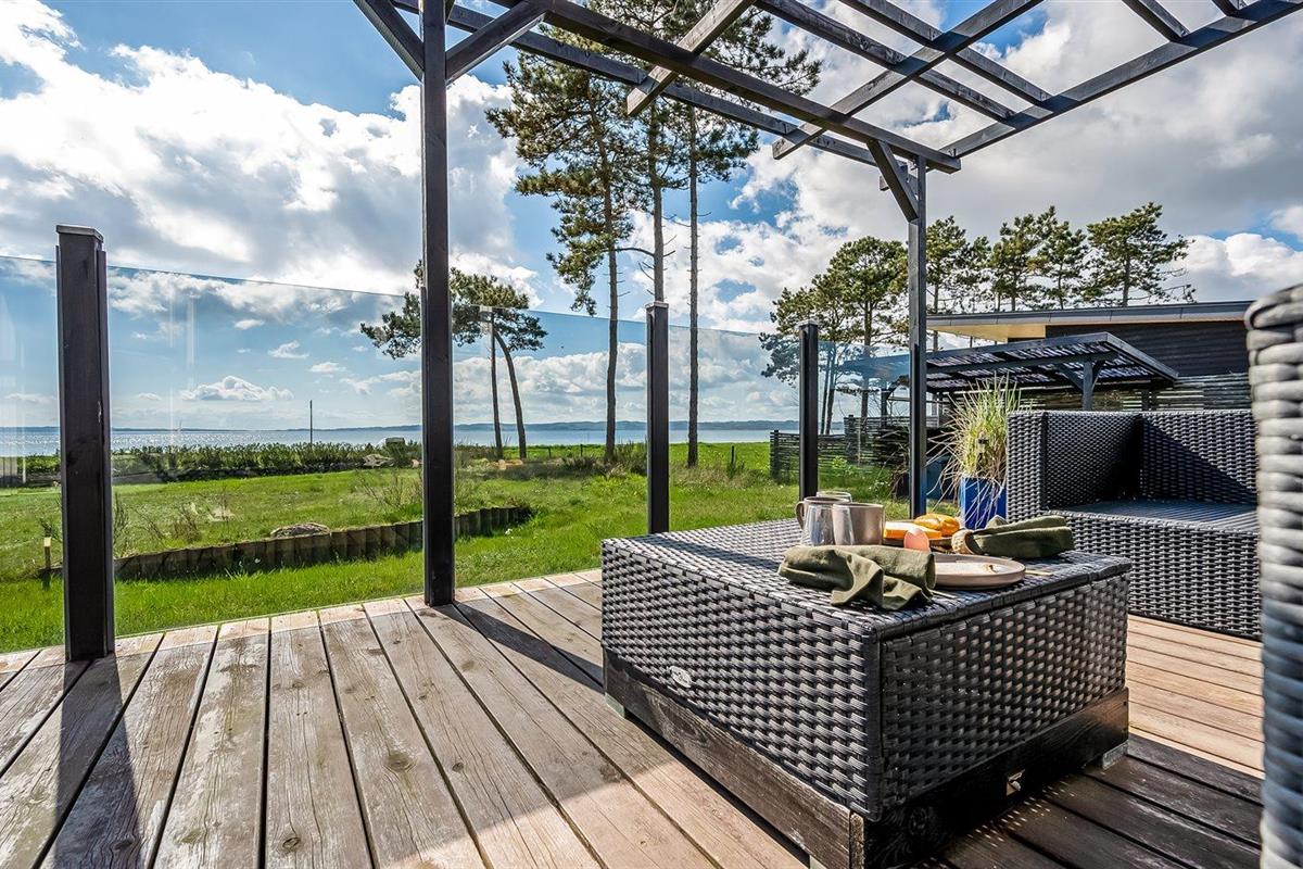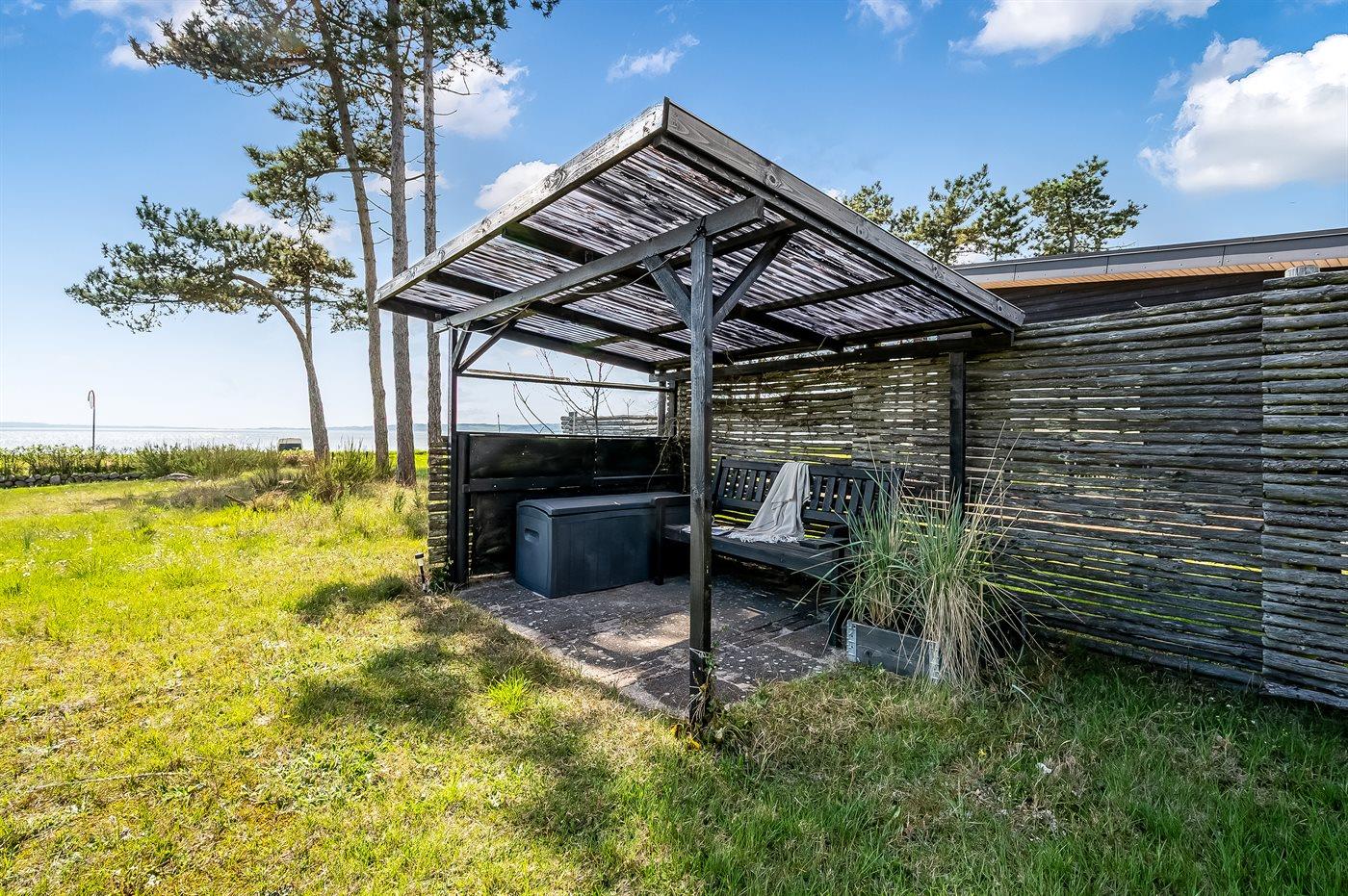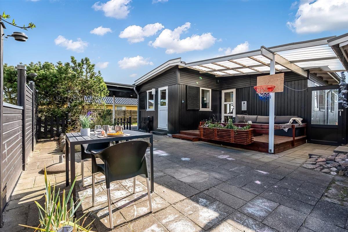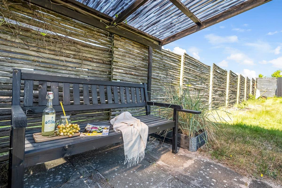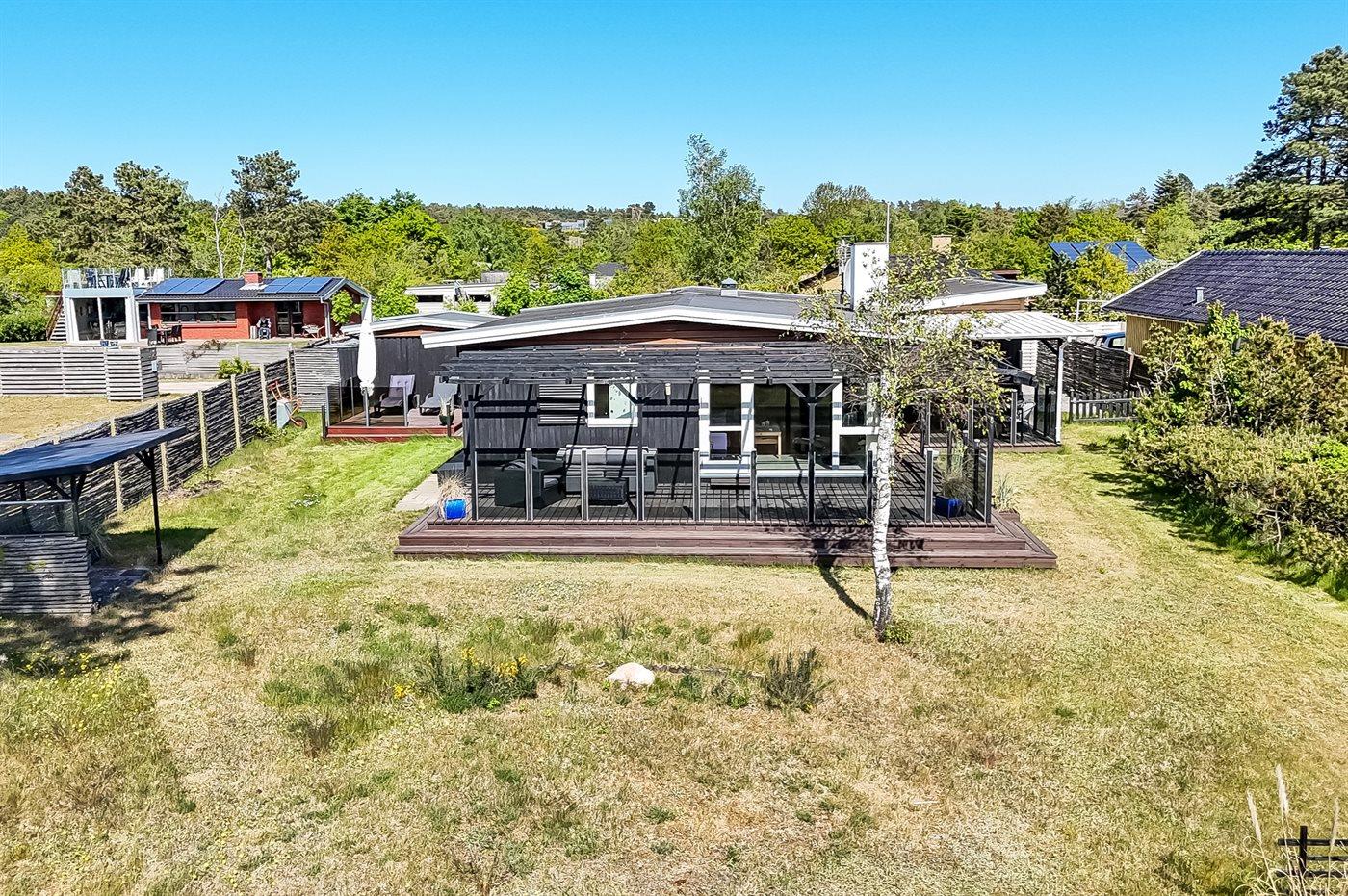 De vakantiewoning is gelegen op een 1090 m² groot aangelegde tuin. Afstand tot de zee 50 m. Dichtstbijzijnde winkel 400 m. Bij de vakantiewoning hoort overdekt en beschut terras. Barbecue. Carport ter beschikking. Parkeerplaats bij het huis.