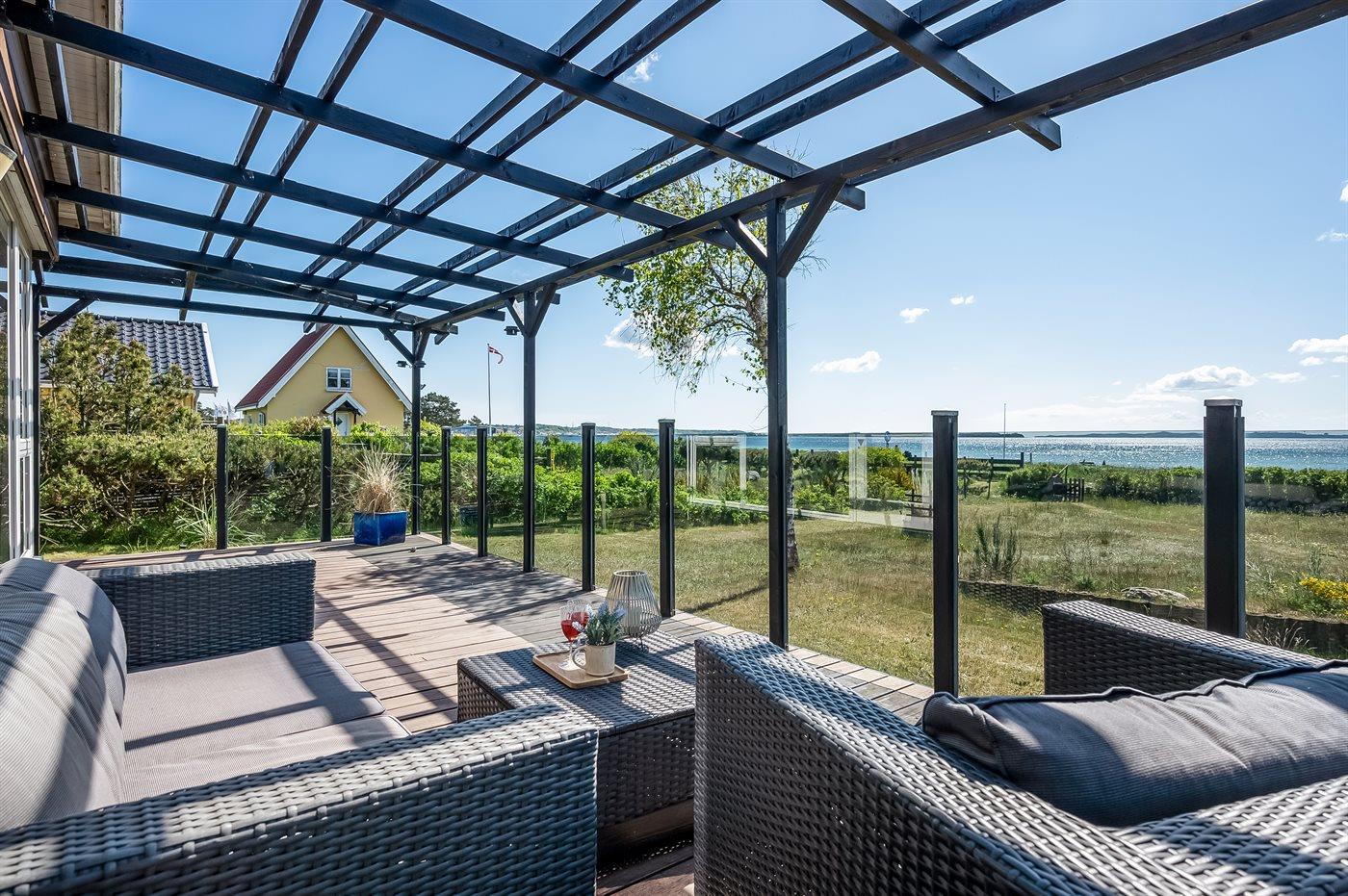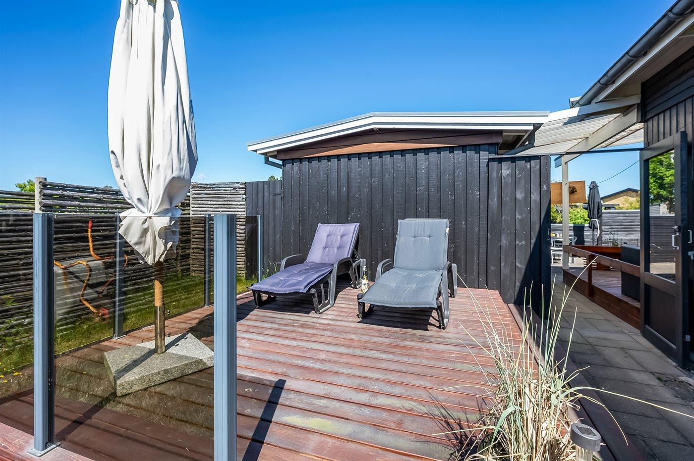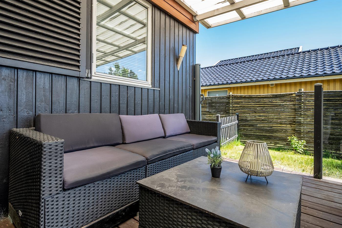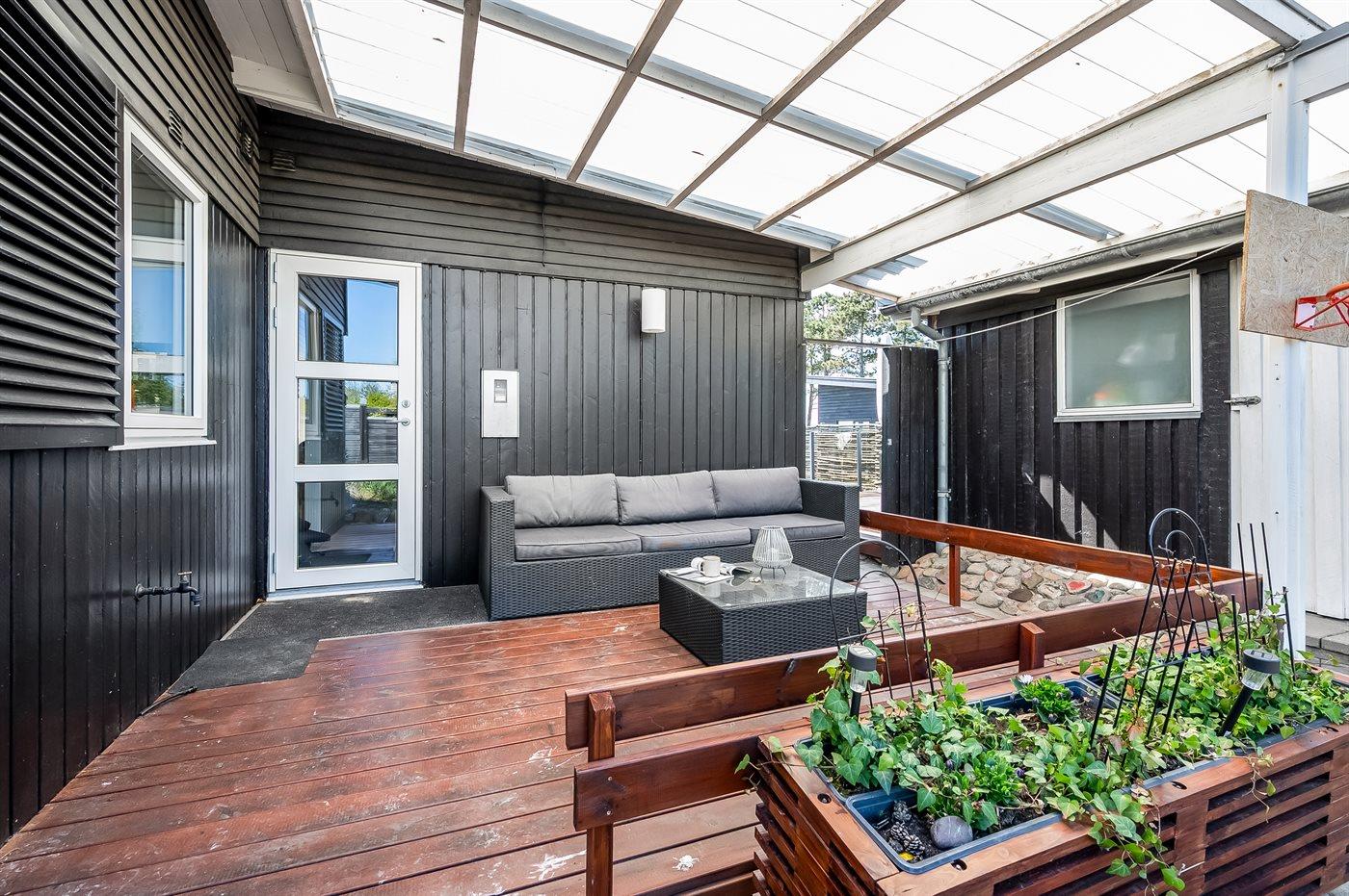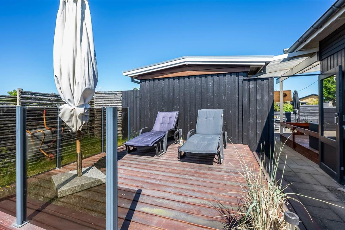 De vakantiewoning is gelegen op een 1090 m² groot aangelegde tuin. Afstand tot de zee 50 m. Dichtstbijzijnde winkel 400 m. Bij de vakantiewoning hoort overdekt en beschut terras. Barbecue. Carport ter beschikking. Parkeerplaats bij het huis.