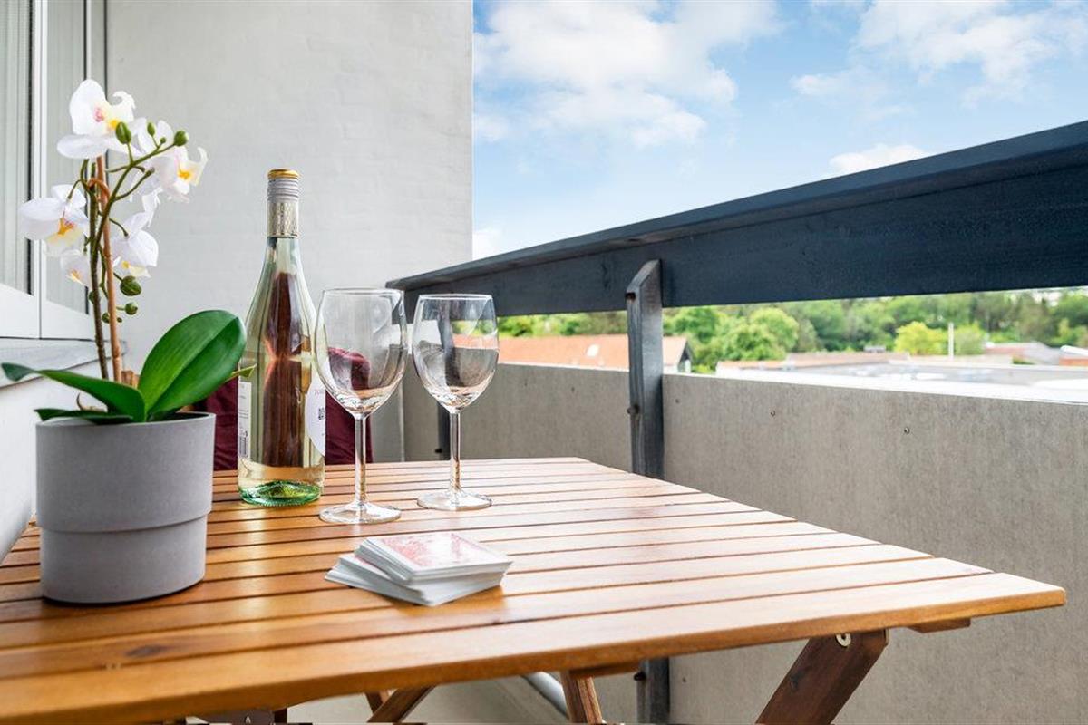 Buiten is er een balkon waar je de dag kunt afsluiten met een glas wijn.