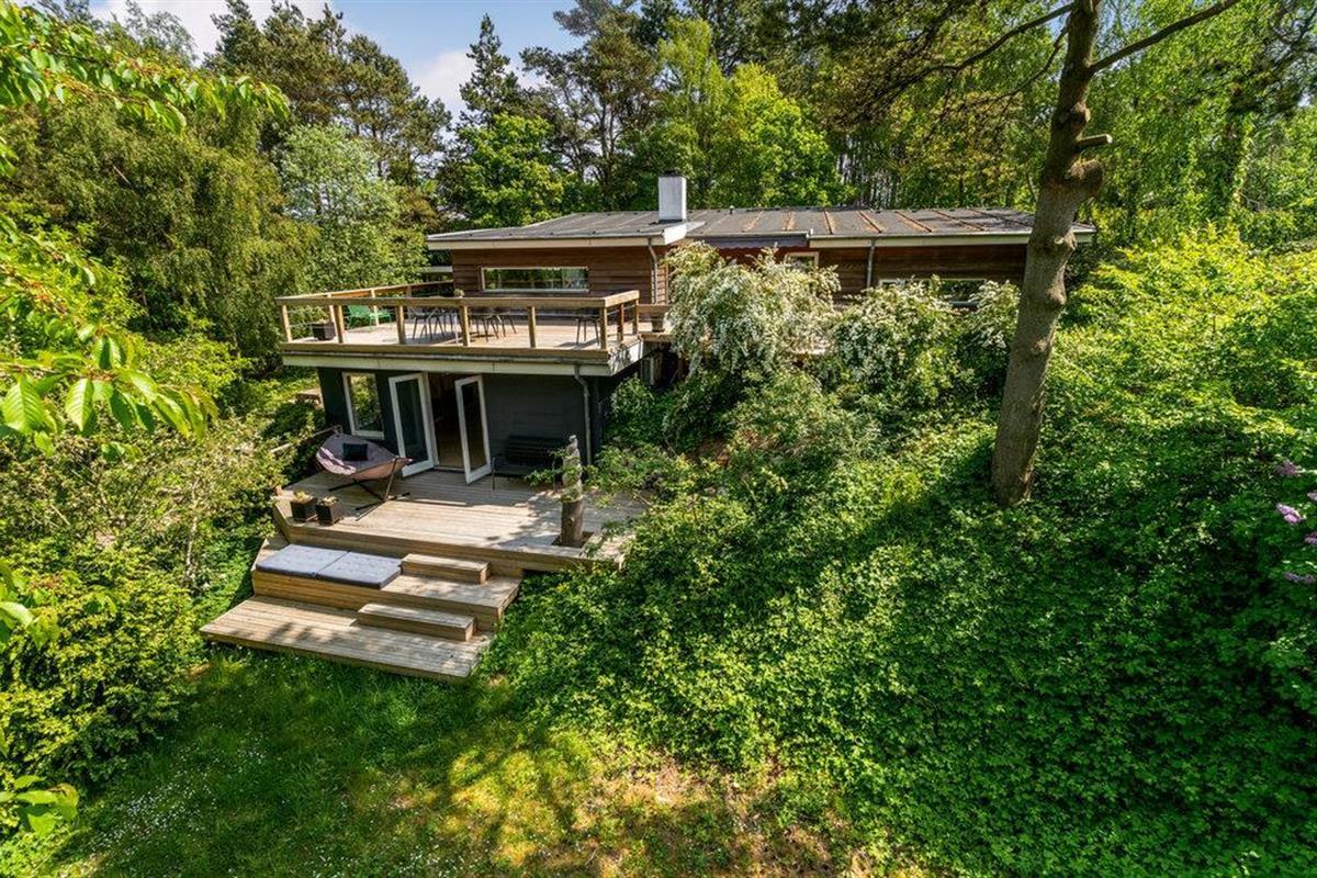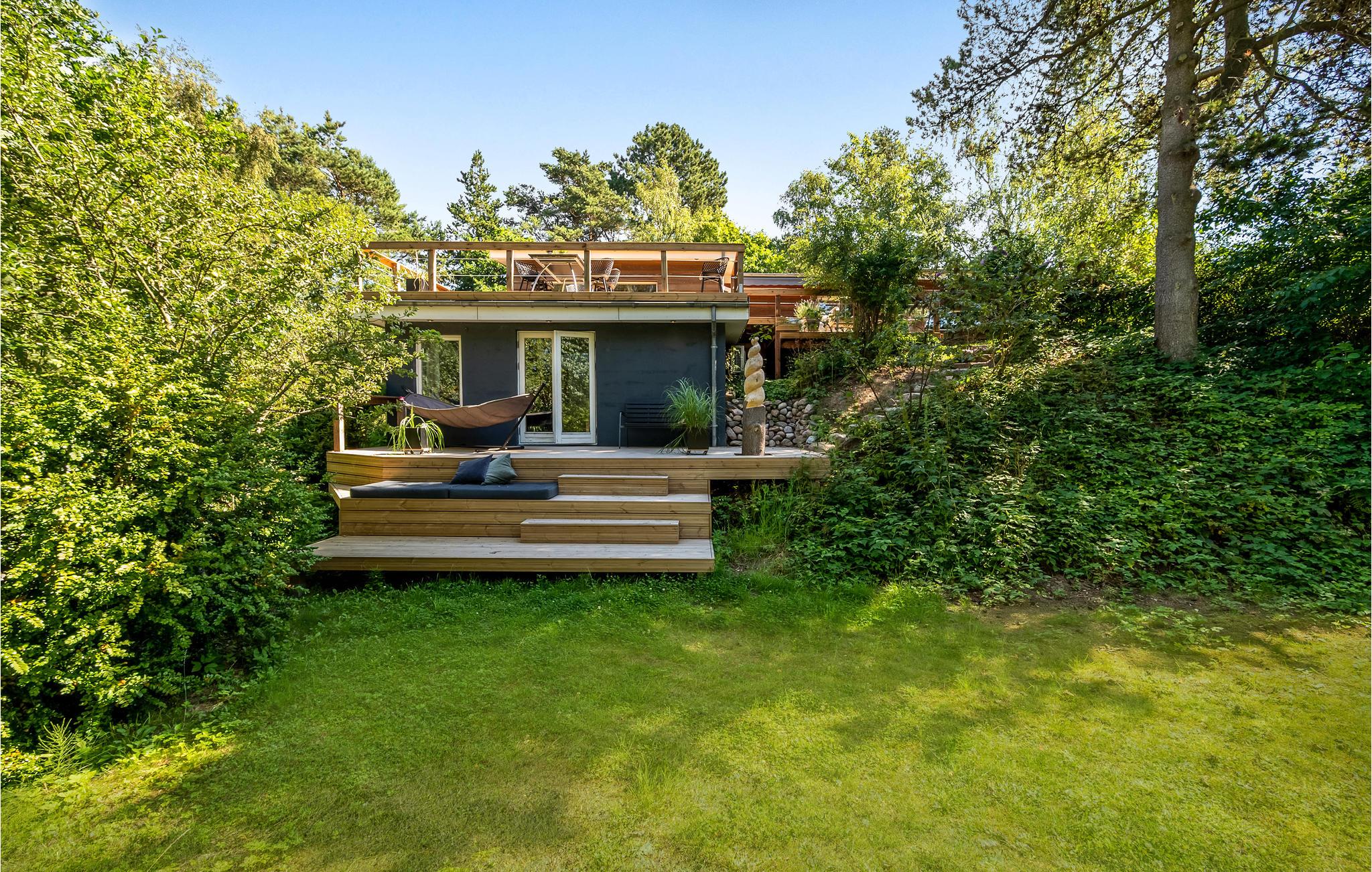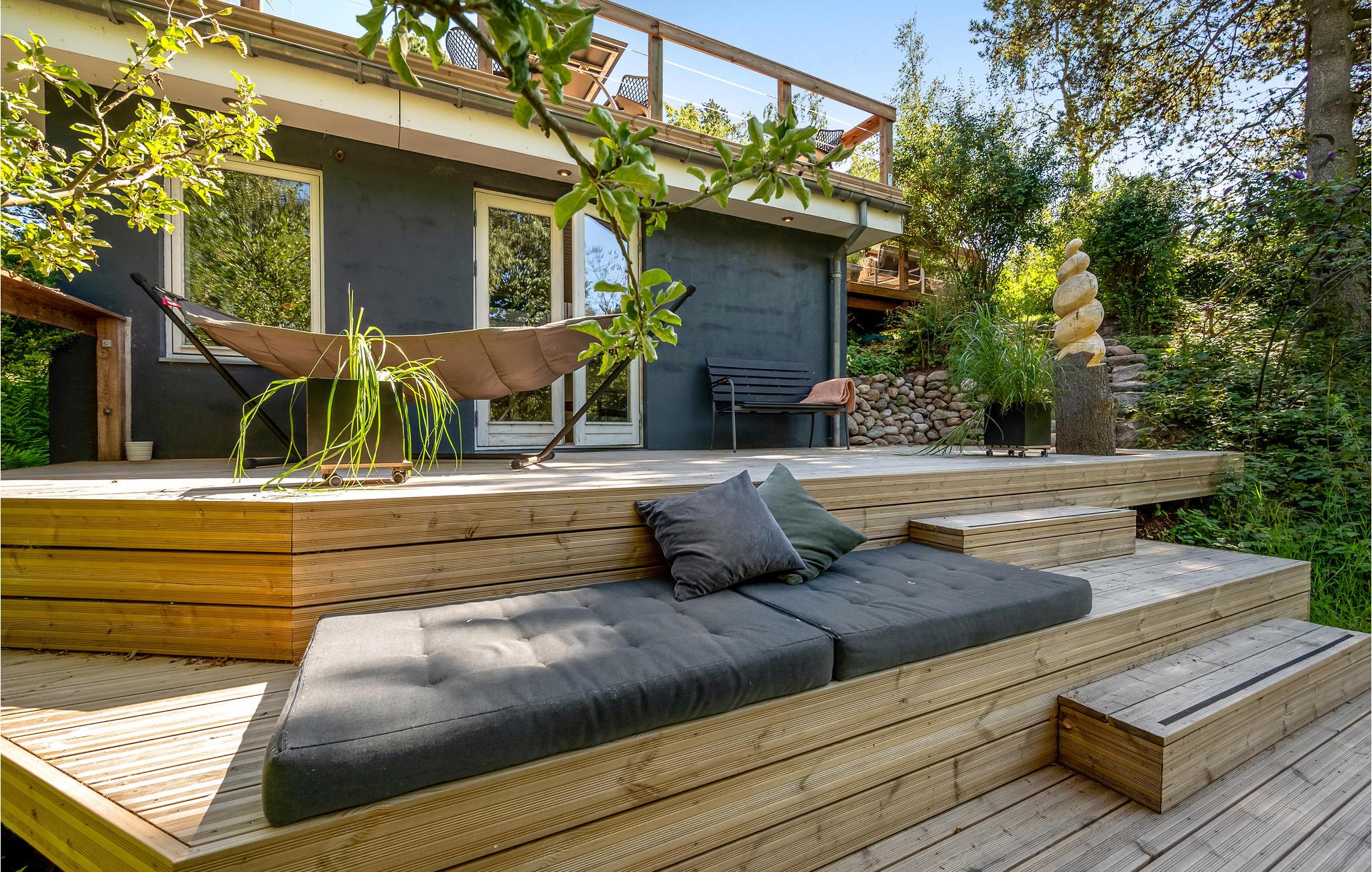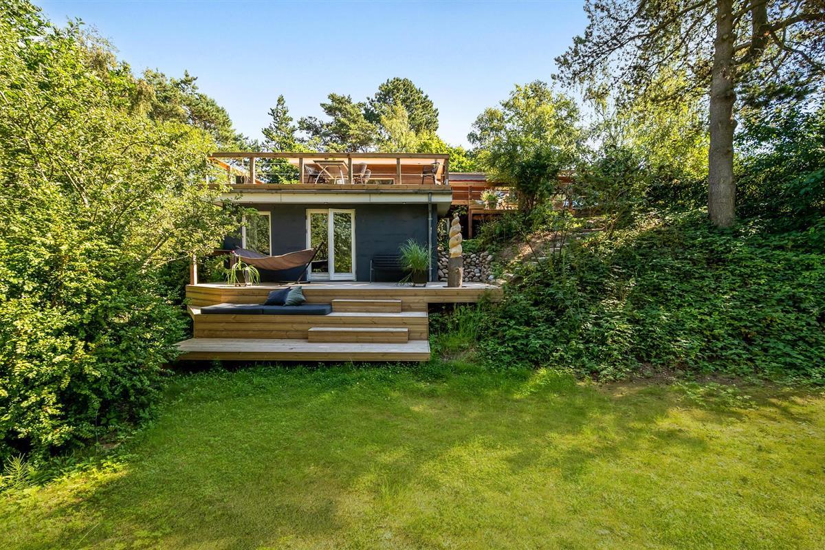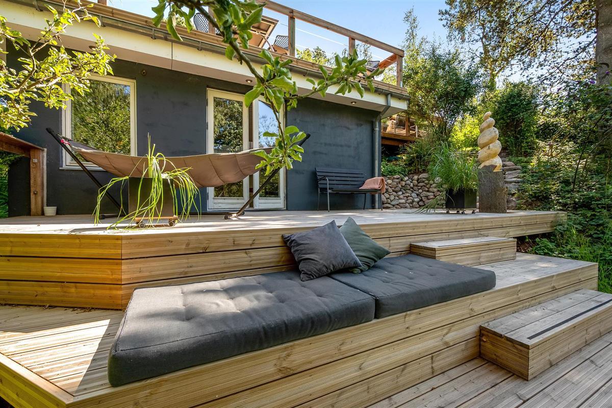 Uniek trapsgewijs vakantiehuis nabij Ebeltoft met stijlvol interieur en zonnige terrassen.